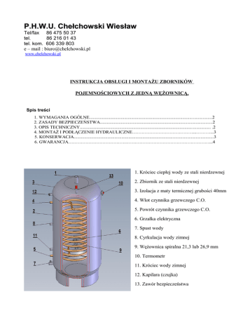 P.H.W.U. Chełchowski Wiesław Tel/fax 86 475 50 37 tel. 86 216 01 43 tel. kom. 606 339 803 e – mail : [email protected] www.chelchowski.pl INSTRUKCJA OBSŁUGI I MONTAŻU ZBORNIKÓW POJEMNOŚCIOWYCH Z JEDNĄ WĘŻOWNICĄ. Spis treści 1. WYMAGANIA OGÓLNE.........................................................................................................2 2. ZASADY BEZPIECZEŃSTWA................................................................................................2 3. OPIS TECHNICZNY................................................................................................................ .2 4. MONTAŻ I PODŁĄCZENIE HYDRAULICZNE…………………………………...………...3 5. KONSERWACJA.......................................................................................................................3 6. GWARANCJA……………………………….………………………………………………...4 1. Króciec ciepłej wody ze stali nierdzewnej 2. Zbiornik ze stali nierdzewnej 3. Izolacja z maty termicznej grubości 40mm 4. Wlot czynnika grzewczego C.O. 5. Powrót czynnika grzewczego C.O. 6. Grzałka elektryczna 7. Spust wody 8. Cyrkulacja wody zimnej 9. Wężownica spiralna 21,3 lub 26,9 mm 10. Termometr 11. Króciec wody zimnej 12. Kapilara (czujka) 13. Zawór bezpieczeństwa 1. WYMAGANIA OGÓLNE: Niniejsza instrukcja montażu i eksploatacji : jest nieodłączną częścią urządzenia i musi być zawsze przechowywana w miejscu jego użytkowania, skierowana jest jedynie do wykwalifikowanego personelu specjalistycznego, zawiera najważniejsze wskazówki w zakresie bezpiecznego montażu, rozruchu i konserwacji urządzenia, musi być przestrzegana przez wszystkie osoby prowadzące prace przy urządzeniu. 2. ZASADY BEZPIECZEŃSTWA - wszelkie prace przy urządzeniu może wykonywać jedynie wykwalifikowany personel. - wykwalifikowany personel stanowią osoby, które są zaznajomione z montażem, uruchamianiem i konserwacją urządzeń zbiornikowych ciśnieniowych oraz posiadają kwalifikacje wymagane do wykonywania tych czynności, jak np.: wykształcenie, przeszkolenie . - do wnętrza zbiornika nie wolna wkręcać elementów hydraulicznych wykonanych z miedzi ( tuleje pomiarowe, grzałki elektryczne miedziane itp. ) 3. OPIS TECHNICZNY Zbiornik ciśnieniowy nierdzewny 1W jest przeznaczony do grzania wody za pośrednictwem : - opcjonalnej grzałki elektrycznej – Króciec Nr. 6 wody grzewczej lub płynu kolektora słonecznego jako medium po stronie pierwotnej króćce wężownicy Nr. 4 i 5. Pojemność zbiornika L 80 100 130 150 200 300 400 500 600 800 1000 1200 1500 2000 Wydajność Średnica Średnica z Wysokość Moc 70 ciepłej wody bez izolacji izolacją całkowita st./45 st. KW 52 st. L/h 380 420 870 7,66 200 420 460 870 7,66 210 380 420 1220 15,3 400 420 460 1220 15,3 410 520 560 1090 26 570 520 600 1580 39 860 620 740 1530 52 1140 620 740 1860 65 1400 720 840 1680 65 1440 850 970 1630 78 1720 850 970 1990 97 2350 850 970 2340 105 2590 1000 1160 2210 115 2830 1000 1160 2840 127 3100 Zbiorniki wykonane są ze stali nierdzewnej produkowanej przez Thyssen Krupp Niemcy i nie wymagają żadnego zabezpieczenia antykorozyjnego. Izolację termiczną płaszcza stanowi pianka poliuretanowa średnio spieniona o grubości 6 cm. Jako wykończenie zastosowano płaszcz z tkaniny SKAY, zasuwany zamkiem błyskawicznym. 4. MONTAŻ I PODŁĄCZENIE HYDRAULICZNE : Ustawienia i uruchomienia może dokonywać tylko specjalistyczna firma instalacyjna. Podgrzewacz należy ustawić w miejscu, gdzie temperatura nie spada poniżej 0ºC. Podgrzewacze są nierdzewne i przeznaczone do normalnej wody pitnej. Dopuszczalna jest instalacja przyłączeniowa dowolna. Podłączenia należy wykonać według wymagań normy EN 806-1 i DIN 4753/1. Wszystkie niewykorzystywane przyłączenia należy zaślepić. Ciśnienia robocze podane na tabliczce znamionowej nie mogą być przekroczone. W razie konieczności należy zainstalować reduktor ciśnienia wody sieciowej. Grzałki elektryczne mogą być instalowane jedynie przez uprawnionych instalatorów. Bezwzględnie należy przestrzegać wymagań IEC 60364 i SEP. Zainstalowana grzałka musi być przeznaczona do zbiornika nierdzewnego. W celu uniknięcia skoków ciśnienia, zminimalizowania uderzeń hydraulicznych w instalacji, oraz otwierania się zaworu bezpieczeństwa, zaleca się montaż odpowiedniego naczynia wzbiorczego z armaturą przepływową, które należy dobrać według odpowiednich norm. Bezwzględnie musi być zamontowany sprężynowy przeponowy zawór bezpieczeństwa. Zawór bezpieczeństwa nie może być zamykany od strony podgrzewacza wody. Ponadto zawór taki musi zadziałać najpóźniej przy dopuszczalnym ciśnieniu roboczym podgrzewacza wody. Minimalna średnica przyłącza zaworu bezpieczeństwa to DN 20. Zawór bezpieczeństwa musi być łatwo dostępny, a jego strona wylotowa skierowana w bezpieczną stronę. Zawór powinien stać pionowo, a wylot nie może być narażony na zamarznięcie. Jeżeli ciśnienie wewnątrz przewodu doprowadzającego zimną wodę do zbiornika przewyższa ciśnienie robocze instalacji, to należy je zmniejszyć co najmniej do wysokości ciśnienia roboczego instalacji poprzez zabudowanie reduktora ciśnienia. W najniższym punkcie przewodu doprowadzającego zimną wodę należy zamontować zawór spustowy, aby umożliwić całkowite opróżnienie zbiornika z wody bez demontażu elementów. Pojemnościowe zbiorniki wody są urządzeniami zaprojektowanymi i wytwarzanymi zgodnie z uznaną praktyką inżynierską i spełniają wymogi Dyrektywy Urządzeń Ciśnieniowych 97/23/WE. Zgodnie z art.3, pkt.3 ( na podstawie tab.4 załącznika II) powyższej Dyrektywy, urządzeniom tego typu nie nadaje się znaku CE. 5. KONSERWACJA : Konserwacja zbiorników wykonanych ze stali nierdzewnej ogranicza się do okresowej kontroli : - zaworu bezpieczeństwa – raz na pół roku - sprawdzeniu stanu na