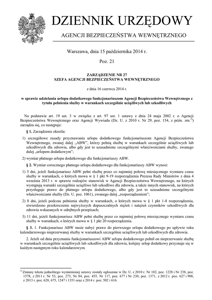 DZIENNIK URZĘDOWY AGENCJI BEZPIECZEŃSTWA WEWNĘTRZNEGO ccccc Warszawa, dnia 15 października 2014 r. Poz. 21 ZARZĄDZENIE NR 27 SZEFA AGENCJI BEZPIECZEŃSTWA WEWNĘTRZNEGO z dnia 16 czerwca 2014 r. w sprawie udzielania urlopu dodatkowego funkcjonariuszom Agencji Bezpieczeństwa Wewnętrznego z tytułu pełnienia służby w warunkach szczególnie uciążliwych lub szkodliwych Na podstawie art. 19 ust. 3 w związku z art. 97 ust. 1 ustawy z dnia 24 maja 2002 r. o Agencji Bezpieczeństwa Wewnętrznego oraz Agencji Wywiadu (Dz. U. z 2010 r. Nr 29, poz. 154, z późn. zm.1)) zarządza się, co następuje: § 1. Zarządzenie określa: 1) szczegółowe zasady przyznawania urlopu dodatkowego funkcjonariuszom Agencji Bezpieczeństwa Wewnętrznego, zwanej dalej „ABW”, którzy pełnią służbę w warunkach szczególnie uciążliwych lub szkodliwych dla zdrowia, albo gdy jest to uzasadnione szczególnymi właściwościami służby, zwanego dalej „urlopem dodatkowym”; 2) wymiar płatnego urlopu dodatkowego dla funkcjonariuszy ABW. § 2. Wymiar corocznego płatnego urlopu dodatkowego dla funkcjonariuszy ABW wynosi: 1) 5 dni, jeżeli funkcjonariusz ABW pełni służbę przez co najmniej połowę miesięcznego wymiaru czasu służby w warunkach, o których mowa w § 1 pkt 9-19 rozporządzenia Prezesa Rady Ministrów z dnia 4 września 2013 r. w sprawie rodzajów stanowisk w Agencji Bezpieczeństwa Wewnętrznego, na których występują warunki szczególnie uciążliwe lub szkodliwe dla zdrowia, a także innych stanowisk, na których przysługuje prawo do płatnego urlopu dodatkowego, albo gdy jest to uzasadnione szczególnymi właściwościami służby (Dz. U. poz. 1061), zwanego dalej „rozporządzeniem”; 2) 8 dni, jeżeli podczas pełnienia służby w warunkach, o których mowa w § 1 pkt 1-8 rozporządzenia, stwierdzono przekroczenie najwyższych dopuszczalnych stężeń i natężeń czynników szkodliwych dla zdrowia wskazanych w odrębnych przepisach; 3) 11 dni, jeżeli funkcjonariusz ABW pełni służbę przez co najmniej połowę miesięcznego wymiaru czasu służby w warunkach, o których mowa w § 1 pkt 20 rozporządzenia. § 3. 1. Funkcjonariusz ABW może nabyć prawo do pierwszego urlopu dodatkowego po upływie roku kalendarzowego nieprzerwanej służby w warunkach szczególnie uciążliwych lub szkodliwych dla zdrowia. 2. Jeżeli od dnia przyznania funkcjonariuszowi ABW urlopu dodatkowego pełnił on nieprzerwanie służbę w warunkach szczególnie uciążliwych lub szkodliwych dla zdrowia, kolejny urlop dodatkowy przyznaje się w każdym następnym roku kalendarzowym. 1) Zmiany tekstu jednolitego wymienionej ustawy zostały ogłoszone w Dz. U. z 2010 r. Nr 182, poz. 1228 i Nr 238, poz. 1578, z 2011 r. Nr 53, poz. 273, Nr 84, poz. 455, Nr 117, poz. 677 i Nr 230, poz. 1371, z 2012 r. poz. 627 i 908, z 2013 r. poz. 628, 675, 1247 i 1351 oraz z 2014 r. poz. 502 i 616. -2Dziennik Urzędowy Agencji Bezpieczeństwa Wewnętrznego Poz. 21 3. Przerwy w pełnieniu służby w warunkach szczególnie uciążliwych lub szkodliwych dla zdrowia, w szczególności z powodu choroby, urlopu czy wynikające z potrzeb służby, trwające łącznie nie dłużej niż 90 dni w ciągu roku kalendarzowego, są wliczane do okresu, o którym mowa w ust. 1 i 2. § 4. 1. Oceny występowania warunków, o których mowa w § 1 rozporządzenia, na stanowiskach służbowych dokonuje komisja powołana przez kierownika jednostki organizacyjnej ABW z udziałem przedstawiciela służby bezpieczeństwa i higieny służby. 2. Warunki, o których mowa w § 1 pkt 1-8 rozporządzenia, uważa się za spełnione, jeżeli przekroczenie najwyższych dopuszczalnych stężeń i natężeń czynników szkodliwych dla zdrowia stwierdzono podczas badań i pomiarów przeprowadzonych w jednostce organizacyjnej ABW. 3. Komisja, o której mowa w ust. 1, może występować do właściwych jednostek organizacyjnych ABW o udzielenie niezbędnej pomocy, w szczególności o przeprowadzenie stosownych badań i pomiarów, o których mowa w ust. 2. 4. Na podstawie oceny, o której mowa w ust. 1, w opisie stanowiska służbowego zamieszcza się informację o występowaniu warunków, o których mowa w § 1 rozporządzenia. § 5. 1. Funkcjonariuszowi ABW pełniącemu służbę na stanowisku, na którym występują warunki szczególnie uciążliwe lub szkodliwe dla zdrowia, uprawniające do uzyskania urlopu dodatkowego w różnym wymiarze, przysługuje jeden urlop w wymiarze korzystniejszym. 2. Urlop dodatkowy może być dzielony na części. 3. Do niewykorzystanego urlopu dodatkowego w danym roku kalendarzowym stosuje się odpowiednio przepisy art. 96 ust. 4 ustawy z dnia 24 maja 2002 r. o Agencji Bezpieczeństwa Wewnętrznego oraz Agencji Wywiadu. § 6. Zarządzenie wchodzi w życie z dniem podpisania. Szef Agencji Bezpieczeństwa Wewnętrznego płk Dariusz ŁUCZAK