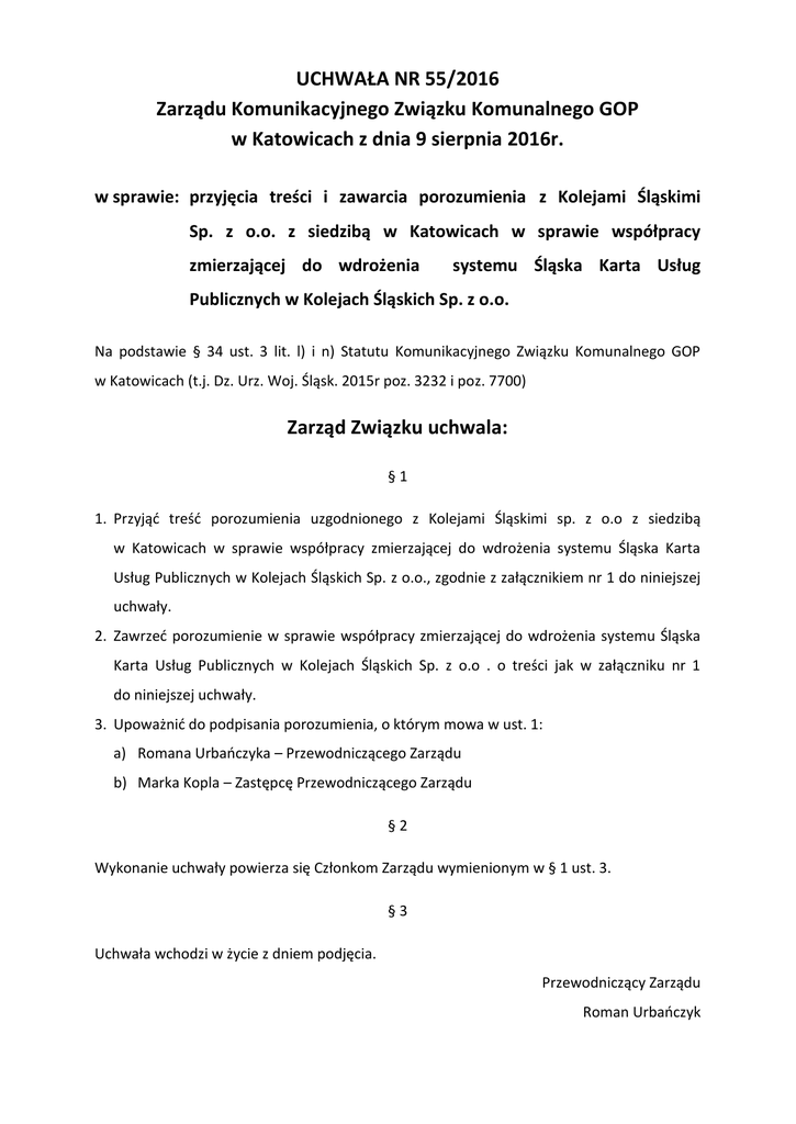 UCHWAŁA NR 55/2016 Zarządu Komunikacyjnego Związku Komunalnego GOP w Katowicach z dnia 9 sierpnia 2016r. w sprawie: przyjęcia treści i zawarcia porozumienia z Kolejami Śląskimi Sp. z o.o. z siedzibą w Katowicach w sprawie współpracy zmierzającej do wdrożenia systemu Śląska Karta Usług Publicznych w Kolejach Śląskich Sp. z o.o. Na podstawie § 34 ust. 3 lit. l) i n) Statutu Komunikacyjnego Związku Komunalnego GOP w Katowicach (t.j. Dz. Urz. Woj. Śląsk. 2015r poz. 3232 i poz. 7700) Zarząd Związku uchwala: §1 1. Przyjąć treść porozumienia uzgodnionego z Kolejami Śląskimi sp. z o.o z siedzibą w Katowicach w sprawie współpracy zmierzającej do wdrożenia systemu Śląska Karta Usług Publicznych w Kolejach Śląskich Sp. z o.o., zgodnie z załącznikiem nr 1 do niniejszej uchwały. 2. Zawrzeć porozumienie w sprawie współpracy zmierzającej do wdrożenia systemu Śląska Karta Usług Publicznych w Kolejach Śląskich Sp. z o.o . o treści jak w załączniku nr 1 do niniejszej uchwały. 3. Upoważnić do podpisania porozumienia, o którym mowa w ust. 1: a) Romana Urbańczyka – Przewodniczącego Zarządu b) Marka Kopla – Zastępcę Przewodniczącego Zarządu §2 Wykonanie uchwały powierza się Członkom Zarządu wymienionym w § 1 ust. 3. §3 Uchwała wchodzi w życie z dniem podjęcia. Przewodniczący Zarządu Roman Urbańczyk Załącznik nr 1 do Uchwały NR 55/2016 Zarządu Komunikacyjnego Związku Komunalnego GOP w Katowicach z dnia 9 sierpnia 2016r. POROZUMIENIE Nr …../….. (…../…../…../…../…..) z dnia ....................... r. w sprawie współpracy zmierzającej do wdrożenia systemu Śląska Karta Usług Publicznych w Kolejach Śląskich Sp. z o.o. zawarte pomiędzy: Komunikacyjnym Związkiem Komunalnym Górnośląskiego Okręgu Przemysłowego w Katowicach, ul. Barbary 21 a, zwanym dalej KZK GOP, reprezentowanym przez: - ……………………………………………………, - …………………………………………………..., a Kolejami Śląskimi Sp. z o.o. w Katowicach, ul. Wita Stwosza 7, zwanymi dalej Koleje Śląskie, reprezentowanymi przez: - ……………………………………………………, - ……………………………………………………, zwanymi dalej Stronami. Mając na uwadze zrównoważony i trwały rozwój Województwa Śląskiego, w tym Aglomeracji Górnośląskiej, KZK GOP oraz Koleje Śląskie wyrażają wolę podjęcia działań zmierzających do rozszerzenia systemu ŚKUP o kolejną instytucję publiczną Subregionu Centralnego, w celu poprawy warunków życia mieszkańców. Celem Stron jest zapewnienie powszechnego dostępu do zintegrowanych usług transportu publicznego, świadczonych przy wykorzystaniu nowoczesnych i zaawansowanych technologicznie rozwiązań informatycznych, umożliwiających integrację systemów biletowo – taryfowych obu podmiotów. §1 1. System ŚKUP jest wynikiem wdrożonego przez KZK GOP projektu współfinansowanego ze środków RPO WSL 2007-2013, Priorytet II Społeczeństwo Informacyjne Działanie 2.2 Rozwój elektronicznych usług publicznych, w ramach Programu Rozwoju Subregionu Centralnego. Jest systemem otwartym, umożliwiającym włączanie do niego nowych podmiotów. 2. Przedmiotem Porozumienia jest dwustronna deklaracja podjęcia współpracy, mającej na celu wdrożenie przez Koleje Śląskie systemu Śląskiej Karty Usług Publicznych w komunikacji organizowanej przez Koleje Śląskie. 3. Głównym celem wdrożenia systemu ŚKUP w Kolejach Śląskich jest usprawnienie komunikacji publicznej w zakresach działania Stron, m.in. poprzez zaoferowanie pasażerom zintegrowanego rozwiązania informatycznego funkcjonującego w komunikacji organizowanej przez KZK GOP i Koleje Śląskie i umożliwiającego integrację systemów biletowo – taryfowych Stron. §2 1. KZK GOP przekaże materiały dotyczące warunków i sposobu wdrożenia ŚKUP, będące w jego dyspozycji oraz otrzymane od Wykonawcy systemu ŚKUP. Materiały zostaną przekazane na pisemny wniosek Kolei Śląskich. 2. W szczególności KZK GOP przekaże informacje o: - warunkach technicznych, jakim powinny odpowiadać urządzenia stanowiące infrastrukturę sprzętowo-sieciową, będącą własnością Kolei Śląskich; - szacunkowe wartości opłat przyłączeniowych, stanowiących równowartość kosztów adaptacyjnych istniejącego systemu na potrzeby Kolei Śląskich; - szacunkowe wysokości opłat eksploatacyjnych za korzystanie z infrastruktury sieciowo-sprzętowej, nie będącej własnością Kolei Śląskich, a niezbędnej dla właściwego funkcjonowania systemu. 3. KZK GOP przekaże materiały w formie, w jakiej je przechowuje lub w formie i treści, w jakiej otrzyma je od Wykonawcy Systemu ŚKUP. 4. Każda ze Stron porozumienia pokrywa własne koszty wynikające z jego treści. §3 1. Koleje Śląskie prowadzą działania zmierzające do przygotowania dokumentacji aplikacyjnej w celu uzyskania dofinansowania na rozszerzenie systemu ŚKUP ze środków Europejskiego Funduszu Rozwoju Regionalnego w ramach Regionalnego Programu Operacyjnego Województwa Śląskiego na lata 2014-2020. 2. Dokumentacja aplikacyjna projektu rozszerzającego system ŚKUP będzie uwzględniać warunki przyłączenia przekazane przez KZK GOP. 3. Koleje Śląskie będą wdrażać system ŚKUP w sposób uwzględniający przekazane przez KZK GOP lub Wykonawcę systemu ŚKUP warunki techniczne. §4 Szczegółowe warunki przyłączenia do systemu ŚKUP Strony uregulują w odrębnej umowie. §5 Porozumienie obowiązuje od daty jego podpisania przez Strony i zawarte jest na czas nieokreślony. §6 Porozumienie ma charakter deklaracji intencji Stron i nie rodzi skutków zobowiązaniowych wynikających z prawa cywilnego. §7 Wszelkie zmiany niniejszego porozumienia wymagają formy pisemnej pod rygorem nieważności. §8 Porozumienie zostało sporządzone w 4 egzemplarzach, po dwa egzemplarze dla każdej ze S