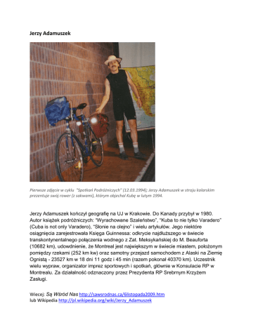 Jerzy Adamuszek Pierwsze zdjęcie w cyklu "Spotkao Podróżniczych" (12.03.1994); Jerzy Adamuszek w stroju kolarskim prezentuje swój rower (z sakwami), którym objechal Kubę w lutym 1994. Jerzy Adamuszek kończył geografię na UJ w Krakowie. Do Kanady przybył w 1980. Autor książek podróżniczych: “Wyrachowane Szaleństwo”, “Kuba to nie tylko Varadero” (Cuba is not only Varadero), “Słonie na olejno” i wielu artykułów. Jego niektóre osiągnięcia zarejestrowała Księga Guinnessa: odkrycie najdłuższego w świecie transkontynentalnego połączenia wodnego z Zat. Meksykańskiej do M. Beauforta (10682 km), udowdnienie, że Montreal jest największym w świecie miastem, położonym pomiędzy rzekami (252 km kw) oraz samotny przejazd samochodem z Alaski na Ziemię Ognistą - 23527 km w 18 dni 11 godz i 45 min (razem pokonał 40370 km). Uczestnik wielu wypraw, organizator imprez sportowych i spotkań, głównie w Konsulacie RP w Montrealu. Za działalność odznaczony przez Prezydenta RP Srebrnym Krzyżem Zasługi. Wiecej: Są Wśród Nas http://sawsrodnas.ca/6listopada2009.htm lub Wikipedia http://pl.wikipedia.org/wiki/Jerzy_Adamuszek