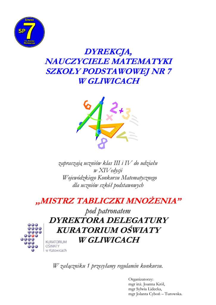 DYREKCJA, NAUCZYCIELE MATEMATYKI SZKOŁY PODSTAWOWEJ NR 7 W GLIWICACH zapraszają uczniów klas III i IV do udziału w XIVedycji Wojewódzkiego Konkursu Matematycznego dla uczniów szkół podstawowych ,,MISTRZ TABLICZKI MNOŻENIA” pod patronatem DYREKTORA DELEGATURY KURATORIUM OŚWIATY W GLIWICACH W załączniku 1 przesyłamy regulamin konkursu. Organizatorzy: mgr inż. Joanna Król, mgr Sylwia Lidecka, mgr Jolanta Cyboń – Turowska. Załącznik 1 WOJEWÓDZKI KONKURS MATEMATYCZNY DLA UCZNIÓW SZKÓŁ PODSTAWOWYCH WOJEWÓDZTWA ŚLĄSKIEGO ,,MISTRZ TABLICZKI MNOŻENIA” pod patronatem DYREKTORA KURATORIUM OŚWIATY W GLIWICACH XIV edycja Regulamin konkursu. 1. Cele konkursu: Popularyzowanie zabaw tabliczką mnożenia wśród dzieci; Rozwijanie zainteresowań matematycznych uczniów; Inspirowanie uczniów do odkrywania i rozwiązywania problemów matematycznych; Kształcenie umiejętności zastosowania prostych rachunków pamięciowych do rozwiązywania ciekawych, nietypowych zadań matematycznych. 2. Warunki organizacyjne: Konkurs przeprowadzany będzie w grupach wiekowych dla klas III i dla klas IV; Udział w konkursie jest równoznaczny z wyrażeniem zgody uczestników na publikację nazwisk i wizerunku laureatów i uczestników konkursu; Konkurs będzie dwuetapowy: I etap - szkolny: przeprowadzają nauczyciele w szkołach, w dowolnie wybranym przez siebie terminie; zgłoszenia SZKOLNEGO MISTRZA klas III (jedna osoba!) oraz SZKOLNEGO MISTRZA klas IV (jedna osoba!) wraz z imieniem i nazwiskiem nauczyciela przygotowującego (załącznik 2), należy przesłać listownie, faxem lub mailem do 10 marca 2017 r. do Szkoły Podstawowej nr 7 w Gliwicach, Adres: Szkoła Podstawowa nr 7 ul. Tarnogórska 59 44-100 Gliwice Tel/fax: 32 231-07-14, e - mail: [email protected]. II etap - wojewódzki: uczestniczą zwycięzcy z I etapu, odbędzie się 21 marca 2017 r. o godz. 1300 w audytorium Górnośląskiego Centrum Edukacyjnego w Gliwicach, ul. Okrzei 20. Prosimy aby uczestnicy konkursu przynieśli: klej, kredki, długopis. 3. Organizatorzy: Etap I przeprowadzają nauczyciele matematyki w szkołach podstawowych; Etap II przygotowują nauczyciele SP 7: mgr inż. Joanna Król, mgr Sylwia Lidecka, mgr Jolanta Cyboń - Turowska; W skład jury wchodzą nauczyciele matematyki SP nr 7. 4. Kategorie: Zadania konkursowe dotyczyć będą zastosowania tabliczki mnożenia do ciekawych zadań, ułożenia domina matematycznego oraz innych zadań nietypowych i problemowych. Inne zadania otrzymają uczniowie z klas III i inne z klas IV. 5. Nagrody: Uczniowie, którzy zdobędą tytuł mistrza klas III oraz tytuł mistrza klas IV uhonorowani zostaną nagrodami rzeczowymi i dyplomami. Dyplomy planowane są również dla wszystkich uczestników II etapu konkursu oraz dla nauczycieli przygotowujących uczniów. O rozdaniu nagród oraz wynikach konkursu poinformujemy w ciągu 3 tygodni na stronie internetowej szkoły: http://www.sp7gliwice.pl 6. Uwagi końcowe: Organizatorzy zastrzegają sobie prawo zatrzymania prac uczniowskich i wykorzystania ich w popularyzacji idei konkursu. ZGŁOSZENIE UCZNIÓW * Załącznik 2 do XIV edycji wojewódzkiego konkursu matematycznego dla klas III i IV MISTRZ TABLICZKI MNOŻENIA (termin zgłaszania do 10 marca 2017 r.) Zgłoszenie jest równoznaczne z zapoznaniem się uczniów i ich rodziców z regulaminem konkursu i wyrażeniem zgody na udział w konkursie, publikację nazwisk i wizerunku uczestników na stronie internetowej organizatora http://www.sp7gliwice.pl Powyższe potwierdza opiekun swoim podpisem. Szkoła: ………………………………………….…… w: …………………………. LP. NAZWISKO I IMIĘ UCZNIA KLASA 1 III 2 IV NAZWISKO I IMIĘ OPIEKUNA )PROSZĘ WYPEŁNIĆ CZARNYM DŁUGOPISEM ORAZ DRUKOWANYMI LITERAMI * …………………………………………………. podpis zgłaszającego …………………………………………………… pieczątka szkoły