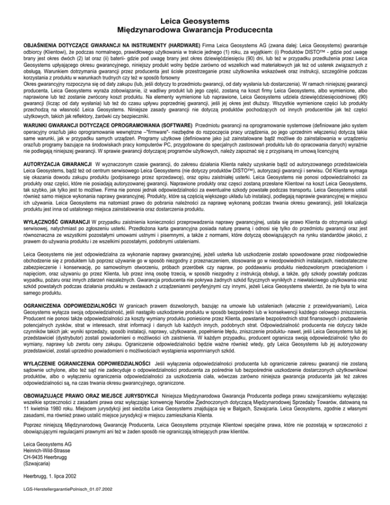 Leica Geosystems Międzynarodowa Gwarancja Producecnta OBJAŚNIENIA DOTYCZĄCE GWARANCJI NA INSTRUMENTY (HARDWARE) Firma Leica Geosystems AG (zwana dalej: Leica Geosystems) gwarantuje odbiorcy (Klientowi), że podczas normalnego, prawidłowego użytkowania w trakcie jednego (1) roku, za wyjątkiem: (i) Produktów DISTO - gdzie pod uwagę brany jest okres dwóch (2) lat oraz (ii) baterii- gdzie pod uwagę brany jest okres dziewięćdziesięciu (90) dni, lub też w przypadku przedłużenia przez Leica Geosystems upłyającego okresu gwarancyjnego, niniejszy produkt wolny będzie zarówno od wszelkich wad materiałowych jak też od usterek związaznych z obsługą. Warunkiem dotrzymania gwarancji przez producenta jest ścisłe przestrzeganie przez użytkownika wskazówek oraz instrukcji, szczególnie podczas korzystania z produktu w warunkach trudnych czy też w sposób forsowny Okres gwarancyjny rozpoczyna się od daty zakupu (lub, jeśli dotyczy to przedmiotu gwarancji, od daty wysłania lub dostarczenia). W ramach niniejszej gwarancji producenta, Leica Geosystems wyraża zobowiązanie, iż wadliwy produkt lub jego część, zostaną na koszt firmy Leica Geosystems, albo wymienione, albo naprawione lub też zostanie zwrócony koszt produktu. Na elementy wymienione lub naprawione, Leica Geosystems udziela dziewięćdziesięciodniowej (90) gwarancji (licząc od daty wysłania) lub też do czasu upływu poprzedniej gwarancji, jeśli jej okres jest dłuższy. Wszystkie wymienione części lub produkty przechodzą na własność Leica Geosystems. Niniejsze zasady gwarancji nie dotyczą produktów pochodzących od innych producentów jak też części użytkowych, takich jak reflektory, żarówki czy bezpieczniki. WARUNKI GWARANCJI DOTYCZĄCE OPROGRAMOWANIA (SOFTWARE) Przedmiotu gwarancji na oprogramowanie systemowe (definiowane jako system operacyjny oraz/lub jako oprogramowanie wewnętrzne –"firmware"- niezbędne do rozpoczęcia pracy urządzenia, po jego uprzednim włączeniu) dotyczą takie same warunki, jak w przypadku samych urządzeń. Programy użytkowe (definiowane jako już zainstalowane bądź możliwe do zainstalowania w urządzeniu oraz/lub programy bazujące na środowiskach pracy komputerów PC, przygotowane do specjalnych zastosowań produktu lub do opracowania danych) wyraźnie nie podlegają niniejszej gwarancji. W sprawie gwarancji dotyczącej programów użytkowych, należy zapoznać się z przypisaną im umową licencyjną AUTORYZACJA GWARANCJI W wyznaczonym czasie gwarancji, do zakresu działania Klienta należy uzyskanie bądź od autoryzowanego przedstawiciela Leica Geosystems, bądź też od centrum serwisowego Leica Geosystems (nie dotyczy produktów DISTO), autoryzacji gwarancji i serwisu. Od Klienta wymaga się okazania dowodu zakupu produktu (podpisanego przez sprzedawcę), oraz opisu zaistniałej usterki. Leica Geosystems nie ponosi odpowiedzialności za produkty oraz części, które nie posiadają autoryzowanej gwarancji. Naprawione produkty oraz częsci zostaną przesłane Klientowi na koszt Leica Geosystems, tak szybko, jak tylko jest to możliwe. Firma nie ponosi jednak odpowiedzialności za ewentualne szkody powstałe podczas transportu. Leica Geosystems ustali również samo miejsce wykonania naprawy gwarancyjnej. Produkty, które są częścią większego układu lub instalacji, podlegają naprawie gwarancyjnej w miejscu ich używania. Leica Geosystems ma natomiast prawo do pobrania należności za naprawę wykonaną podczas trwania okresu gewarancji, jeśli lokalizacja produktu jest inna od ustalonego miejsca zainstalowania oraz dostarczenia produktu. WYŁĄCZNOŚĆ GWARANCJI W przypadku zaistnienia konieczności przeprowadzenia naprawy gwarancyjnej, ustala się prawo Klienta do otrzymania usługi serwisowej, natychmiast po zgłoszeniu usterki. Przedłożona karta gwarancyjna posiada naturę prawną i odnosi się tylko do przedmiotu gwarancji oraz jest równoznaczna ze wszystkimi pozostałymi umowami ustnymi i pisemnymi, a także z normami, które dotyczą obowiązujących na rynku standardów jakości, z prawem do używania produktu i ze wszelkimi pozostałymi, podobnymi ustaleniami. Leica Geosystems nie jest odpowiedzialna za wykonanie naprawy gwarancyjnej, jeżeli usterka lub uszkodzenie zostało spowodowane przez niodpowiednie obchodzenie się z produktem lub poprzez używanie go w sposób niezgodny z przeznaczeniem, stosowanie go w nieodpowiednich instalacjach, niedostateczne zabezpieczenie i konserwację, po samowolnym otworzeniu, próbach przeróbek czy napraw, po poddawaniu produktu niedozwolonym przeciążeniom i napięciom, oraz używaniu go przez Klienta, lub przez inną osobę trzecią, w sposób niezgodny z instrukcją obsługi, a także, gdy szkody powstały podczas wypadku, pożaru oraz innych zdarzeń niezależnych. Gwarancja producenta nie pokrywa żadnych szkód fizycznych wynikłych z niewłaściwego użytkowania oraz szkód powstałych podczas działania produktu w zestawach z urządzenianmi peryferyjnymi czy innymi, jeżeli Leica Geosystems stwierdzi, że nie była to wina samego produktu. OGRANICZENIA ODPOWIEDZIALNOŚCI W granicach prawem dozwolonych, bazując na umowie lub ustaleniach (włacznie z przewidywaniami), Leica Geosystems wyłącza swoją odpowiedzialność, jeśli nastąpiło uszkodzenie produktu w sposób bezpośredni lub w konsekwencji każdego celowego zniszczenia. Producent nie ponosi także odpowiedzialności za koszty wymiany produktu poniesione przez Klienta, powstanie bezpośrednich strat finansowych i pozbawienie potencjalnych zysków, strat w interesach, strat informacji i danych lub każdych innych, podobnych strat. Odpowiedzialność producenta nie dotyczy także czynników takich jak: wyniki sprzedaży, sposób instalacji, naprawy, użytkowanie, popełnienie błędu, zniszczenie produktu- nawet, jeśli Leica Geosystems lub jej przedstawiciel (dystrybutor) zostali powiadomieni o możliwości ich zaistnienia. 