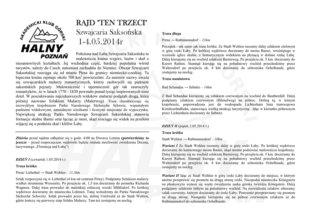 RAJD "TEN TRZECI" Szwajcaria Saksońska 1-4.05.2014r Położona nad Łabą Szwajcaria Saksońska to malownicza kraina wzgórz, lasów i skał o niesamowitych kształtach. Jej wschodnia część, bardziej popularna wśród turystów, należy do Czech, natomiast zachodnia do Niemiec. Obszar Szwajcarii Saksońskiej rozciąga się od miasta Pirna do granicy niemiecko-czeskiej. Ta bajeczna kraina zajmuje około 700 km2 powierzchni. Za autorów nazwy uważa się szwajcarskich malarzy romantycznych, którzy zachwycili się pięknem saksońskich pejzaży. Malowniczość i tajemniczość gór tak zauroczyły romantyków, że w latach 1770 - 1830 powstało ponad tysiąc inspirowanych nimi dzieł. W poszukiwaniu najciekawszych widoków malarze podążali drogą, którą później nazwano Szlakiem Malarzy (Malerweg). Trasa charakteryzuje się niezwykłym krajobrazem Parku Narodowego Sächsische Schweiz, wspaniałymi punktami widokowymi, naturalnymi ścieżkami i licznymi miejscami do wypoczynku. Największą atrakcję Parku Narodowego Szwajcarii Saksońskiej stanowią formacje skalne Bastei oraz łącząc je most, skąd rozciąga się widok na przełom wijącej się u podnóża skał i klifów Łaby. Trasa długa Pirna → Rathmannsdorf – 21km Początek - tak samo jak trasa krótka. Ze Stadt Wehlen ruszamy dalej szlakiem zielonym w górę rzeki Łaby. Po krótkiej wędrówce docieramy do mostu Bastei, wrośniętego w wyniosłe iglice skalne, z fantastycznym widokiem na płynącą w dolinie rzekę Łabę. Dalej kierujemy się na wschód szlakiem Basteiweg. Po przejściu ok. 5 km. docieramy do Kurort Rathen. Stamtąd kierując się na południowy wschód przechodzimy przez Waltersdorf po przejściu ok. 4 km docieramy do schroniska Ochelbaude, gdzie zostajemy na nocleg. Trasa namiotowa Bad Schandau → Sebnitz – 14km Z Bad Schandau kierujemy się szlakiem czerwonym na wschód do Bauthenfall. Dalej podążamy szlakiem czerwonym (Hörnelweg) na północ. Doliną tą, w leśnym krajobrazie, poprowadzona jest do wodospadu Lichtenhain linia tramwajowa Kirnitzschtalbahn, stanowiąca wielką atrakcję turystyczną. Idąc w kierunku północnym przez Lichtenhain docieramy do Sebnitz. DZIEŃ II (piątek 2.05.2014 r.) Trasa krótka Zbiórka przed rajdem odbędzie się o godz. 4:00 na Dworcu Letnim (potwierdzimy to jeszcze – przed rozpoczęciem wędrówki będzie istniała możliwość zwiedzenia Drezna, nazywanego „Florencją nad Łabą”) DZIEŃ I (czwartek 1.05.2014 r.) Trasa krótka Pirna/ Liebethal → Stadt Wehlen – 11,5km Szlak rozpoczyna się w Liebethal (4 km od centrum Pirny). Podążamy Szlakiem malarzy wzdłuż strumienia Wessenitz. Po przejściu ok. 1,5 km docieramy do pomnika Richarda Wagnera. Dalej trasa prowadzi do maleńkiej rolniczej wioski Mühlsdorf. Po krótkiej wędrówce docieramy do miasteczka Lohmen. Tutaj wchodzimy do Parku Narodowego Sächsiche Schweitz. Szlak prowadzi przez las, dolinę Uttelwald aż do Stadt Wehlen, gdzie kończy się pierwszy etap Szlaku Malarzy. Tam też zostajemy na nocleg. Stadt Wehlen → Rathmannsdorf – 10km Wariant I Ze Stadt Wehlen ruszamy dalej w górę rzeki Łaby. Po krótkiej wędrówce docieramy do kamiennego mostu Bastei, skąd można podziwiać malownicze krajobrazy. Dalej kierujemy się na wschód szlakiem Basteiweg. Po przejściu ok. 5 km. docieramy do Kurort Rathen. Stamtąd kierując się na południowy wschód przechodzimy przez Waltersdorf po przejściu ok. 4 km docieramy do schroniska Ochelbaude, gdzie zostajemy na nocleg. Wariant II Idąc ze Stadt Wehlen w górę rzeki Łaby docieramy do miejsca, w którym można przeprawić się promem na drugą stronę rzeki. Nieopodal miasteczka Königstein na płaskowyżu wznosi się warta zwiedzenia saska górska twierdza Königstein. Dalej podążamy szlakiem żółtym na południowy wschód. Na rozwidleniu szlaków obieramy szlak czerwony, którym docieramy do rzeki Łaby. Ponownie przeprawiamy się promem na drugą stronę. Następnie kierujemy się na północ czerwonym szlakiem aż do Rathmannsdorf do schroniska Ochelbaude. Trasa długa Trasa namiotowa Rathmannsdorf → Kirnitzschtal/OT Ottendorf – 16km Hohnstein → Bahra – 20km Ze schroniska Ochelbaude wyruszamy niebieskim szlakiem na wschód do Kohlmüle. Tam odbijamy w prawo i kierujemy się na południe. Następnie przecinamy Hohe Straße i skręcamy w lewo na szlak czerwony, którym docieramy do Altendorf. Dalej szlakiem Sebnitztalweg docieramy do Amtshainersdorf, gdzie skręcamy na szlak żółty. Na rozwidleniu szlaków skręcamy w Ottendorfer Steig (szlak zielony), którym docieramy do Ottendorfer Hütte. Trasa namiotowa Sebnitz → Hohnstein – 14km Z Sebnitz kierujemy się na południowy-wschód szlakiem niebieskim. W Saupsdorf zmieniamy szlak na żółty i podążamy w kierunku zachodnim do Neumannmühle. Tam skręcamy na szlak czerwony, którym idziemy aż do Altendorf. Dalej podążając szlakiem żółtym docieramy do Hohnstein. Wieś powoli wynurza się spośród drzew otaczających wzgórze. Zaskakuje ciszą, spokojem, uroczymi wąskimi uliczkami biegnącymi na różnych poziomach. Stoją przy nich kolorowe domki i swojskie cukierenki, gdzie można zjeść domowe ciasto i odpocząć po trudach wędrówek. Z Hohnstein kierujemy się na południe szlakiem zielonym. Mijamy jezioro Amselsee. Zobaczymy kamienny most Bastei. Można stamtąd zejść po 700 kamiennych schodach do efektownej rozpadliny Schwedenlöcher (Dziury szwedzkie). Docieramy do Niederrathen, gdzie przeprawiamy się promem na drugą stronę rzeki Łaby. Dalej idziemy szlakiem czerwonym. Na rozwidleniu szlaków zmieniamy szlak na żółty, którym podążamy brzegiem Łaby (Elberadweg). Dalsza wędrówka wiedzie szlakiem niebieskim na południe. Przechodzimy przez Reichstein i Rosenthal-Bielatal. Za Brausenstein skręcamy na szlak żółty a następnie zielony, którym dotrzemy na Metę do Herberge Bahra. META HERBERGE BAHRA TRASA SPECJALNA Trasa specjalna