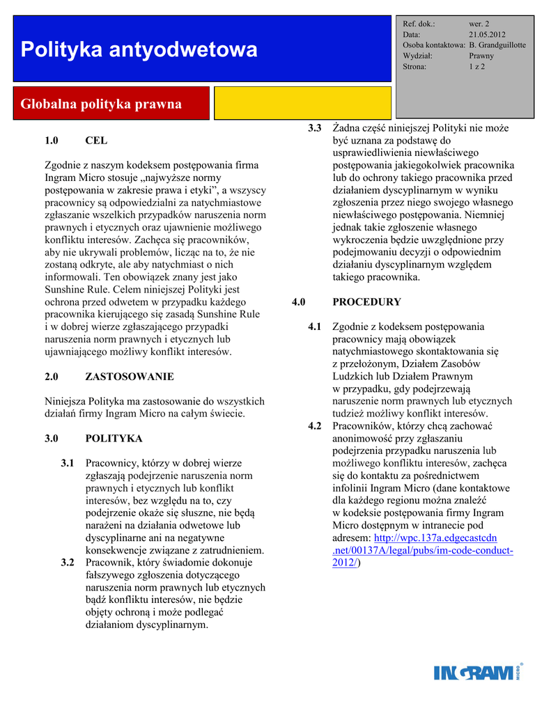 Ref. dok.: Data: Osoba kontaktowa: Wydział: Strona: Polityka antyodwetowa wer. 2 21.05.2012 B. Grandguillotte Prawny 1z2 Globalna polityka prawna 3.3 1.0 CEL Zgodnie z naszym kodeksem postępowania firma Ingram Micro stosuje „najwyższe normy postępowania w zakresie prawa i etyki”, a wszyscy pracownicy są odpowiedzialni za natychmiastowe zgłaszanie wszelkich przypadków naruszenia norm prawnych i etycznych oraz ujawnienie możliwego konfliktu interesów. Zachęca się pracowników, aby nie ukrywali problemów, licząc na to, że nie zostaną odkryte, ale aby natychmiast o nich informowali. Ten obowiązek znany jest jako Sunshine Rule. Celem niniejszej Polityki jest ochrona przed odwetem w przypadku każdego pracownika kierującego się zasadą Sunshine Rule i w dobrej wierze zgłaszającego przypadki naruszenia norm prawnych i etycznych lub ujawniającego możliwy konflikt interesów. 2.0 ZASTOSOWANIE Niniejsza Polityka ma zastosowanie do wszystkich działań firmy Ingram Micro na całym świecie. 3.0 POLITYKA 3.1 3.2 Pracownicy, którzy w dobrej wierze zgłaszają podejrzenie naruszenia norm prawnych i etycznych lub konflikt interesów, bez względu na to, czy podejrzenie okaże się słuszne, nie będą narażeni na działania odwetowe lub dyscyplinarne ani na negatywne konsekwencje związane z zatrudnieniem. Pracownik, który świadomie dokonuje fałszywego zgłoszenia dotyczącego naruszenia norm prawnych lub etycznych bądź konfliktu interesów, nie będzie objęty ochroną i może podlegać działaniom dyscyplinarnym. 4.0 Żadna część niniejszej Polityki nie może być uznana za podstawę do usprawiedliwienia niewłaściwego postępowania jakiegokolwiek pracownika lub do ochrony takiego pracownika przed działaniem dyscyplinarnym w wyniku zgłoszenia przez niego swojego własnego niewłaściwego postępowania. Niemniej jednak takie zgłoszenie własnego wykroczenia będzie uwzględnione przy podejmowaniu decyzji o odpowiednim działaniu dyscyplinarnym względem takiego pracownika. PROCEDURY Zgodnie z kodeksem postępowania pracownicy mają obowiązek natychmiastowego skontaktowania się z przełożonym, Działem Zasobów Ludzkich lub Działem Prawnym w przypadku, gdy podejrzewają naruszenie norm prawnych lub etycznych tudzież możliwy konflikt interesów. 4.2 Pracowników, którzy chcą zachować anonimowość przy zgłaszaniu podejrzenia przypadku naruszenia lub możliwego konfliktu interesów, zachęca się do kontaktu za pośrednictwem infolinii Ingram Micro (dane kontaktowe dla każdego regionu można znaleźć w kodeksie postępowania firmy Ingram Micro dostępnym w intranecie pod adresem: http://wpc.137a.edgecastcdn .net/00137A/legal/pubs/im-code-conduct2012/) 4.1 Ref. dok.: Data: Osoba kontaktowa: Wydział: Strona: Polityka antyodwetowa wer. 2 21.05.2012 B. Grandguillotte Prawny 2z2 Globalna polityka prawna 4.3 Pracownik, który ma zasadne powody, by sądzić, że podjęto wobec niego działania odwetowe w związku z ujawnieniem przez niego przypadku naruszenia norm prawnych lub etycznych bądź możliwego konfliktu interesów, powinien niezwłocznie poinformować o tym Głównego Radcę Prawnego (General Counsel), Dyrektora ds. Zgodności (Chief Compliance Officer) lub Wiceprezesa ds. Zasobów Ludzkich (Executive Vice President of Human Resources). ODPOWIEDZIALNOŚĆ 5.0 Każdy pracownik jest odpowiedzialny za zapewnienie przestrzegania niniejszej Polityki. DZIAŁANIA DYSCYPLINARNE 6.0 Pracownik, który naruszył zasady niniejszej Polityki, podlega postępowaniu dyscyplinarnemu mogącemu skutkować wydaleniem z pracy. 7.0 DOKUMENTY POWIĄZANE 7.1 7.2 8.0 Kodeks postępowania Ingram Micro Polityka dotycząca zgłoszeń za pośrednictwem infolinii HISTORIA ZMIAN Niniejsza wersja jest drugą wersją Polityki. Wersja 1 została wydana 11 marca 2011 r. 9.0 ZATWIERDZENIE Data: 21.05.12 Zatwierdzenie: W aktach ______________________________________ Alain Monié CEO Data: 21.05.12 Zatwierdzenie: W aktach ______________________________________ Larry Boyd Executive VP, Secretary & General Counsel