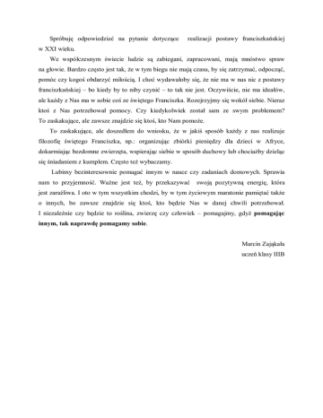 Spróbuję odpowiedzieć na pytanie dotyczące realizacji postawy franciszkańskiej w XXI wieku. We współczesnym świecie ludzie są zabiegani, zapracowani, mają mnóstwo spraw na głowie. Bardzo często jest tak, że w tym biegu nie mają czasu, by się zatrzymać, odpocząć, pomóc czy kogoś obdarzyć miłością. I choć wydawałoby się, że nie ma w nas nic z postawy franciszkańskiej – bo kiedy by to niby czynić – to tak nie jest. Oczywiście, nie ma ideałów, ale każdy z Nas ma w sobie coś ze świętego Franciszka. Rozejrzyjmy się wokół siebie. Nieraz ktoś z Nas potrzebował pomocy. Czy kiedykolwiek został sam ze swym problemem? To zaskakujące, ale zawsze znajdzie się ktoś, kto Nam pomoże. To zaskakujące, ale doszedłem do wniosku, że w jakiś sposób każdy z nas realizuje filozofię świętego Franciszka, np.: organizując zbiórki pieniędzy dla dzieci w Afryce, dokarmiając bezdomne zwierzęta, wspierając siebie w sposób duchowy lub chociażby dzieląc się śniadaniem z kumplem. Często też wybaczamy. Lubimy bezinteresownie pomagać innym w nauce czy zadaniach domowych. Sprawia nam to przyjemność. Ważne jest też, by przekazywać swoją pozytywną energię, która jest zaraźliwa. I oto w tym wszystkim chodzi, by w tym życiowym maratonie pamiętać także o innych, bo zawsze znajdzie się ktoś, kto będzie Nas w danej chwili potrzebował. I niezależnie czy będzie to roślina, zwierzę czy człowiek – pomagajmy, gdyż pomagając innym, tak naprawdę pomagamy sobie. Marcin Zająkała uczeń klasy IIIB