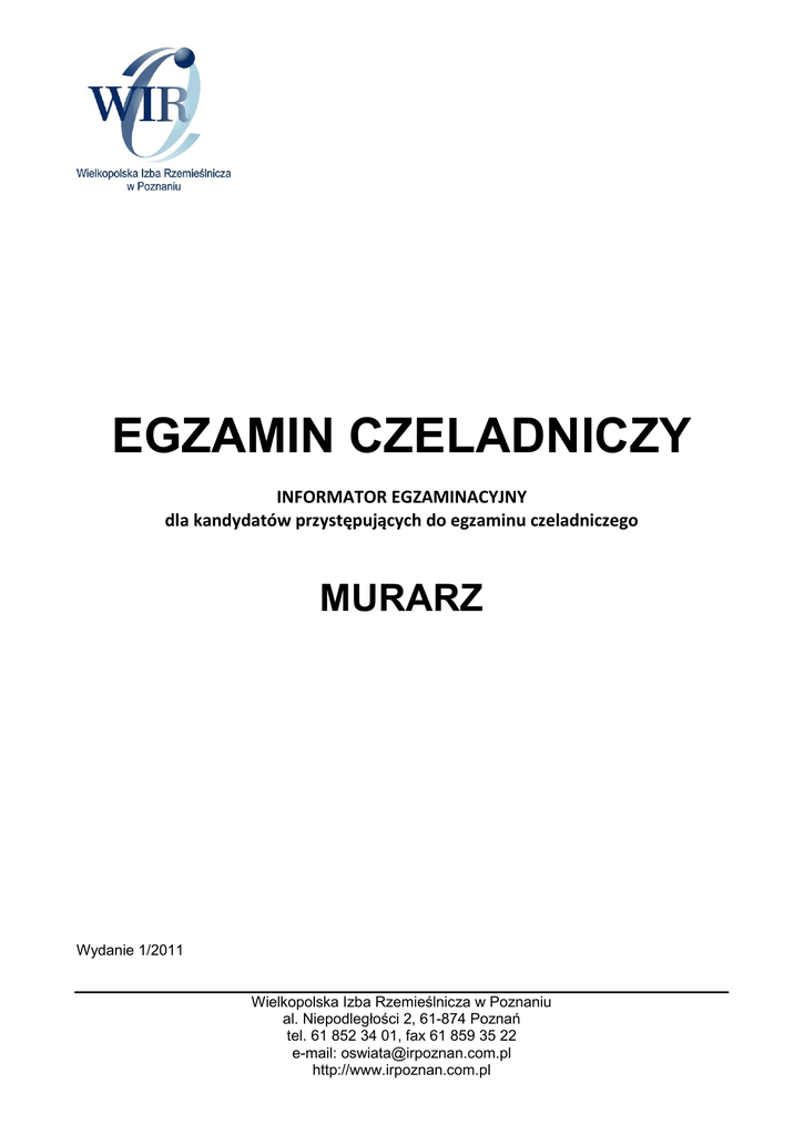 EGZAMIN CZELADNICZY INFORMATOR EGZAMINACYJNY dla kandydatów przystępujących do egzaminu czeladniczego MURARZ Wydanie 1/2011 Wielkopolska Izba Rzemieślnicza w Poznaniu al. Niepodległości 2, 61-874 Poznań tel. 61 852 34 01, fax 61 859 35 22 e-mail: [email protected] http://www.irpoznan.com.pl Informacje ogólne dla kandydatów ubiegających się o przystąpienie do egzaminu czeladniczego Egzamin czeladniczy składa się z dwóch etapów: 1. Etap praktyczny: Termin i miejsce etapu praktycznego ustala przewodniczący zespołu egzaminacyjnego. Czas trwania etapu praktycznego nie może być dłuższy niż 24 godziny łącznie, w ciągu trzech dni. Zgłaszając się na etap praktyczny, kandydat zobowiązany jest posiadać: skierowanie na etap praktyczny, dowód tożsamości /przedkłada również na egzaminie teoretycznym/ stosowną odzież roboczą, własne narzędzia stosowne według skierowania na egzamin 2. Etap teoretyczny składa się z dwóch części: Część pisemna jest testem wyboru, który polega na udzieleniu przez kandydata odpowiedzi na pytania z zakresu następujących tematów: 1) rachunkowość zawodowa, 2) dokumentacja działalności gospodarczej, 3) rysunek zawodowy, 4) zasady bezpieczeństwa i higieny pracy oraz ochrony przeciwpożarowej, 5) podstawowe zasady ochrony środowiska, 6) podstawowe przepisy prawa pracy, 7) podstawowa problematyka prawa gospodarczego i zarządzania przedsiębiorstwem. W każdym temacie jest siedem pytań, natomiast każde pytanie zawiera trzy propozycje odpowiedzi, z których jedna jest prawidłowa. Część ustna polega na udzieleniu przez kandydata odpowiedzi na pytania z zakresu następujących tematów: 1) technologia 2) maszynoznawstwo 3) materiałoznawstwo Każdy temat zawiera 3 pytania, zatem kandydat łącznie odpowiada na 9 pytań z tej części. 2 I. Zadania praktyczne do wykonania na egzaminie czeladniczym 1. 2. 3. 4. 5. 6. 7. 8. 9. 10. 11. 12. 13. 14. 15. 16. Wymiana drzwi wraz z obróbką. Wymiana okna wraz z obróbką Wykonanie wieńca stropowego Wykonanie ściany kolankowej wraz z obmurowaniem krokwi. Wykonanie filarów słupów żelbetonowych z zastosowaniem szalunków traconych. Wykonanie schodów betonowych zbrojonych prostych ze spocznikami prostymi. Wymurowanie ścianki działowej z cegły dziurawki wraz z osadzeniem drzwi. Wykonanie ścianki działowej. Wymurowanie ścianki działowej z siporeksu, Ytongu - do wyboru. Wymurowanie ścianki nośnej zewnętrznej na 1 1/2cegły wraz z otworami okiennymi i drzwiowymi. Wykonanie tynku wewnętrznego - ściana z otworem okiennym. Wykonanie ocieplenia ściany zewnętrznej z wełny mineralnej lub styropianu wraz z rynkiem do wyboru. Wykonanie stropu typu Kleina, Ferta, płyt kanałowych-do wyboru. Wykonanie nadproży okiennych i drzwiowych z ich wyprowadzeniem pod strop. Wykonanie fundamentu na ławie z bloczków betonowych wraz z izolacją poziomową i pionową. Wykonanie wykopu pod ławę fundamentową wraz z odeskowaniem, zazbrojeniem i zabetowaniem. Podczas etapu praktycznego egzaminu zdający wykonuje 3 zadania. II. Wykaz pytań do części ustnej egzaminu z tematu: TECHNOLOGIA 1. Omów wykonanie ławy fundamentowej. 2. Wymień znane ci metody docieplania ścian. 3. Wymień rodzaje strzępni na budowie. 4. Jaką rolę pełnią tynki na budowie? 5. Wymień znane ci rodzaje tynków. 6. Wymień rodzaje murów ze względu na ich konstrukcję. 7. Wymień znane ci stropy ceramiczne. 8. Omów przygotowanie podłoża pod tynki. 9. Wymień rodzaje gruntów pod budowę. 10. Wymień rodzaje nadproży ze względu na użyty materiał. 11. Z czego powstaje strop ceramiczny? 12. Co to jest powała? 13. Omów wykonanie ścian z płyt Pro-Monta. 14. Co rozumiesz przez pojęcie licowania ścian? 15. Omów różnice pomiędzy ławą fundamentową a jej murem. 16. Do czego służą plastyfikatory? 17. Omów sposób murowania ścian z pustaków Porotherm. 18. Wyjaśnij pojęcie ściany kolankowej. 19. W jaki sposób zagęszcza się beton? 20. Jakie znasz rodzaje fundamentów? 21. Jakie znasz rodzaje stropów murarskich „Kleina”? 22. Omów różnicę pomiędzy stropem prefabrykowanym a wylewanym na mokro. 23. Omów zasady wykonywania izolacji ciepłochronnej. 24. Omów zasady wykonywania tynków wewnętrznych w kategorii III. 25. Omów skład betonu. 26. Omów wykonanie wieńca żelbetowego i jego funkcje konstrukcyjne. 27. Omów wykonywanie czynności przy izolacji pionowej fundamentów. 28. Podaj wymiary cegły ceramicznej. 29. Omów zasady wiązania murów w wiązaniu pospolitym i krzyżykowym. 30. Wymień sposoby wykonywania murów grubych w warunkach zimowych. 3 MATERIAŁOZNAWSTWO 1. Wymień znane ci rodzaje materiałów do wznoszenia murów. 2. Wymień znane ci rodzaje cegieł ceramicznych. 3. Wymień klasy cegieł i jak można to sprawdzić. 4. Co to są pustaki wentylacyjne i do czego służą? 5. Co to jest pospółka i do czego służy? 6. Wymień jakie znasz kruszywa naturalne. 7. Wymień jakie znasz kruszywa sztuczne. 8. Co to jest cement i do czego służy? 9. Co to jest wapno i do czego służy? 10. Co to jest mieszanka wapienno – piaskowa? 11. Wymień rodzaje materiałów wiążących. 12. Wymień rodzaje zapraw murarskich. 13. Wymień elementy ścienne ceramiczne. 14. Wymień rodzaje kamieni naturalnych. 15. Wymień rodzaje stropów prefabrykowanych. 16. Podaj wymiary cegły pełnej ceramicznej. 17. Co to są sylikaty i do czego się je stosuje? 18. Co to jest beton komórkowy i do czego jest stosowany? 19. Co to jest siatka Rabitza i do czego służy? 20. Jaką wodę stosujemy do zapraw? 21. Wymień materiały do stawiania przewodów spalinowych i wentylacyjnych. 22. Jakie materiały stosujemy do ocieplania budynków? 23. Co to są plastyfikatory i do czego służą? 24. Wymień rodzaje zapraw tynkarskich. 25. Wymień rodzaje izolacji stosowanych w budownictwie. 26. Co to jest papa bitumiczna i do czego służy? 27. Wymień rodzaje folii stosowanych w budownictwie. 28. Co 