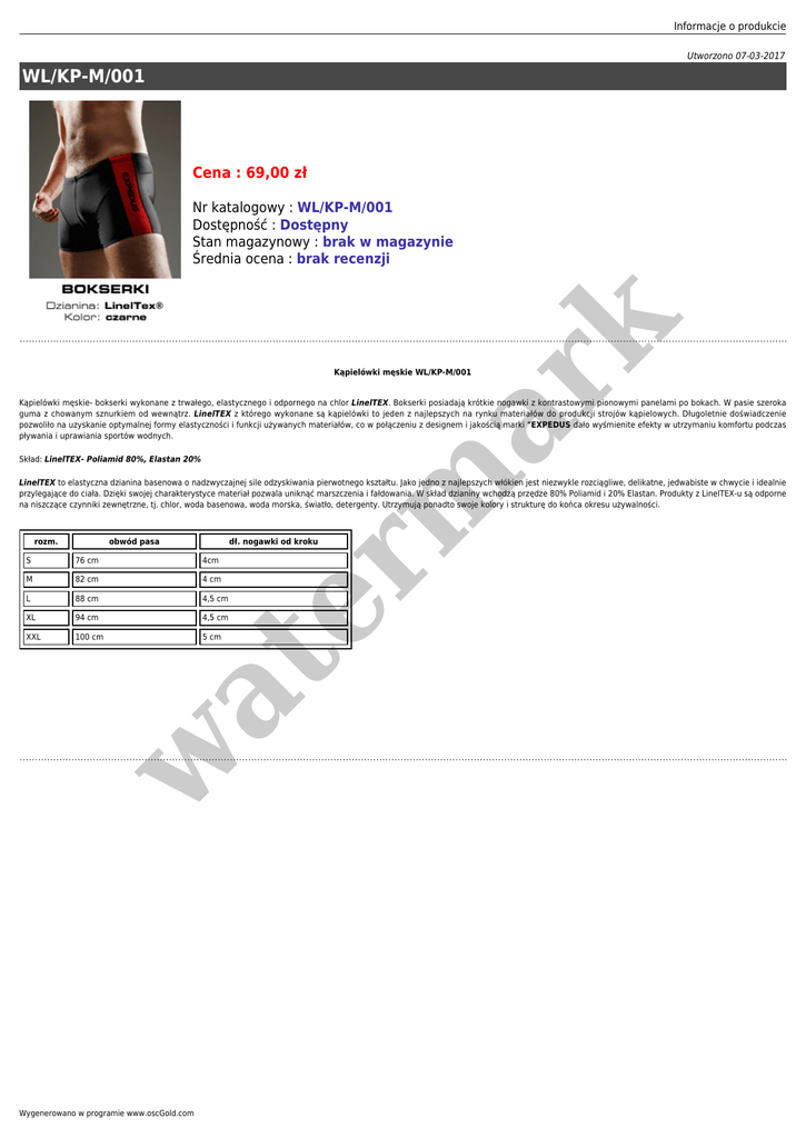 Informacje o produkcie Utworzono 07-03-2017 WL/KP-M/001 Cena : 69,00 zł er m ar k Nr katalogowy : WL/KP-M/001 Dostępność : Dostępny Stan magazynowy : brak w magazynie Średnia ocena : brak recenzji Kąpielówki męskie WL/KP-M/001 Kąpielówki męskie- bokserki wykonane z trwałego, elastycznego i odpornego na chlor LinelTEX. Bokserki posiadają krótkie nogawki z kontrastowymi pionowymi panelami po bokach. W pasie szeroka guma z chowanym sznurkiem od wewnątrz. LinelTEX z którego wykonane są kąpielówki to jeden z najlepszych na rynku materiałów do produkcji strojów kąpielowych. Długoletnie doświadczenie pozwoliło na uzyskanie optymalnej formy elastyczności i funkcji używanych materiałów, co w połączeniu z designem i jakością marki "EXPEDUS dało wyśmienite efekty w utrzymaniu komfortu podczas pływania i uprawiania sportów wodnych. Skład: LinelTEX- Poliamid 80%, Elastan 20% LinelTEX to elastyczna dzianina basenowa o nadzwyczajnej sile odzyskiwania pierwotnego kształtu. Jako jedno z najlepszych włókien jest niezwykle rozciągliwe, delikatne, jedwabiste w chwycie i idealnie przylegające do ciała. Dzięki swojej charakterystyce materiał pozwala uniknąć marszczenia i fałdowania. W skład dzianiny wchodzą przędze 80% Poliamid i 20% Elastan. Produkty z LinelTEX-u są odporne na niszczące czynniki zewnętrzne, tj. chlor, woda basenowa, woda morska, światło, detergenty. Utrzymują ponadto swoje kolory i strukturę do końca okresu używalności. rozm. obwód pasa dł. nogawki od kroku 76 cm 4cm M 82 cm 4 cm L 88 cm 4,5 cm XL 94 cm 4,5 cm XXL 100 cm 5 cm w at S Wygenerowano w programie www.oscGold.com