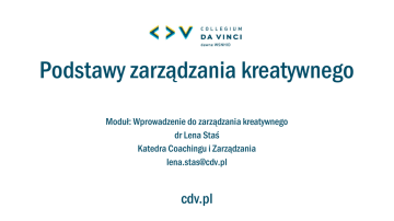 Podstawy zarządzania kreatywnego Moduł: Wprowadzenie do zarządzania kreatywnego dr Lena Staś Katedra Coachingu i Zarządzania [email protected] cdv.pl Plan spotkań Podstawowe pojęcia nauk o zarządzaniu: zarządzanie, kierowanie, szczeble zarządzania, funkcje zarządzania, kierownik, role kierownicze, umiejętności kierownicze Organizacja i otoczenie organizacji Skuteczne działanie Planowanie jako funkcja zarządzania Organizowanie jako funkcja zarządzania Motywowanie jako funkcja zarządzania Kontrolowanie jako funkcja zarządzania Zarządzanie strategiczne Podejmowanie decyzji kierowniczych Literatura 1) Stoner J.A.F., Freeman R.E., Gilbert D.R. jr., Kierowanie, PWE Warszawa 2011, rozdziały: 1,3,12,16,20,10,11,9 Lub 1997 rozdziały: 1,3,8,9,10,14,18,4,5 2) Pliki na wirtualnej uczelni Zaliczenie przedmiotu Ocena wynika z liczby punktów pozyskanych z 5 kart pracy (5x10pkt.) oraz kolokwium końcowego (na ostatnich zajęciach 50pkt.) 0 - 49 niedostateczny 50 - 59 dostateczny 60 - 69 dostateczny plus 70 - 79 dobry 80 - 89 dobry plus 90 - 100 bardzo dobry