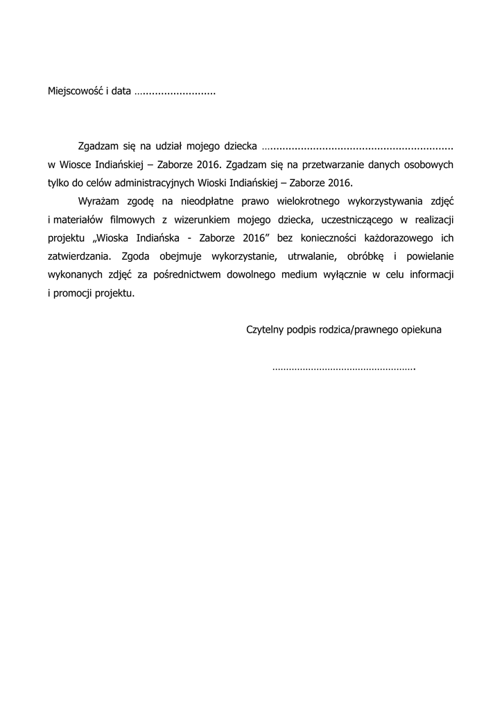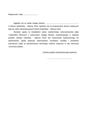 Miejscowość i data …........................ Zgadzam się na udział mojego dziecka …............................................................ w Wiosce Indiańskiej – Zaborze 2016. Zgadzam się na przetwarzanie danych osobowych tylko do celów administracyjnych Wioski Indiańskiej – Zaborze 2016. Wyrażam zgodę na nieodpłatne prawo wielokrotnego wykorzystywania zdjęć i materiałów filmowych z wizerunkiem mojego dziecka, uczestniczącego w realizacji projektu „Wioska Indiańska - Zaborze 2016” bez konieczności każdorazowego ich zatwierdzania. Zgoda obejmuje wykorzystanie, utrwalanie, obróbkę i powielanie wykonanych zdjęć za pośrednictwem dowolnego medium wyłącznie w celu informacji i promocji projektu. Czytelny podpis rodzica/prawnego opiekuna …………………………………………….