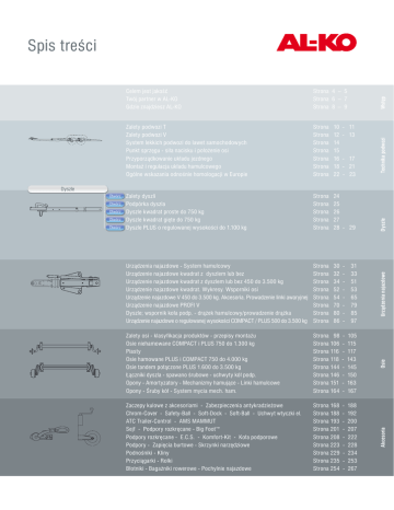 Strona 4 – 5 Strona 6 – 7 Strona 8 – 9 Zalety podwozi T Zalety podwozi V System lekkich podwozi do lawet samochodowych Punkt sprzęgu - siła nacisku i położenie osi Przyporządkowanie układu jezdnego Montaż i regulacja układu hamulcowego Ogólne wskazania odnośnie homologacji w Europie Strona Strona Strona Strona Strona Strona Strona 10 12 14 15 16 18 22 Zalety dyszli Podpórka dyszla Dyszle kwadrat proste do 750 kg Dyszle kwadrat gięte do 750 kg Dyszle PLUS o regulowanej wysokości do 1.100 kg Strona Strona Strona Strona Strona 24 25 26 27 28 - 29 Urządzenia najazdowe - System hamulcowy Urządzenie najazdowe kwadrat z dyszlem lub bez Urządzenie najazdowe kwadrat z dyszlem lub bez 450 do 3.500 kg Urządzenie najazdowe kwadrat. Wykresy. Wsporniki osi Urządzenie najazdowe V 450 do 3.500 kg. Akcesoria. Prowadzenie linki awaryjnej Urządzenie najazdowe PROFI V Dyszle; wspornik koła podp. - drążek hamulcowy/prowadzenie drążka Urządzenie najazdowe o regulowanej wysokości COMPACT / PLUS 500 do 3.500 kg Strona Strona Strona Strona Strona Strona Strona Strona 30 32 34 52 54 70 80 86 - 31 33 51 53 65 79 85 97 Zalety osi - klasyfikacja produktów - przepisy montażu Osie niehamowane COMPACT i PLUS 750 do 1.300 kg Piasty Osie hamowane PLUS i COMPACT 750 do 4.000 kg Osie tandem połączone PLUS 1.600 do 3.500 kg Łączniki dyszla - spawano śrubowe - uchwyty kół podp. Opony - Amortyzatory - Mechanizmy hamujące - Linki hamulcowe Opony - Śruby kół - System mycia mech. ham. Strona 98 Strona 106 Strona 116 Strona 118 Strona 144 Strona 146 Strona 151 Strona 164 - 105 115 117 143 145 150 163 167 Osie Strona 168 Strona 188 Strona 193 Strona 201 Strona 208 Strona 223 Strona 229 Strona 235 Strona 254 - 188 192 200 207 222 228 234 253 267 - 11 - 13 - 17 - 21 - 23 Technika podwozi Wstęp Celem jest jakość Twój partner w AL-KO Gdzie znajdziesz AL-KO Akcesoria Spis treści Otwórz Otwórz Otwórz Otwórz Zaczepy kulowe z akcesoriami - Zabezpieczenia antykradzieżowe Chrom-Cover - Safety-Ball - Soft-Dock - Soft-Ball - Uchwyt wtyczki el. ATC Trailer-Control - AMS MAMMUT Sejf - Podpory rozkręcane - Big Foot™ Podpory rozkręcane - E.C.S. - Komfort-Kit - Koła podporowe Podpory - Zapięcia burtowe - Skrzynki narzędziowe Podnośniki - Kliny Przyciągarki - Rolki Błotniki - Bagażniki rowerowe - Pochylnie najazdowe Urządzenia najazdowe Otwórz Dyszle Dyszle Zalety dyszli Dyszle o regulowanej wysokości PLUS do 1.100 kg Zalety lOsiągana wysokość sprzęgania do 1.100 mm. lNadzwyczaj stabilna, wytrzymała konstrukcja lŁatwa zamiana zaczepu kulowego na oczko DIN lW ysoka stabilność w obciążonych przegubach dzięki zastosowaniu czterech wieńców zębatych lOpcja (akcesoria): Wyposażenie w hamulec postojowy (dostawa z zakładu AL-KO). Dyszle proste i wygięte COMPACT do 750 kg Zalety lSeryjnie montowany wskaźnik sprzęgu lUchwyt koła podporowego (jako opcja) 24 Spis treści Podpórka dyszla Dostawa obejmuje: l( Zob.: rysunek techniczny) bez śrub Obróbka powierzchni lCynkowanie ogniowe do dyszli rurowych bez hamulca Dyszle Technika lZe względu na bezpieczeństwo zalecamy wyposażyć wszystkie urządzenia najazdowe w podpórkę dyszla. Wykaz artykułów Nr artykułu 203 037 0,260 kg do dyszli V z urządzeniami najazdowymi montowanymi z góry lub z dołu 150 Wykaz artykułów Nr artykułu 217 132 0,470 kg do dyszli V z urządzeniami najazdowymi montowanymi z góry lub z dołu 90 Wykaz artykułów Nr artykułu 217 851 Spis treści 0,650 kg 25 Dyszle Kwadrat proste do 750 kg Dane techniczne Typ R4 - Wyk. A1 DMC 750 kg Dopuszcz. nacisk na kulę haka 75 kg Nr homologacji UE: e1 00-0388 Zaczep kulowy Typ AK 7 Zalety lWskaźnik bezpieczeństwa lUchwyt koła podporowego (jako opcja) zob. wykres Dostawa obejmuje: Zob. rysunek; w tym: lPałąk dyszla 203 037 lUchwyt dyszel-rama 589 087 lUchwyt wtyczki el. 218 260 00 04 Obróbka powierzchni lCynkowanie ogniowe Wykaz artykułów Wykres Typ R4 Wyk. A1: kwadrat 60x60x3 St 52-3 Wyk. A3: kwadrat 60x60x4 St 52-3 Wykonanie A1 Wymiar A 26 mm Nr artykułu 1395 200 350 01 8,02 50 10 1555 247 960 8,89 50 10 1715 200 350 02 9,76 50 10 1875 200 350 03 10,63 50 10 2035 247 961 11,50 50 2 2195 200 350 04 12,37 50 10 2355 200 350 05 13,24 50 10 2515 249 096 14,00 50 2 2675 200 350 06 14,87 50 10 2835 200 350 07 15,74 50 10 2995 247 962 16,61 50 10 Wyk. A1 Spis treści Wyk. A3 Dyszle Kwadrat gięte do 750 kg Technika Typ K4 - Wyk. A1 DMC 750 kg Dopuszcz. nacisk na kulę haka 75 kg Nr homologacji UE: e1 00-0914 Zaczep kulowy Typ AK 7 Zalety lSeryjny wskaźnik zabezpieczenia lUchwyt koła podporowego (jako opcja) zob. wykres Dyszle Dostawa obejmuje: Zob. rysunek; w tym: lPałąk dyszla 203 037 lUchwyt dyszel-rama 589 087 lUchwyt wytyczki el. 218 260 00 04 Obróbka powierzchni lCynkowanie ogniowe Wykaz artykułów Wykres Typ K4 Wyk. A1: kwadrat 60x60x3 St 52-3 Wyk. A2: kwadrat 60x60x4 St 52-3 Wykonanie A1 Wymiar A mm Nr artykułu 1370 200 351 01 8,02 50 10 1530 200 351 02 8,89 50 10 1690 200 351 03 9,76 50 10 1850 200 351 04 10,63 50 10 2010 121 130 0 11,50 50 10 2170 200 351 05 12,37 50 10 2330 200 351 06 13,24 50 10 2490 200 351 07 14,00 50 10 2650 200 351 08 14,87 50 10 2810 200 351 09 15,74 50 10 2970 200 351 10 16,61 50 10 Wyk. A1 Spis treści Wyk. A2 27 Dyszle PLUS Regulowana wysokość; do 1.100 kg Dostawa obejmuje: proszę zamówić: lCzęści sprzęgu (zakres dostawy na rys 1) lŁ ącznik dyszla (zakres dostawy na rys. 2 lDyszel (zakres dostawy na rys. 3) lHamulec postojowy (akcesoria - poza zakresem dostawy) Rysunek 2: Łącznik dyszla Dostawa obejmuje: l2-częściowe połączenie dyszla Śruby łożyskowe, górna i dolna l Dżwignia mocująca, górna i dolna, łańcuch oraz sprężysta stopka, góra i dół Rysunek 1: Części sprzęgu Oczko DIN Ø 40 Typ 70.1 VO Art. nr 242 172 75 VU A 275 mm, 5,6 kg 102 VB Zaczep kulowy Ø 50 Typ 70.1 VO Art. nr 249 323 75 VU A 230 mm, 4,8 kg 102 VB Oczko Francja Ø 68 Typ 70.1 VO Art. nr 1313927 75 VU A 240 
