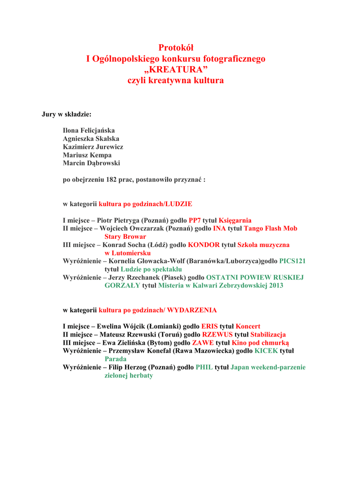 Protokół I Ogólnopolskiego konkursu fotograficznego „KREATURA” czyli kreatywna kultura Jury w składzie: Ilona Felicjańska Agnieszka Skalska Kazimierz Jurewicz Mariusz Kempa Marcin Dąbrowski po obejrzeniu 182 prac, postanowiło przyznać : w kategorii kultura po godzinach/LUDZIE I miejsce – Piotr Pietryga (Poznań) godło PP7 tytuł Księgarnia II miejsce – Wojciech Owczarzak (Poznań) godło INA tytuł Tango Flash Mob Stary Browar III miejsce – Konrad Socha (Łódź) godło KONDOR tytuł Szkoła muzyczna w Lutomiersku Wyróżnienie – Kornelia Głowacka-Wolf (Baranówka/Luborzyca)godło PICS121 tytuł Ludzie po spektaklu Wyróżnienie – Jerzy Rzechanek (Piasek) godło OSTATNI POWIEW RUSKIEJ GORZAŁY tytuł Misteria w Kalwari Zebrzydowskiej 2013 w kategorii kultura po godzinach/ WYDARZENIA I miejsce – Ewelina Wójcik (Łomianki) godło ERIS tytuł Koncert II miejsce – Mateusz Rzewuski (Toruń) godło RZEWUS tytuł Stabilizacja III miejsce – Ewa Zielińska (Bytom) godło ZAWE tytuł Kino pod chmurką Wyróżnienie – Przemysław Konefał (Rawa Mazowiecka) godło KICEK tytuł Parada Wyróżnienie – Filip Herzog (Poznań) godło PHIL tytuł Japan weekend-parzenie zielonej herbaty