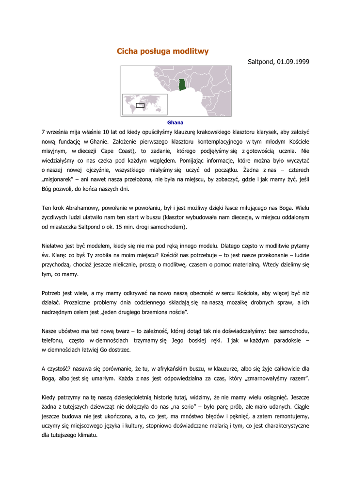 Cicha posługa modlitwy Saltpond, 01.09.1999 Ghana 7 września mija właśnie 10 lat od kiedy opuściłyśmy klauzurę krakowskiego klasztoru klarysek, aby załoŜyć nową fundację w Ghanie. ZałoŜenie pierwszego klasztoru kontemplacyjnego w tym młodym Kościele misyjnym, w diecezji Cape Coast), to zadanie, którego podjęłyśmy się z gotowością ucznia. Nie wiedziałyśmy co nas czeka pod kaŜdym względem. Pomijając informacje, które moŜna było wyczytać o naszej nowej ojczyźnie, wszystkiego miałyśmy się uczyć od początku. śadna z nas – czterech „misjonarek” – ani nawet nasza przełoŜona, nie była na miejscu, by zobaczyć, gdzie i jak mamy Ŝyć, jeśli Bóg pozwoli, do końca naszych dni. Ten krok Abrahamowy, powołanie w powołaniu, był i jest moŜliwy dzięki łasce miłującego nas Boga. Wielu Ŝyczliwych ludzi ułatwiło nam ten start w buszu (klasztor wybudowała nam diecezja, w miejscu oddalonym od miasteczka Saltpond o ok. 15 min. drogi samochodem). Niełatwo jest być modelem, kiedy się nie ma pod ręką innego modelu. Dlatego często w modlitwie pytamy św. Klarę: co byś Ty zrobiła na moim miejscu? Kościół nas potrzebuje – to jest nasze przekonanie – ludzie przychodzą, chociaŜ jeszcze nielicznie, proszą o modlitwę, czasem o pomoc materialną. Wtedy dzielimy się tym, co mamy. Potrzeb jest wiele, a my mamy odkrywać na nowo naszą obecność w sercu Kościoła, aby więcej być niŜ działać. Prozaiczne problemy dnia codziennego składają się na naszą mozaikę drobnych spraw, a ich nadrzędnym celem jest „jeden drugiego brzemiona noście”. Nasze ubóstwo ma teŜ nową twarz – to zaleŜność, której dotąd tak nie doświadczałyśmy: bez samochodu, telefonu, często w ciemnościach trzymamy się Jego boskiej ręki. I jak w kaŜdym paradoksie – w ciemnościach łatwiej Go dostrzec. A czystość? nasuwa się porównanie, Ŝe tu, w afrykańskim buszu, w klauzurze, albo się Ŝyje całkowicie dla Boga, albo jest się umarłym. KaŜda z nas jest odpowiedzialna za czas, który „zmarnowałyśmy razem”. Kiedy patrzymy na tę naszą dziesięcioletnią historię tutaj, widzimy, Ŝe nie mamy wielu osiągnięć. Jeszcze Ŝadna z tutejszych dziewcząt nie dołączyła do nas „na serio” – było parę prób, ale mało udanych. Ciągle jeszcze budowa nie jest ukończona, a to, co jest, ma mnóstwo błędów i pęknięć, a zatem remontujemy, uczymy się miejscowego języka i kultury, stopniowo doświadczane malarią i tym, co jest charakterystyczne dla tutejszego klimatu. Po półtora roku od naszego przyjazdu zginął w wypadku samochodowym bp J.K. Amissak, który nas tutaj zaprosił. Nowy Pasterz Archidiecezji przyszedł za następne półtora roku prosto „ze świata ksiąŜek” i dzielnie podjął się nowego zadania. „Odziedziczył nas” – jak mówi. Jak wygląda nasz dzień powszedni? Pięć razy w tygodniu wstajemy o pierwszej w nocy na godzinę czytań. Rano zbieramy się, by o szóstej rozpocząć medytację, Mszę św. i jutrznię. Potem śniadanie – dzwonek wzywa na garnuszek kawy czy kakao, chleb domowej roboty z dŜemem czy jajko. Uczymy się uŜywać tutejszych produktów rolnych. Wszystkie prace domowe wykonujemy same. Siedem razy dziennie gromadzimy się w kaplicy, śpiewając Panu chwałę – najlepszy czas do Niego naleŜy. Trochę szyjemy: stuły, ornaty, alby, tuniki dla ministrantów. Potrzeb jest wiele, bo za naszego pobytu powstało w Ghanie siedem diecezji, otwarto wiele nowych parafii i święcono średnio ok. 70 kapłanów rocznie. My jednak nie czujemy się fabryką szat liturgicznych. Zdajemy sobie sprawę, Ŝe nasze mury są „przeźroczyste” i mamy promieniować na innych ciepłem i blaskiem, płynącym z bliskości Boga. Bardzo powaŜni realiści ostrzegają nas – „po co wy tu siedzicie, za kilka lat będziecie całkiem nieproduktywne, tyle jest potrzeb, kaŜdy przecieŜ się modli”. Słusznie, słusznie, ale my zaczynamy robić to i być takimi, jakimi wszyscy będziemy w niebie. Tam nie będzie maluczkich do nauczania, chorych do pielęgnowania, więźniów do odwiedzenia i głodnych do nakarmienia. Zobaczymy tam Boga twarzą w twarz. ToteŜ naszym codziennym zadaniem jest szukanie BoŜego oblicza i odnajdywanie Go w ludziach i sprawach, jakie stawia na naszej drodze. AŜ i tylko tyle. Przez te lata doznajemy tajemniczej potęgi modlitwy za nas, siły, która nas umacnia „w drodze”. Jest to łańcuch wdzięczności, który nas otacza przez cały czas, mimo dzielących odległości. Trwamy, bo On nas prowadzi, wielu podtrzymuje Ŝyczliwą pomocą i modlitwą. Staramy się być otwarte na potrzeby Kościoła nie tylko przez modlitwę, ale takŜe przez słuŜbę na miarę naszych moŜliwości. Udostępniamy trzy pokoje na prywatne rekolekcje czy teŜ na wypoczynek dla sióstr, które chętnie korzystają z bliskości kaplicy i odnawiają siły do pracy w szkołach czy szpitalach. Czy nam czegoś potrzeba? O tak! Wielkiej modlitwy, aby nie zniechęcać się. Dla naszej piątki i dla tych, co zechcą obrać nasz styl Ŝycia. Nie mamy biblioteki, ale teŜ i inne potrzeby musimy realizować mając „tony cierpliwości”. Nie powołał nas Pan do sukcesu, ale do wierności. Gdyby ktoś zechciał nam pomóc materialnie, prosimy ofiarę przesłać na adres sióstr klarysek w Krakowie, z dopiskiem „Misja w Ghanie”. Bóg zapłać! Serdecznie pozdrawiamy, zapewniając o modlitwie. Pan niech Wam błogosławi! Siostry klaryski