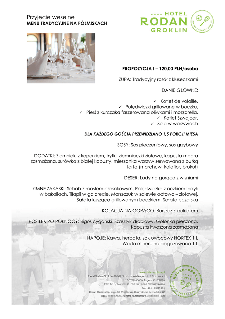 Przyjęcie weselne MENU TRADYCYJNE NA PÓŁMISKACH PROPOZYCJA I – 120,00 PLN/osoba ZUPA: Tradycyjny rosół z kluseczkami DANIE GŁÓWNE: Kotlet de volaille, Polędwiczki grillowane w boczku, Pierś z kurczaka faszerowana oliwkami i mozzarella, Kotlet Szwajcar, Sola w warzywach DLA KAŻDEGO GOŚCIA PRZEWIDZIANO 1,5 PORCJI MIĘSA SOSY: Sos pieczeniowy, sos grzybowy DODATKI: Ziemniaki z koperkiem, frytki, ziemniaczki ziołowe, kapusta modra zasmażana, surówka z białej kapusty, mieszanka warzyw serwowana z bułką tartą (marchew, kalafior, brokuł) DESER: Lody na gorąco z wiśniami ZIMNE ZAKĄSKI: Schab z masłem czosnkowym, Polędwiczka z oczkiem Indyk w bakaliach, Tilapii w galarecie, Morszczuk w zalewie octowo – ziołowej, Sałata kusząca grillowanym boczkiem, Sałata cezarska KOLACJA NA GORĄCO: Barszcz z krokietem POSIŁEK PO PÓŁNOCY: Bigos cygański, Szaszłyk drobiowy, Golonka pieczona, Kapusta kwaszona zasmażana NAPOJE: Kawa, herbata, sok owocowy HORTEX 1 L Woda mineralna niegazowana 1 L Przyjęcie weselne MENU TRADYCYJNE NA PÓŁMISKACH PROPOZYCJA II – 140,00PLN/osoba ZUPA: Bulion grzybowy DANIE GŁÓWNE: Roladka z kurczaka z borowikami, Zraz ze schabu, Warkocz z polędwiczki marynowany w occie balsamicznym, Pieczone marynowane w ziołach roladki z pstrąga DLA KAŻDEGO GOŚCIA PRZEWIDZIANO 2,5 PORCJI MIĘSA SOSY: Sos pieczeniowy, sos beszamelowy DODATKI: Ziemniaki z koperkiem, ziemniaczki ziołowe, kluski gnocci, pyzy drożdżowe, buraczki, surówka z białej kapusty z kukurydzą, marchew z bułką tartą, kalafior z bułka tartą DESER: Szarlotka na ciepło z lodami ZIMNE ZAKĄSKI: Pulpety drobiowe w boczku, Rulony z szynki z sosem tatarskim, Galarciki wieprzowe z sosem chrzanowym, Roladka z soli i łososia wędzonego, Okoń w galarecie, Sałata z tuńczykiem i grzankami, Sałata z wędzonym kurczakiem, orzechami i jabłkiem KOLACJA NA GORĄCO: Zupa gulaszowa POSIŁEK PO PÓŁNOCY: Szynka pieczona w całości z sosem chrzanowym, Golonka po bawarsku, Szaszłyk wieprzowy, Kapusta kwaszona z grzybami, Pieczywo masło NAPOJE: Kawa, herbata, Sok owocowy HORTEX 1 L, Woda mineralna niegazowana 1 L, Przyjęcie weselne MENU TRADYCYJNE NA PÓŁMISKACH PROPOZYCJA III – 160,00PLN/osoba ZUPA: Krem szparagowy z zielonymi szparagami DANIE GŁÓWNE: Pierś z kaczki, Zraz cielęcy, Zraz z polędwicy z suszonymi grzybami, Sandacz grillowany DLA KAŻDEGO GOŚCIA PRZEWIDZIANO 2,5 PORCJI MIĘSA DODATKI: Ziemniaki gotowane, pyzy drożdżowe, kluski półfrancuskie, kapusta modra, zasmażana, surówka z kapusty białej, mieszanka warzyw gotowanych (mix), podawana z bułką tartą DESER: Gruszka w czerwonym winie z lodami ZIMNE ZAKĄSKI: Polędwica po angielsku, Rostbef urugwajski z sosem cygańskim, Cocktail z indyka, Sandacz w galarecie, Śledziki mix (w pikantnej panierce, z kurkami , po staropolsku), Sałata z polędwiczka, Sałata z serem camembert KOLACJA NA GORĄCO: Żurek w chlebie POSIŁEK PO PÓŁNOCY: Karkówka pieczona z sosem grzybowym, Strogonoff, Kluski półfrancuskie, Kapusta kwaszona zasmażana NAPOJE: Kawa, herbata, Sok owocowy 1 L na osobę, Woda mineralna niegazowana 1 L