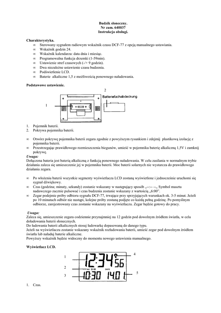 Budzik słoneczny. Nr zam. 640037 Instrukcja obsługi. Charakterystyka. • Sterowany sygnałem radiowym wskaźnik czasu DCF-77 z opcją manualnego ustawiania. • Wskaźnik godzin 24. • Wskaźnik kalendarza: data dnia i miesiąc. • Programowalna funkcja drzemki (1-59min). • Ustawienie stref czasowych (-/+ 9 godzin). • Dwa niezależne ustawienie czasu budzenia. • Podświetlenie LCD. • Baterie alkaliczne 1,5 z możliwością ponownego naładowania. Podstawowe ustawienie. 2 1 1. 2. Pojemnik baterii. Pokrywa pojemnika baterii. • Otwórz pokrywę pojemnika baterii zegara zgodnie z powyższym rysunkiem i zdejmij plastikową izolację z pojemnika baterii. • Przestrzegając prawidłowego rozmieszczenia biegunów, umieść w pojemniku baterię alkaliczną 1,5V i zamknij pokrywę. Uwaga: Dołączona bateria jest baterią alkaliczną z funkcją ponownego naładowania. W celu zasilania w normalnym trybie działania zaleca się umieszczenie jej w pojemniku baterii. Moc baterii solarnych nie wystarcza do prawidłowego działania zegara. • • • Po włożeniu baterii wszystkie segmenty wyświetlacza LCD zostaną wyświetlone i jednocześnie uruchomi się sygnał dźwiękowy. Czas (godzina; minuty, sekundy) zostanie wskazany w następujący sposób „--:-- --„ Symbol masztu nadawczego zacznie pulsować i czas budzenia zostanie wskazany z wartością „6:00”. Zegar podejmie próby odbioru sygnału DCF-77, trwające przy sprzyjających warunkach ok. 3-5 minut. Jeżeli po 10 minutach odbiór nie nastąpi, kolejne próby zostaną podjęte co każdą pełną godzinę. Po pomyślnym odbiorze, zarejestrowany czas zostanie wskazany na wyświetlaczu. Zegar będzie gotowy do pracy. Uwaga: Zaleca się, umieszczenie zegara codziennie przynajmniej na 12 godzin pod dowolnym źródłem światła, w celu doładowania baterii słonecznych. Do ładowania baterii alkalicznych stosuj ładowarkę dopasowaną do danego typu. Jeżeli na wyświetlaczu zostanie wskazany wskaźnik rozładowania baterii, umieść zegar pod dowolnym źródłem światła lub naładuj baterie alkaliczne. Powyższy wskaźnik będzie widoczny do momentu nowego ustawienia manualnego. Wyświetlacz LCD. 1 4 2 3 1. Czas. 5 2. 3. 4. 5. Symbol alarmu 1. Czas budzenia. Symbol masztu nadawczego DCF-77. Wskaźnik kalendarza ( data dnia i miesiąc), zamiennie Alarm 2. Wskaźnik czasu sterowany sygnałem radiowym. Po włożeniu baterii zegar podejmie odbiór sygnału DCF w przeciągu 3-5 minut. Jeżeli odbiór zakończy się pomyślnie, we wszystkich segmentach wyświetlone zostaną odpowiednie informacje, a odbiór sygnału w tym dniu już nie nastąpi. Odbiór sygnału DCF następuje każdorazowo między 2, a 3 godzina w nocy. Jeżeli właściwy odbiór nie jest możliwy, zegar podejmie kolejne próby o każdej pełnej godzinie. Zakodowany czas emitowany jest przez nadajnik długofalowy, znajdujący się w Mainflingen pod Frankfurtem. Zegar radiowy odbiera ten sygnał w pełni automatycznie, przez wbudowany system antenowy, wskazując zawsze dokładnie taką samą godzinę co nadajnik. Zegary te są tak precyzyjne, że teoretycznie dopiero po milionie lat możliwe jest odchylenie wskazań +/- 1 sekunda. Podobnie jak w urządzeniach radiowych moc odbioru uzależniona jest od miejsca i położenia odbiornika ( w okręgu o promieniu 1500km. od Frankfurtu emisja przebiega zupełnie bezproblemowo). W przypadku braku odbioru na wyświetlaczu LCD pojawi się symbol wieży nadawczej. Brak odbioru może być spowodowany zakłóceniami wywołanymi przez różnego rodzaju urządzenia, jak np. telewizor, monitor komputera itp. ( zalecany odstęp od urządzeń zakłócających 1,5 –2m). Może również wynikać z niewłaściwego położenia odbiornika np. w pobliżu okien w metalowych ramach. Przyciski funkcji. SNOOZE/ 24HR AL./ AL./HR AL./MIN : funkcja drzemki : przejście do trybu ustawienia czasu, strefy czasowej, trwania drzemki, zakończenia alarmu budzenia i funkcji drzemki. : włączenie podświetlenia. : ustawienie alarmu 1, symbol alarmu 1 „(((1)))”, zatrzymanie sygnału budzenia dla alarmu 1, ustawienie godziny i strefy czasowej, włączenie podświetlenia. : ustawienie alarmu 2, symbol alarmu 2 „(((2)))”, zatrzymanie sygnału budzenia dla alarmu 2, ustawienie minut i długości drzemki, włączenie podświetlenia. Alarm budzenia. Przy aktywnej funkcji budzenia, dostępne są następujące sygnały budzenia: Od 0 do 26 sekund : ciąg 2 krótkich, delikatnych dźwięków Od 27 do 54 sekund : ciąg 4 krótkich dźwięków Od 55 sekund do 1:35 minut : ciąg bardzo krótkich dźwięków Uwaga: Alarm budzenia 1 i 2 wyłącza się automatycznie po 1 minucie i 35 sekundach i uruchamia dopiero następnego dnia o tej samej godzinie. Ustawienie czasu budzenia. 1 2 1. 2. 3. AL. 1 ( pulsujący). Ustawienie godziny. Ustawienie minut. 3 Ustawienie czasu alarmu 1 i 2. • Naciśnij i przytrzymaj przycisk „AL./HR” do momentu pojawienia się na wyświetlaczu symbolu „(((1)))”. Symbol „AL. 1” zacznie pulsować. Jeżeli czas oczekiwania będzie zbyt długi, symbol przestanie pulsować i ustawienie czasu nie będzie możliwe. W przypadku tym naciśnij przycisk „AL./HR” ponownie. • • Pożądaną wartość godziny ustaw przyciskiem „AL./HR”, a minut- „AL./MIN”. Ustawienie czasu budzenia potwierdź przyciskiem „SNOOZE/24HR AL....” lub odczekaj 8 sekund, aż moduł ustawienia zostanie zakończony automatycznie. • W celu ustawienia alarmu 2 powtórz powyższe kroki przy użyciu przycisku „AL./MIN”. Uwaga: Jeżeli obydwa alarmy budzenia ustawione są na tą samą godzinne, aktywowany zostanie tylko alarm czasu budzenia 2. Zmiana wskaźnika alarmu 2 na wskaźnik daty. • Naciśnij i przytrzymaj przycisk „AL./MIN”. Symbol „AL. 2” zacznie pulsować, a symbol „(((2)))” zniknie z wyświetlacza. • Wybór potwierdź przyciskiem „SNOOZE/24HR AL....” lub odczekaj 8 sekund, aż moduły zmienią się automa