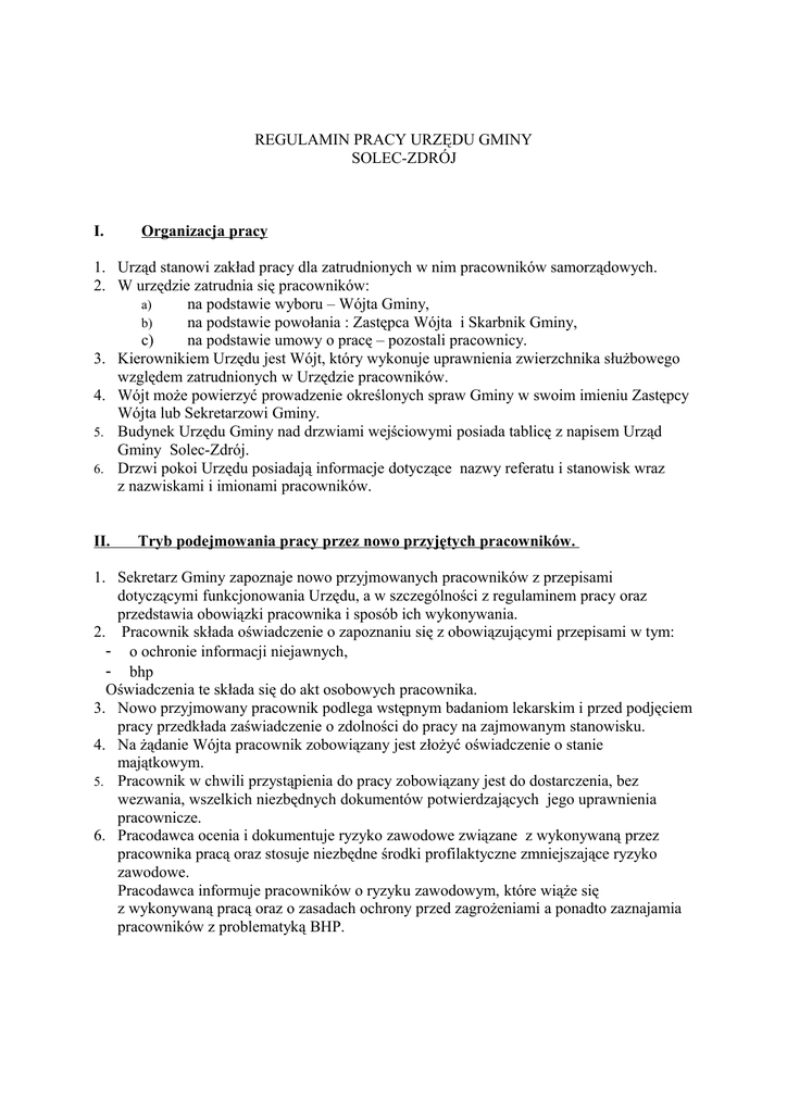 REGULAMIN PRACY URZĘDU GMINY SOLEC-ZDRÓJ I. Organizacja pracy 1. Urząd stanowi zakład pracy dla zatrudnionych w nim pracowników samorządowych. 2. W urzędzie zatrudnia się pracowników: a) na podstawie wyboru – Wójta Gminy, b) na podstawie powołania : Zastępca Wójta i Skarbnik Gminy, c) na podstawie umowy o pracę – pozostali pracownicy. 3. Kierownikiem Urzędu jest Wójt, który wykonuje uprawnienia zwierzchnika służbowego względem zatrudnionych w Urzędzie pracowników. 4. Wójt może powierzyć prowadzenie określonych spraw Gminy w swoim imieniu Zastępcy Wójta lub Sekretarzowi Gminy. 5. Budynek Urzędu Gminy nad drzwiami wejściowymi posiada tablicę z napisem Urząd Gminy Solec-Zdrój. 6. Drzwi pokoi Urzędu posiadają informacje dotyczące nazwy referatu i stanowisk wraz z nazwiskami i imionami pracowników. II. Tryb podejmowania pracy przez nowo przyjętych pracowników. 1. Sekretarz Gminy zapoznaje nowo przyjmowanych pracowników z przepisami dotyczącymi funkcjonowania Urzędu, a w szczególności z regulaminem pracy oraz przedstawia obowiązki pracownika i sposób ich wykonywania. 2. Pracownik składa oświadczenie o zapoznaniu się z obowiązującymi przepisami w tym: - o ochronie informacji niejawnych, - bhp Oświadczenia te składa się do akt osobowych pracownika. 3. Nowo przyjmowany pracownik podlega wstępnym badaniom lekarskim i przed podjęciem pracy przedkłada zaświadczenie o zdolności do pracy na zajmowanym stanowisku. 4. Na żądanie Wójta pracownik zobowiązany jest złożyć oświadczenie o stanie majątkowym. 5. Pracownik w chwili przystąpienia do pracy zobowiązany jest do dostarczenia, bez wezwania, wszelkich niezbędnych dokumentów potwierdzających jego uprawnienia pracownicze. 6. Pracodawca ocenia i dokumentuje ryzyko zawodowe związane z wykonywaną przez pracownika pracą oraz stosuje niezbędne środki profilaktyczne zmniejszające ryzyko zawodowe. Pracodawca informuje pracowników o ryzyku zawodowym, które wiąże się z wykonywaną pracą oraz o zasadach ochrony przed zagrożeniami a ponadto zaznajamia pracowników z problematyką BHP. III. Warunki przebywania na terenie Urzędu w czasie pracy i po jej zakończeniu. 1. Każdy pracownik Urzędu posiada wyznaczone miejsce pracy na którym przebywa w czasie pracy. 2. Poza normalnym czasem pracy przebywanie w Urzędzie jest dopuszczalne: po uprzednim zgłoszeniu przełożonemu takiej konieczności, na polecenie przełożonego. 3. Pracownicy są informowani o osobach posiadających klucze do budynku Urzędu. IV. Wyposażenie pracowników w narzędzia i materiały, w odzież i obuwie oraz środki ochrony indywidualnej i osobistej. 1. W chwili podjęcia pracy pracownik otrzymuje niezbędne do jej wykonania materiały i sprzęt. Materiały i sprzęt podlegają uzupełnieniu lub wymianie w razie ich zużycia w czasie zatrudnienia. 2. Za powierzone materiały i sprzęt pracownik ponosi odpowiedzialność. Po zakończeniu pracy do obowiązków pracownika należy zabezpieczenie dokumentów i drobnego wyposażenia poprzez zamknięcie biurek, szaf i sejfów. Pracownik jest zobowiązany do zamknięcia okien i drzwi pokoju. 3. Z pobranych materiałów i sprzętu pracownik winien rozliczyć się w chwili rozwiązania stosunku pracy. 4. Wyniesienie materiałów i sprzętu poza teren Urzędu wymaga zgody bezpośredniego przełożonego. 5. Odzież, obuwie robocze i środki ochrony indywidualnej przysługują pracownikom na zasadach określonych w odrębnej dyspozycji Wójta Gminy. V. Czas pracy. 1. Czasem pracy jest czas, w którym pracownik pozostaje do dyspozycji pracodawcy w zakładzie pracy lub innym miejscu wyznaczonym do wykonywania pracy 2. Czas pracy pracowników zatrudnionych w Urzędzie na stanowiskach urzędniczych nie może przekraczać 40 godzin na tydzień i osiem godzin dziennie. Rozkład czasu pracy tych pracowników obejmuje czas od: - 7¹5 - 15¹5. 3. W przypadku kierowców zatrudnionych w Urzędzie Gminy może mieć zastosowanie system zadaniowego czasu pracy. 4. Czas pracy pracowników zatrudnionych na stanowiskach pomocniczych i obsługi wynosi 8 godzin na dobę i 40 godziny tygodniowo. 5. Praca wykonywana poza normalnym czasem pracy stanowi pracę w godzinach. nadliczbowych. Praca taka jest dopuszczalna na zasadach i w przypadkach wskazanych w przepisach odrębnych. 6. Każdy pracownik ma prawo do 15 minut przerwy w ciągu dnia pracy. 7. Czas pracy Wójta określony jest wymiarem zadań. 8. Każdy pracownik jest obowiązany po przybyciu do pracy podpisać listę obecności. 9. Pracownik może być zwolniony od pracy na czas niezbędny dla załatwienia różnych spraw osobistych. Zwolnienia udziela kierownik zakładu pracy, gdy zachodzi nieunikniona i należycie uzasadniona potrzeba takiego zwolnienia. Za czas zwolnienia od pracy pracownikowi przysługuje wynagrodzenie jeżeli odpracował czas zwolnienia. 10. W Urzędzie Gminy prowadzony jest rejestr wyjść w czasie pracy, w którym odnotowuje się godzinę wyjścia i powrotu do miejsca pracy. 11. Rokrocznie w miesiącu styczniu Wójt Gminy informuje pracowników i mieszkańców Gminy o dodatkowych dniach wolnych od pracy w danym roku. Informacja ta umieszczana jest na tablicy ogłoszeń. VI. Odpowiedzialność porządkowa pracowników. 1. Za nieprzestrzeganie przez pracownika samorządowego ustalonego porządku, regulaminu pracy, przepisów bezpieczeństwa i higieny pracy oraz przepisów przeciwpożarowych pracodawca stosuje następujące kary porządkowe: - upomnienie, - naganę, - karę pieniężną. 2. Zasady odpowiedzialności i tryb postępowania określają stosowane przepisy kodeksu pracy. VII. Nagrody i wyróżnienia. Kierownik Urzędu może w ramach posiadanych środków na wynagrodzenia tworzyć fundusz nagród z przeznaczeniem na nagrody dla pracowników, przyznawane w oparciu o regulamin wynagradzania. 2. Odpis zawiadomienia o przyznaniu nagrody lub wyróżnienia składa się do akt osobowych pracowników. 1. VII