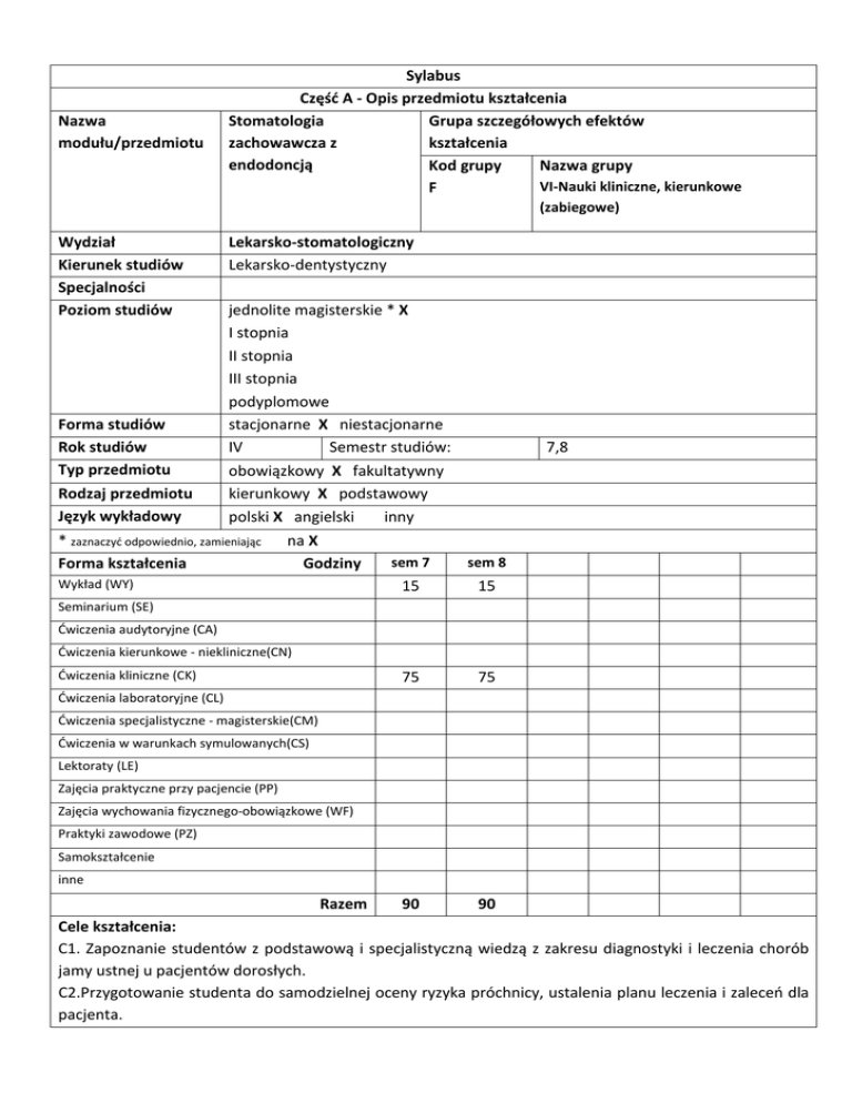 Nazwa modułu/przedmiotu Sylabus Część A - Opis przedmiotu kształcenia Stomatologia Grupa szczegółowych efektów zachowawcza z kształcenia endodoncją Kod grupy Nazwa grupy VI-Nauki kliniczne, kierunkowe F (zabiegowe) Wydział Kierunek studiów Specjalności Poziom studiów Lekarsko-stomatologiczny Lekarsko-dentystyczny jednolite magisterskie * X I stopnia II stopnia III stopnia podyplomowe Forma studiów stacjonarne X niestacjonarne Rok studiów IV Semestr studiów: Typ przedmiotu obowiązkowy X fakultatywny Rodzaj przedmiotu kierunkowy X podstawowy Język wykładowy inny polski X angielski * zaznaczyć odpowiednio, zamieniając na X sem 7 sem 8 Forma kształcenia Godziny Wykład (WY) 15 15 7,8 Seminarium (SE) Ćwiczenia audytoryjne (CA) Ćwiczenia kierunkowe - niekliniczne(CN) Ćwiczenia kliniczne (CK) 75 75 90 90 Ćwiczenia laboratoryjne (CL) Ćwiczenia specjalistyczne - magisterskie(CM) Ćwiczenia w warunkach symulowanych(CS) Lektoraty (LE) Zajęcia praktyczne przy pacjencie (PP) Zajęcia wychowania fizycznego-obowiązkowe (WF) Praktyki zawodowe (PZ) Samokształcenie inne Razem Cele kształcenia: C1. Zapoznanie studentów z podstawową i specjalistyczną wiedzą z zakresu diagnostyki i leczenia chorób jamy ustnej u pacjentów dorosłych. C2.Przygotowanie studenta do samodzielnej oceny ryzyka próchnicy, ustalenia planu leczenia i zaleceń dla pacjenta. C3.Przygotowanie studenta do leczenia odtwórczego ubytków twardych tkanek zębów próchnicowego i niepróchnicowego pochodzenia oraz leczenia endodontycznego. C4. Zapoznanie studentów z implikacjami postępowania stomatologicznego u pacjenta obciążonego chorobą systemową. C5. Zapoznanie studenta z problematyką promocji zdrowia, projektowaniem i realizowaniem programów profilaktycznych. Macierz efektów kształcenia dla modułu/przedmiotu w odniesieniu do metod weryfikacji zamierzonych efektów kształcenia oraz formy realizacji zajęć: Metody weryfikacji Forma zajęć osiągnięcia Numer efektu Numer efektu Student, który zaliczy dydaktycznyc zamierzonych kształcenia kształcenia moduł/przedmiot h efektów kształcenia przedmiotowego kierunkowego wie/umie/potrafi W 01 F.W.2 W02 F.W.2 W03 F.W.7 W04 F.W.7 W05 F.W.7 W06 F.W.8 W07 F.W.7 W08 F.W.13 W09 F.W.22 Definiuje sposób komunikacji z pacjentem i motywację Zna zasady postępowania profilaktyczno-leczniczego w chorobach narządu żucia Zna zasady postępowania w chorobach twardych tkanek zęba pochodzenia próchnicowego i niepróchnicowego Zna zasady minimalnie inwazyjnego leczenia Zna zasady postępowania w chorobach miazgi Zna zasady postępowania w chorobach tkanek okołowierzchołkowych Zna wskazania do ponownego leczenia kariologicznego i endodontycznego Zna wskazania i przeciwwskazania do wykonania zabiegów w zakresie stomatologii estetycznej Zna i rozumie wzajemny związek stanu zdrowotnego (formujące i podsumowujące) ** wpisz symbol Odpowiedź ustna (F), test (P) WY,CK Odpowiedź ustna (F), test (P) WY,CK Odpowiedź ustna(F), test (P) CK Odpowiedź ustna(F), test (P) Odpowiedź ustna(F), test (P) Odpowiedź ustna(F), test (P) WY,CK Odpowiedź ustna(F), test (P) CK Odpowiedź ustna(F), test (P) WY,CK Odpowiedź ustna(F), test (P) WY,CK WY,CK WY,CK U01 F.U1 U02 F.U2 U03 F.U3 U04 F.U7. U05 F.U8. U06 F.U18. U07 F.U13. K01 K 01 K02 K02 K03 K03 jamy ustnej z chorobami systemowymi Przeprowadza wywiad lekarski z pacjentem lub jego rodziną Przeprowadza badanie fizykalne pacjenta i potrafi zinterpretować wyniki badań Wyjaśniania pacjentowi istotę jego dolegliwości, ustala sposób leczenia potwierdzony świadomą zgodą pacjenta oraz rokowanie Potrafi ustalić wskazania i przeciwskazania do wykonania zabiegu stomatologicznego Określa ryzyko i wybiera optymalne metody zapobiegania rozwojowi chorób jamy ustnej Ustala i prowadzi leczenie próchnicy, chorób miazgi i tkanek okołowierzchołkowych Prowadzi bieżącą dokumentację pacjenta, kieruje na badania lub leczenie specjalistyczne stomatologiczne i ogólnomedyczne Współpracuje w grupie profesjonalistów, w środowisku wielokulturowym i wielonarodowościowym Kreuje zasady koleżeństwa zawodowego i współpracy z przedstawicielami innych zawodów w zakresie ochrony zdrowia Aktywnie uczestniczy w Ocena kliniczna, obserwacja (F) CK Ocena kliniczna, obserwacja (F) CK Ocena kliniczna, obserwacja (F) CK Ocena kliniczna, obserwacja (F) WY, CK Ocena kliniczna, obserwacja (F) CK Ocena kliniczna, obserwacja (F) WY, CK Ocena kliniczna, obserwacja (F) CK Obserwacja (F) CK Obserwacja (F) CK Obserwacja (F) CK promocji zdrowia jamy ustnej ** WY - wykład; SE - seminarium; CA - ćwiczenia audytoryjne; CN - ćwiczenia kierunkowe (niekliniczne); CK - ćwiczenia kliniczne; CL -ćwiczenia laboratoryjne; CM – ćwiczenia specjalistyczne (mgr); CS - ćwiczenia w warunkach symulowanych; LE - lektoraty; zajęcia praktyczne przy pacjencie - PP; WF - zajęcia wychowania fizycznego (obowiązkowe); PZ- praktyki zawodowe; SK - samokształcenie Proszę oznaczyć krzyżykami w skali 1-3 jak powyższe efekty lokują państwa zajęcia w działach: przekaz wiedzy, umiejętności czy kształtowanie postaw np.: Wiedza + + + Umiejętności + ++ Postawy +++ Nakład pracy studenta (bilans punktów ECTS): Forma nakładu pracy studenta Obciążenie studenta (h) (udział w zajęciach, aktywność, przygotowanie sprawdzenie, itp.) sem 7 sem 8 1. Godziny kontaktowe 90 90 2. Czas pracy własnej studenta Sumaryczne obciążenie pracy studenta 90 90 Punkty ECTS za moduł/przedmiotu 3 3 Uwagi Treść zajęć: (proszę wpisać hasłowo tematykę poszczególnych zajęć z podziałem na formę zajęć dydaktycznych, pamiętając, aby przekładała się ona na zamierzone efekty kształcenia) Ćwiczenia – semestr 7 Ćwiczenie 1 Ćwiczenie 2 Ćwiczenie 3 Ćwiczenie 4 Ćwiczenie 5 Ćwiczenie 6 Ćwiczenie 7 Ćwiczenie 8 Ćwiczenie 9 Wprowadzenie do ćwiczeń klinicznych, omówienie regulaminu i warunków zaliczenia; Motywacja pacjenta-zasadnicza rola pa