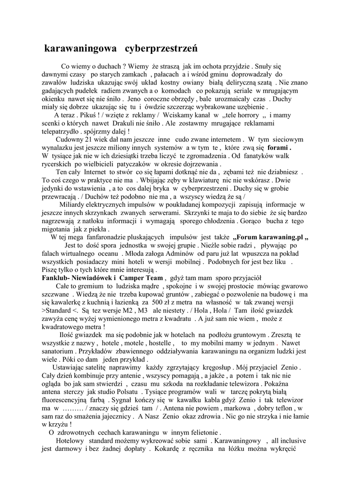 karawaningowa cyberprzestrzeń Co wiemy o duchach ? Wiemy Ŝe straszą jak im ochota przyjdzie . Snuły się dawnymi czasy po starych zamkach , pałacach a i wśród gminu doprowadzały do zawałów ludziska ukazując swój układ kostny owiany białą deliryczną szatą . Nie znano gadających pudełek radiem zwanych a o komodach co pokazują seriale w mrugającym okienku nawet się nie śniło . Jeno coroczne obrzędy , bale urozmaicały czas . Duchy miały się dobrze ukazując się tu i ówdzie szczerząc wybrakowane uzębienie . A teraz . Pikuś ! / wzięte z reklamy / Wciskamy kanał w ,,tele horrory ,, i mamy scenki o których nawet Drakuli nie śniło . Ale zostawmy mrugające reklamami telepatrzydło . spójrzmy dalej ! Cudowny 21 wiek dał nam jeszcze inne cudo zwane internetem . W tym sieciowym wynalazku jest jeszcze miliony innych systemów a w tym te , które zwą się forami . W tysiące jak nie w ich dziesiątki trzeba liczyć te zgromadzenia . Od fanatyków walk rycerskich po wielbicieli patyczaków w okresie dojrzewania . Ten cały Internet to stwór co się łapami dotknąć nie da , zębami teŜ nie dziabniesz . To coś czego w praktyce nie ma . Wbijając zęby w klawiaturę nic nie wskórasz . Dwie jedynki do wstawienia , a to cos dalej bryka w cyberprzestrzeni . Duchy się w grobie przewracają . / Duchów teŜ podobno nie ma , a wszyscy wiedzą Ŝe są / Miliardy elektrycznych impulsów w poukładanej kompozycji zapisują informacje w jeszcze innych skrzynkach zwanych serwerami. Skrzynki te maja to do siebie Ŝe się bardzo nagrzewają z natłoku informacji i wymagają sporego chłodzenia . Gorąco bucha z tego migotania jak z piekła . W tej mega fanfaronadzie pluskających impulsów jest takŜe ,,Forum karawaning.pl ,, Jest to dość spora jednostka w swojej grupie . Nieźle sobie radzi , pływając po falach wirtualnego oceanu . Młoda załoga Adminów od paru juŜ lat wpuszcza na pokład wszystkich posiadaczy mini hoteli w wersji mobilnej . Podobnych for jest bez liku . Piszę tylko o tych które mnie interesują . Fanklub- Niewiadówek i Camper Team , gdyŜ tam mam sporo przyjaciół Całe to gremium to ludziska mądre , spokojne i w swojej prostocie mówiąc gwarowo szczwane . Wiedzą Ŝe nie trzeba kupować gruntów , zabiegać o pozwolenie na budowę i ma się kawalerkę z kuchnią i łazienką za 500 zł z metra na własność w tak zwanej wersji >Standard <. Są tez wersje M2 , M3 ale niestety . / Hola , Hola / Tam ilość gwiazdek zawyŜa cenę wyŜej wymienionego metra z kwadratu . A juŜ sam nie wiem , moŜe z kwadratowego metra ! Ilość gwiazdek ma się podobnie jak w hotelach na podłoŜu gruntowym . Zresztą te wszystkie z nazwy , hotele , motele , hostelle , to my mobilni mamy w jednym . Nawet sanatorium . Przykładów zbawiennego oddziaływania karawaningu na organizm ludzki jest wiele . Póki co dam jeden przykład . Ustawiając satelitę naprawimy kaŜdy zgrzytający kręgosłup . Mój przyjaciel Zenio . Cały dzień kombinuje przy antenie , wszyscy pomagają , a jakŜe , a potem i tak nic nie ogląda bo jak sam stwierdzi , czasu mu szkoda na rozkładanie telewizora . Pokaźna antena sterczy jak studio Polsatu . Tysiące programów wali w tarczę pokrytą białą fluorescencyjną farbą . Sygnał kończy się w kawałku kabla gdyŜ Zenio i tak telewizor ma w ……… / znaczy się gdzieś tam / . Antena nie powiem , markowa , dobry teflon , w sam raz do smaŜenia jajecznicy . A Nasz Zenio okaz zdrowia . Nic go nie strzyka i nie łamie w krzyŜu ! O zdrowotnych cechach karawaningu w innym felietonie . Hotelowy standard moŜemy wykreować sobie sami . Karawaningowy , all inclusive jest darmowy i bez Ŝadnej dopłaty . Kokardę z ręcznika na łóŜku moŜna wykręcić samemu i jesteśmy dolara do przodu . Wystarczą dobre zakupy i przyjaźnie nastawiona Ŝonka lub inna koleŜanka z grupy . Napoje i tak mamy w swoim zasięgu pod własną lodówkową kuratelą Zrobienie drinka to nie problem , wszystko zaleŜy od wyobraźni , naszych i sąsiadów zasobów i wcale do tego nie potrzeba barmana Ŝonglującego butelkami . / drugi dolar zostaje w kieszeni / W przyszłym sezonie dokładam jeszcze jedną gwiazdkę do Swojej przyczepki .Zafunduję sobie jedwabną pościel ! . A co ! Nie wiem dlaczego te nasze fora maja w nazwie słowo : carawaning , kamper , itp. . Etymologia tych słów jest trochę dziwna i tajemnicza . Jest to materiał na inny ciekawy felieton . Powinniśmy zwać się np. ,,Polski Związek Mobilnych Hotelarzy,, albo ,,Zrzeszenie Polskich Hoteli na kołach ,, Dodałem słowo ,,mobilny gdyŜ jest pewna róŜnica miedzy hotelem na gruncie stałym a naszymi brykającymi na kółeczkach salonie bez własnej parceli Nasze własnościowe lokale maja jedną wadę . Mamy tylko jedno piętro i to na samym dole o nazwie parter . Zaraz ktoś się oburzy i będzie udowadniał Ŝe sypialniana wnęka nad szoferka to mansarda . No dobra ! Więcej jak do półtora pietra nie podskoczymy. Brak wind , basenów rekompensuje ciągle zmieniający się widok za oknem z naszego hotelowego apartamentu. NajwaŜniejsze z tego wszystkiego jest to : Ŝe zwykły mieszkaniec noclegowni pozostaje zawsze anonimowy . Jest on tylko gościem . A my potrafimy odbierać na tej samej fali . Jak nazwać to formowe zbiorowisko osobowości ? Mini miasteczkiem , duŜą wioską , a moŜe rodziną . Tylko , taką bez koligacji wujków i ciotek ? Siedzimy w tych serwerach bez materialnego ciała jak te wyblakłe elektroniczne duchy . Od czasu do czasu pisząc post wzywamy wszystkich do spotkania aby się zmaterializować . Trzy tysiączki mieszkańców tego rodzinnego grodu to oczywiście bzdura . Większość mieszkańców wymarła zaraz po urodzeniu lub wyjechała i wszelki duch po nich zaginął . Czynni mieszkańcy Ŝyją , klepią posty dobrze i prosperują w tej społeczności .Jedni mniej , inni więcej . A jest ona róŜna , róŜnista i dziwić się nie ma czemu . Jasiek 