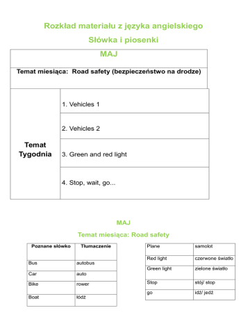 Rozkład materiału z języka angielskiego Słówka i piosenki MAJ Temat miesiąca: Road safety (bezpieczeństwo na drodze) 1. Vehicles 1 2. Vehicles 2 Temat Tygodnia 3. Green and red light 4. Stop, wait, go... MAJ Temat miesiąca: Road safety Poznane słówko Tłumaczenie Bus autobus Car auto Bike rower Boat łódź Plane samolot Red light czerwone światło Green light zielone światło Stop stój/ stop go idź/ jedź Zabawa ruchowa: Plane, plane I go by plane Bike, bike I go by bike Boat, boat I go by boat Car, car I go by car Now, let's make a bus PIOSENKA The Wheels on the bus The wheels on the bus go round and round round and round round and round The wheels on the bus go round and round All day long WIERSZ The door on the bus goes open and shut I ride my little bike Open and shut, open and shut When I see a green light The door on the bus goes open and shut When red is a the top I know that i must stop! All day long The baby on the bus goes wah, wah, wah wah, wah , wah. Wah, wah, wah The baby on the bus goes wah, wah, wah All day long Przygotowała: Marta Klak-Raburska