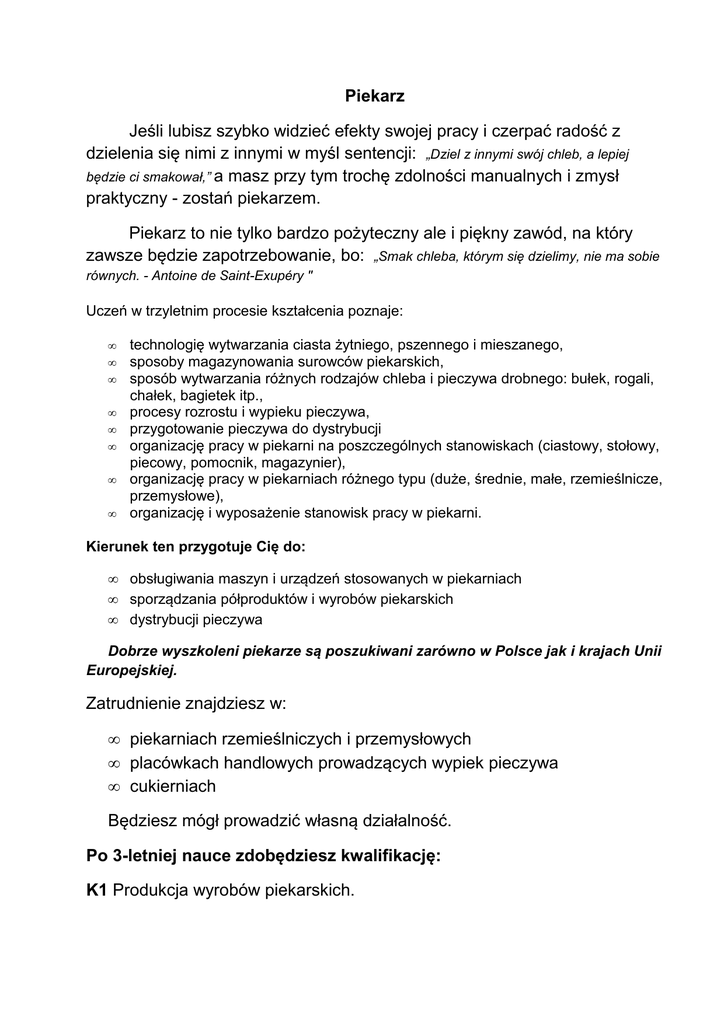Piekarz Jeśli lubisz szybko widzieć efekty swojej pracy i czerpać radość z dzielenia się nimi z innymi w myśl sentencji: „Dziel z innymi swój chleb, a lepiej będzie ci smakował,” a masz przy tym trochę zdolności manualnych i zmysł praktyczny - zostań piekarzem. Piekarz to nie tylko bardzo pożyteczny ale i piękny zawód, na który zawsze będzie zapotrzebowanie, bo: „Smak chleba, którym się dzielimy, nie ma sobie równych. - Antoine de Saint-Exupéry " Uczeń w trzyletnim procesie kształcenia poznaje: • • • • • • • • technologię wytwarzania ciasta żytniego, pszennego i mieszanego, sposoby magazynowania surowców piekarskich, sposób wytwarzania różnych rodzajów chleba i pieczywa drobnego: bułek, rogali, chałek, bagietek itp., procesy rozrostu i wypieku pieczywa, przygotowanie pieczywa do dystrybucji organizację pracy w piekarni na poszczególnych stanowiskach (ciastowy, stołowy, piecowy, pomocnik, magazynier), organizację pracy w piekarniach różnego typu (duże, średnie, małe, rzemieślnicze, przemysłowe), organizację i wyposażenie stanowisk pracy w piekarni. Kierunek ten przygotuje Cię do: • • • obsługiwania maszyn i urządzeń stosowanych w piekarniach sporządzania półproduktów i wyrobów piekarskich dystrybucji pieczywa Dobrze wyszkoleni piekarze są poszukiwani zarówno w Polsce jak i krajach Unii Europejskiej. Zatrudnienie znajdziesz w: • piekarniach rzemieślniczych i przemysłowych • placówkach handlowych prowadzących wypiek pieczywa • cukierniach Będziesz mógł prowadzić własną działalność. Po 3-letniej nauce zdobędziesz kwalifikację: K1 Produkcja wyrobów piekarskich.