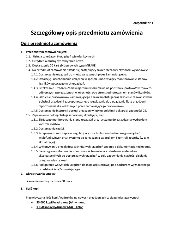Załącznik nr 1 Szczegółowy opis przedmiotu zamówienia Opis przedmiotu zamówienia 1. Przedmiotem zamówienia jest: 1.1. Usługa dzierżawy 6 urządzeń wielofunkcyjnych. 1.2. Urządzenia muszą być fabrycznie nowe. 1.3. Dostarczenie 70 kart zbliżeniowych typu MIFARE. 1.4. Na przedmiot zamówienia składa się następujący zakres rzeczowy czynności wykonawcy: 1.4.1.Dostarczenie urządzeń do miejsc wskazanych przez Zamawiającego. 1.4.2.Instalację i uruchomienie urządzeń w sposób umożliwiający monitorowanie stanów liczników poszczególnych urządzeń. 1.4.3.Przekazanie urządzeń Zamawiającemu w dzierżawę na podstawie protokołów zdawczoodbiorczych sporządzonych w obecności obu stron z odnotowaniem stanów liczników. 1.4.4.Szkolenie pracowników Zamawiającego z zakresu obsługi oraz szkolenie zaawansowane z obsługi urządzeń i zaproponowanego rozwiązania do zarządzania flotą urządzeń i raportowania dla wskazanych przez Zamawiającego pracowników. 1.4.5.Dostarczenie instrukcji obsługi urządzeń w języku polskim i deklaracji zgodności CE. 1.5. Zapewnienie pełnej obsługi serwisowej składającej się z: 1.5.1.Bieżącego monitorowania stanu urządzeń oraz systemu do zarządzania wydrukiem i kontroli kosztów. 1.5.2.Dostarczaniu części. 1.5.3.Przeprowadzaniu napraw, regulacji oraz kontroli stanu technicznego urządzeń wielofunkcyjnych oraz systemu do zarządzania wydrukiem i kontroli kosztów (w tym aktualizacje). 1.5.4.Wykonywaniu przeglądów technicznych urządzeń zgodnie z dokumentacją techniczną. 1.5.5.Bieżącego monitorowania stanu zużycia tonerów oraz dostawie materiałów eksploatacyjnych do dostarczonych urządzeń w celu zapewniania ciągłości działania usługi na własny koszt. 1.5.6.Podłączenie wszystkich urządzeń do instalacji sieciowej pod nadzorem wyznaczonego przedstawiciela Zamawiającego. 2. Okres trwania umowy Zawarcie umowy na okres 30 m-cy. 3. Ilość kopii Przewidywana ilość kopii/wydruków na nowych urządzeniach w ciągu miesiąca wynosi: 33 000 kopii/wydruków (A4) – mono 1 650 kopii/wydruków (A4) – kolor 4. Wymagania dotyczące urządzeń: 4.1. Maszyny cyfrowe, jednej marki, ujednolicone pod względem obsługi przez użytkownika. 4.2. Wyposażone w kolorowy, dotykowy panel sterujący, wymagana obsługa w języku polskim. 4.3. Wykonawca może zaoferować urządzenia o lepszych właściwościach, parametrach i cechach od określonych przez Zamawiającego. 5. Gwarancja Kompleksowa Usługa Systemu Wydruku (urządzenia, system do zarządzania i raportowania, usługa serwisowa) objęta jest gwarancją przez cały okres trwania umowy. Opis urządzeń wielofunkcyjnych 1. Grupa I – urządzenia wielofunkcyjne z modułem czytnika katy zbliżeniowej typu MIFARE – 4 szt. Lp. Charakterystyka kopiarki Opis wymaganego parametru 1 Prędkość kopiowania Min. 25 stron A4/min mono 2 Rozdzielczość kopiowania 600 dpi x 600 dpi 3 Pamięć Min. 1GB RAM 4 Dysk twardy Min. 60 GB 5 Format oryginału od A5 do A3 6 Format kopii od A5 do A3 7 Czas nagrzewania Max. 20 sekund 8 Czas pierwszej kopii Max. 5 sekund 9 Kopiowanie ciągłe od 1 do 999 10 Gramatura papieru Min. 52 – 209 g/m2 11 Natężenie obrazu automatyczne i ręczne 12 Zoom 25% do 400% , w krokach co 1 % 13 Inne funkcje tryb foto, auto wybór papieru, auto przełączanie podajników papieru , auto start, kierunkowa zmiana rozmiaru, rotacja obrazu, sortowanie elektroniczne 14 Kody dostępu dla użytkowników Min. 999 kodów 15 Podajniki na papier Min. Trzy uniwersalne zasobniki na papier od A5 do A3 na min. 1200 arkuszy 80 g/m2, 16 Obsługa Min. Kolorowy panel LCD w języku polskim 17 Dupleks Min. od A5 do A3 o gramaturze 64-105 g/m2, automatyczny 18 Automatyczny podajnik dokumentów dwustronnych Min. 100 arkuszy 80 g/m2 19 Podstawa pod urządzenie Metalowa na kółkach, zintegrowana z urządzeniem 20 Gniazdo USB Bezpośrednie drukowanie z nośników pamięci typu PENDRIVE Lp. Charakterystyka drukarki Opis wymaganego parametru 1 Prędkość Min. 25 strony A4 /min mono 2 Jakość druku Min. 1200 dpi x600 dpi 3 Pamięć Min. 1GB RAM 4 Języki opisu strony Min. XPS, PCL6 i PostScript3 5 Interfejs USB 2.0 High Speed 6 Zgodne systemy operacyjne Windows 2000 /XP /2003 Server/2008 Server/ Vista (32/64 bit), Windows 8/8.1 (32/64 bit), Windows 10 (32/64 bit), Mac OS X, Novel Netware (NDPS), Citrix, SAP, AS/400/, Linux/Unix 7 Karta sieciowa Ethernet 10/100 BaseTX Lp. Charakterystyka skanera Opis wymaganego parametru 1 Prędkość skanowania Min. 55 skanów A4/min /mono Min. 40 skanów A4/min / kolor 2 Formaty plików JPG, wielostronicowy/jednostronny TIFF, XPS/PDF, Slim PDF, zabezpieczony PDF, przeszukiwany PDF, edytowanie plików DOC, XLS, RTF, TXT 3 Typ oryginałów tekst, foto, tekst+foto, 4 Rozmiar oryginałów od A5 do A3 5 Rozdzielczość Min. 600 dpi, kolor (8 bit) lub mono 2. Grupa II – urządzenia wielofunkcyjne z modułem czytnika katy zbliżeniowej typu MIFARE – 2 szt. Lp. Charakterystyka kopiarki Opis wymaganego parametru 1 Prędkość kopiowania Min. 25 stron A4/min kolor Min. 25 stron A4/min mono 2 Rozdzielczość kopiowania 600 dpi x 600 dpi 3 Pamięć operacyjna Min. 1,5 GB RAM 4 Dysk twardy Min. 160 GB 5 Format oryginału od A5 do A3 6 Format kopii od A5 do A3 7 Czas nagrzewania Max. 30 sekund 8 Czas pierwszej kopii Max. 10 sekund 9 Kopiowanie ciągłe od 1 do 999 10 Gramatura papieru Min. 64 – 280 g/m2 11 Natężenie obrazu automatyczne i ręczne 12 Zoom 25% do 400% , w krokach co 1 % 13 Inne funkcje tryb foto, auto wybór papieru, auto przełączanie podajników papieru , auto start, kierunkowa zmiana rozmiaru, rotacja obrazu, sortowanie elektroniczne 14 Kody dostępu dla użytkowników Min. 999 kodów 15 Podajniki na papier Min. Trzy uniwersalne zasobniki na papier od A5 do A3 na min. 1200 arkuszy 80 g/m2, 16 Obsługa Min. Kolorowy panel LCD w języku polskim 17 Dupleks Min. od A5 do A3 o gramaturze 64-256 g/m2, automatyczny 18 Automatyczny podajnik 