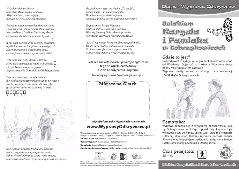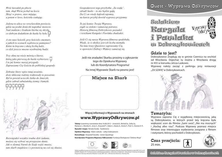 Wróć kawałek po płocie tam, skąd Wicia jechał na kocie. Skręć w prawo, staw mijając, a potem w lewo, kościoła szukając. Gospodarzowi tego przybytku „Za szafą”, zdradź hasło – to nie będzie gafą. Da Ci on wtedy kuferek tajemny, na karcie przybij dowód wyprawy przyjemny. Jedyna to ulica we wrocławskim powiecie, gdzie na jezdni doniczki napotkać możecie. Nad znakiem z lizakiem literka się skryła, co dobrym dodatkiem do hasła by była. 6 To już koniec Twojej Wyprawy, siądź za stołem i zamawiaj potrawy. Historię filmową Dobrzykowic poznałeś i ścieżkami Kargula i Pawlaka chadzałeś. A oto nasz kościół, przy kościele cmentarz, o jakich to scenach wędrowcze pamiętasz? Które tu kręcono z dużą liczbą ludzi, co dziś jeszcze mocno wyobraźnię budzi. Jeśli Ci się nasza Wyprawa filmowa spodobała, Wiedz, że w okolicy jest ich liczba niemała. Na inne trasy Questowe zapraszamy Cię, w opowieści Dobrej i Widawy zanurzaj się. Trzy okna na wieży mówią o literze, którą jako pierwszą do hasła wybierzesz. 1 I to już koniec naszej przygody. Zapraszamy Cię Gościu do pobliskiej gospody. Zebrane litery wpisz tutaj uważnie, dwie skłócone rodziny traktowały to poważnie. Był to powód ucieczki Jaśka do Ameryki, gdzie zabrał zabużańską ziemię i kamyki. Jeśli nie znalazłeś Skarbu prosimy o zgłoszenie tego do Opiekuna Wyprawy lub do Koordynatora Programu! Na innej Wyprawie Skarb na pewno jest! Quest - Wyprawa Odkrywców Szlakiem Kargula i Pawlaka w Dobrzykowicach Gdzie to jest? Dobrzykowice znajdują się w gminie Czernica na wschód od Wrocławia. Dojechać tu można z Wrocławia drogą nr 455 w kierunku Jelcza-Laskowic. Wyprawę należy zacząć z parkingu przy restauracji „ZA SZAFĄ” w Dobrzykowicach. Miejsce na Skarb 1 2 3 4 5 6 Więcej informacji o Wyprawach na stronach www.WyprawyOdkrywcow.pl Teksty: Uczestnicy warsztatów dnia 16.08.2012 – Urszula B., Michał Sz., Zofia Sz., Martyna J., Monika K., Jerzy S., Krzysztof T., Adam J., Beata A., Aneta F., Piotr S., Dorota D. P., Rysunki i mapa: Renata Durda - Tyszkiewicz Opiekun Wyprawy: Adam Jaskuła – sołtys Dobrzykowic Konsultacje: Krzysztof Szustka - trener Questingu Rozwiązałeś wszakże trudne dziś zadanie, możesz się wybrać na przepyszne danie. Jak w słynnej Narnii do Szafy wejść musisz, tam skarb znajdziesz i z pewnością na coś się skusisz. Koordynator Programu Wyprawy Odkrywców: Fundacja Ekologiczna “Zielona Akcja” Tematyka: Wyprawa zapozna Cię z wyjątkową miejscowością, jaką są Dobrzykowice, w których przed laty kręcona była większość scen do filmów „Sami swoi”, „Nie ma mocnych” i „Kochaj albo rzuć”. Podczas Wyprawy poznasz miejsca filmowe oraz interesujące wydarzenia związane z filmem i statystami, którzy pochodzili z Dobrzykowic. Czas przejścia: 25 min. Ulotka współfinansowana ze środków Unii Europejskiej w ramach Programu Rozwoju Obszarów Wiejskich na lata 2007-2013, oś IV LEADER, działanie 431 “Funkcjonowanie Lokalnej grupy działania, nabywanie umiejętności i aktywizacja”. Instytucja Zarządzająca Programem Rozwoju Obszarów Wiejskich na lata 2007-2013 - Ministerstwo Rolnictwa i Rozwoju Wsi. Szlakiem Kargula i Pawlaka w Dobrzykowicach Jak szukać skarbu? Podczas Wyprawy należy szukać liter, które pomogą Ci dotrzeć do Skarbu. Aby rozwiązać hasło, trzeba pozbierać wszystkie litery i hasło wypowiedzieć głośno w restauracji. Kiedy znajdziesz skrzynię ze skarbem, podziel się wrażeniami w Księdze Wyprawy, a pieczęć odbij na swojej karcie jako dowód ukończenia szlaku. Odłóż skrzynię na miejsce dla innych Odkrywców. Dobrzykowice to wioska duża i bardzo miła, tu kiedyś ekipa filmowa dobrze się bawiła. Tutaj „Sami swoi” od dawna mieszkają i na Wyprawę gorąco zapraszają. Potem za czternastoma płotu słupami przejdź Wrocławską ostrożnie dużymi susami. Wracał tą drogą Wicia z targu w spiekocie, dumny na koniu – a nie na zwykłym kocie. W latach siedemdziesiątych ubiegłego wieku trzy znane filmy nakręcili tu człowieku. „Sami Swoi” był pierwszym z trylogii całej, a po jego sukcesie historię kręcili dalej. A Ty prosto jak ten piękny kuń wzdłuż pięciu kasztanów nadal sobie suń. Dalej mijasz szkoły mury, której kolor jest ponury. Z parkingu ruszaj żwawo kolego w kierunku sklepu spożywczego. Przed sklepem zaraz w Krótką skręć i do stawu w te dyrdy pędź. Przed laty dzieci z niej w filmie grały, kiedy już zajęć w szkole nie miały. Za szkołą na ulicy Szkolnej ładny domek stoi. Czwarta litera numeru do skarbu dojść Ci pozwoli. 3 Dalej Szkolną wypręż nogi, dojdziesz teraz do rozłogi. Tuż obok biały mur stoi na pamiątkę filmu Sami Swoi. Na skrzyżowaniu uważnie na to bacz, nad głową Kargula 18-tą literkę patrz. 5 Dalej za starą stodołą kolego trzeba szybko skręcić w lewo. U Kargula i Pawlaka na okrągło była draka. To o jajko, to o kota, podchodzili wciąż do płota. Cała wieś tu do stawu się kiedyś zleciała, gdy krowa Kargulowa w Kosmos wyleciała. Dzieci z balii migiem wyskoczyły i prawie w jasny dzień się potopiły. Graffiti na murze Ci wskaże, gdzie Kargul i Pawlak żyli sobie w parze. Rozbijali dzbanki i darli koszule, by się potem godzić razem czule. Nad stawem z nazwy drzewa płaczącego weź drugą literkę do hasła kolego. 2 Zostawiając za sobą drzewo, musisz zaraz skręcić w lewo. Na pamiątkę tych wielkich wydarzeń tablicę z granitu przybili włodarze. Z dolnego wiersza pierwsza litera część rozwiązania pewnikiem zawiera. START Witamy Cię w naszej wiosce Gościu drogi, przygotuj na Wyprawę swoje żwawe nogi. Na parkingu „Za Szafą” pozostaw samochód i chodź dzisiaj z nami na filmowy pochód. Szlakiem Kargula i Pawlaka w Dobrzykowicach Szlakiem Kargula i Pawlaka w Dobrzykowicach 4 Szlakiem Kargula i Pawlaka w Dobrzykowicach