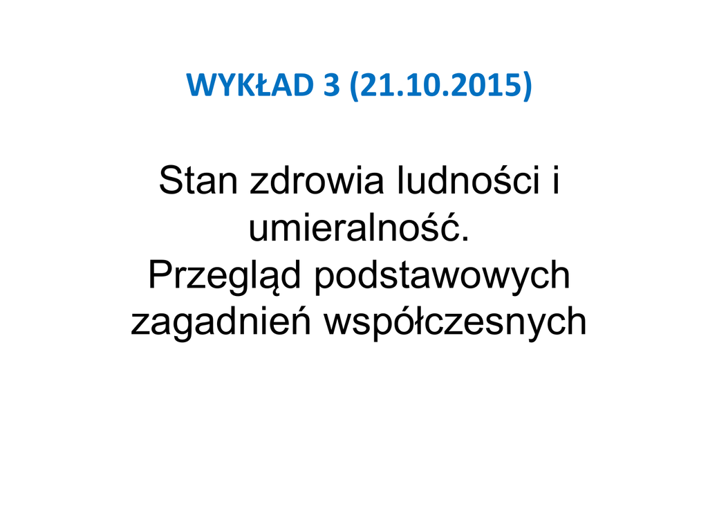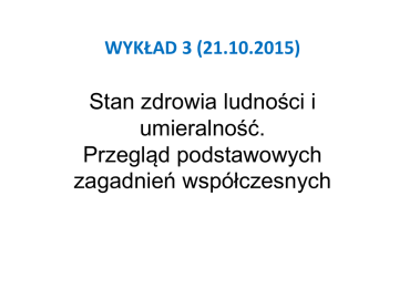 WYKŁAD 3 (21.10.2015) Stan zdrowia ludności i umieralność. Przegląd podstawowych zagadnień współczesnych Umieralność – miary 1. Ogólny współczynnik zgonów (ang. crude death rate) obliczany na podstawie poniższego wzoru: Dt CDRt C Lt 2. Cząstkowe współczynniki (ang. age-specific death rates) DRx ,t Dx ,t Lx ,t zgonów 1000 według wieku Umieralność – miary cd Tablice trwania życia (Laboratorium 2): statystyki: 1. prawdopodobieństwo zgonu (qx) 2.oczekiwane dalsze trwanie życia (ex), w tym oczekiwana długość trwania życia (e0) 2. funkcja przeżycia (Sx) Umieralność – miary cd Współczynnik zgonów niemowląt Współczynnik zgonów = niemowląt Liczba zgonów niemowląt poniżej 1 roku życia Liczba urodzeń żywych 1000 Przejście epidemiologiczne (Omran 1971; Olshansky, Ault, 1986,1998) za: Okólski, 2004 Przemiany umieralności wynikające ze zmian zachorowalności i przyczyn zgonów, fazy zmian: Era plag do około połowy XVII wieku – cykliczne występowanie ostrych epidemii, natężenie zgonów podlegających silnym wahaniom cyklicznym z powodu epidemii i głodu; e0 (20,40) lat Era chorób zakaźnych i pasożytniczych do pierwszej połowy wieku XIX: dominowały choroby zakaźne, pasożytnicze i infekcje, stopniowe wygasanie pandemii chorób zakaźnych; systematyczny spadek wahań cyklicznych; e0 wzrasta do 50 lat, Era chorób zwyrodnieniowych do połowy XX wieku: choroby układu krążenia, nowotworowe, e0 powyżej 50 lat; dalszy spadek natężenia zgonów, Era chorób związanych z wiekiem podeszłym – druga połowa XX wieku (Olshansky, Ault, 1986) Trzy etapy przejścia epidemiologicznego Udział zgonów Choroby zakaźne, głód i wojny Wycofywanie się pandemii III i IV Choroby niezakaźne Choroby zakaźne e0 =około 30 lat Dominacja chorób zwyrodnieniowych i starczych e0 wzrosło z poniżej 30 lat do ponad 50 lat umieralność stabilizuje się na bardzo niskim poziomie Przyczyny spadku umieralności i przejścia epidemiologicznego 1. Poprawa warunków: • żywnościowych • odzieżowych • mieszkaniowych (w tym ogrzewania) 2. Poprawa warunków sanitarnych w miastach: • systemu kanalizacji, • dystrybucji wody pitnej • usuwania odpadów 3. Rozwój opieki medycznej: • w okresie przedporodowym, poporodowym i prenatalnym • środki zapobiegawcze epidemiom (kwarantanny, szczepienia, izolacja pacjentów w szpitalach) 4. Stosowanie nowych lekarstw • Antybiotyków od lat 1940. • Insektycydów (DDT) od lat 1950. 5. Rozprzestrzenianie się zaawansowanych technologii medycznych do leczenia chorób układu krążenia i nowotworów. Ewolucja związana z rolnictwem (tzw.technophysioevolution) 1986 Nagroda Nobla w 1993 roku Hipotezy dotyczące przemian zdrowia związana ze wzrostem oczekiwanej długości trwania życia Hipoteza kompresji zachorowalności/chorobowości (compression of morbidity) zakłada, iż czas choroby i występowania niepełnosprawności przed śmiercią ulega skróceniu. Teoria ekspansji zachorowalności (expansion of morbidity) zakłada, że odsetek osób niepełnosprawnych (w złym stanie zdrowia) pozostanie na stałym poziomie lub wzrośnie. Hipoteza równowagi (dynamic equilibrium) zakłada, że wzrost oczekiwanego trwania życia może pociągać za sobą spadek trwania życia z poważną niepełnosprawnością na rzecz wydłużenia trwania życia z umiarkowaną i lekką niepełnosprawnością. Przegląd współczesnych zagadnień w badaniach umieralności 1. Różnice w umieralności i stanie zdrowia między płciami 2. Zachorowalność w całym cyklu życia jednostki 3. Czy istnieje maksymalna długość trwania życia? Literatura 1. J.Z.Holzer, Demografia, PWE, Warszawa 2003, podrozdział 7.4 2. J. Kurkiewicz, 2010, Procesy demograficzne i metody ich analizy. Uniwersytet Ekonomiczny w Krakowie, Kraków (rozdział 5) 3. I.E.Kotowska, W.Wróblewska, Zmiany demograficzne – pomiar procesów i ocena skutków społeczno-ekonomicznych, w: T.Panek (red.), 2007, Statystyka społeczna, PWE, Warszawa 4. Wróblewska W., 2009, Sumaryczne miary stanu zdrowia populacji, Studia Demograficzne 1-2(153-154). 5. Caselli, G., J. Vallin, G. Wunsch, 2006, Demography. Analysis and Synthesis. Elsevier, vol. 2, rozdział 57 6. Trwanie życia w 2009, GUS, 2010. 7. Rocznik Demograficzny 2009, GUS, 2010. 8. Eurostat, 2009, Health statistics – Atlas on mortality in the European Union 9. Pison G., 2010, Child mortality reduction: a contrasting picture across the world, Population& Societies No. 463 10. Oeppen J. i J. W. Vaupel, 2002, Broken limits to life expectancy, Science, 296(5570) 11. Meslé F., 2004, Life expectancy: a female advantage under threat?, Population& Societies No. 402