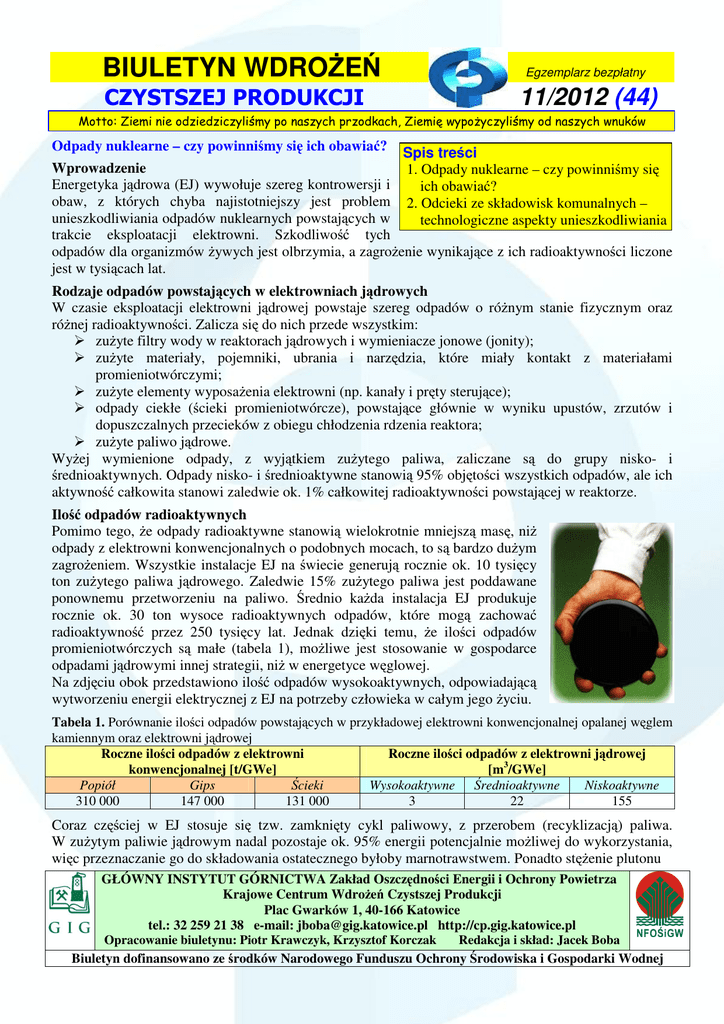 BIULETYN WDROśEŃ CZYSTSZEJ PRODUKCJI Egzemplarz bezpłatny 11/2012 (44) Motto: Ziemi nie odziedziczyliśmy po naszych przodkach, Ziemię wypoŜyczyliśmy od naszych wnuków Odpady nuklearne – czy powinniśmy się ich obawiać? Spis treści Wprowadzenie 1. Odpady nuklearne – czy powinniśmy się Energetyka jądrowa (EJ) wywołuje szereg kontrowersji i ich obawiać? obaw, z których chyba najistotniejszy jest problem 2. Odcieki ze składowisk komunalnych – unieszkodliwiania odpadów nuklearnych powstających w technologiczne aspekty unieszkodliwiania trakcie eksploatacji elektrowni. Szkodliwość tych odpadów dla organizmów Ŝywych jest olbrzymia, a zagroŜenie wynikające z ich radioaktywności liczone jest w tysiącach lat. Rodzaje odpadów powstających w elektrowniach jądrowych W czasie eksploatacji elektrowni jądrowej powstaje szereg odpadów o róŜnym stanie fizycznym oraz róŜnej radioaktywności. Zalicza się do nich przede wszystkim: zuŜyte filtry wody w reaktorach jądrowych i wymieniacze jonowe (jonity); zuŜyte materiały, pojemniki, ubrania i narzędzia, które miały kontakt z materiałami promieniotwórczymi; zuŜyte elementy wyposaŜenia elektrowni (np. kanały i pręty sterujące); odpady ciekłe (ścieki promieniotwórcze), powstające głównie w wyniku upustów, zrzutów i dopuszczalnych przecieków z obiegu chłodzenia rdzenia reaktora; zuŜyte paliwo jądrowe. WyŜej wymienione odpady, z wyjątkiem zuŜytego paliwa, zaliczane są do grupy nisko- i średnioaktywnych. Odpady nisko- i średnioaktywne stanowią 95% objętości wszystkich odpadów, ale ich aktywność całkowita stanowi zaledwie ok. 1% całkowitej radioaktywności powstającej w reaktorze. Ilość odpadów radioaktywnych Pomimo tego, Ŝe odpady radioaktywne stanowią wielokrotnie mniejszą masę, niŜ odpady z elektrowni konwencjonalnych o podobnych mocach, to są bardzo duŜym zagroŜeniem. Wszystkie instalacje EJ na świecie generują rocznie ok. 10 tysięcy ton zuŜytego paliwa jądrowego. Zaledwie 15% zuŜytego paliwa jest poddawane ponownemu przetworzeniu na paliwo. Średnio kaŜda instalacja EJ produkuje rocznie ok. 30 ton wysoce radioaktywnych odpadów, które mogą zachować radioaktywność przez 250 tysięcy lat. Jednak dzięki temu, Ŝe ilości odpadów promieniotwórczych są małe (tabela 1), moŜliwe jest stosowanie w gospodarce odpadami jądrowymi innej strategii, niŜ w energetyce węglowej. Na zdjęciu obok przedstawiono ilość odpadów wysokoaktywnych, odpowiadającą wytworzeniu energii elektrycznej z EJ na potrzeby człowieka w całym jego Ŝyciu. Tabela 1. Porównanie ilości odpadów powstających w przykładowej elektrowni konwencjonalnej opalanej węglem kamiennym oraz elektrowni jądrowej Roczne ilości odpadów z elektrowni Roczne ilości odpadów z elektrowni jądrowej konwencjonalnej [t/GWe] [m3/GWe] Popiół Gips Ścieki Wysokoaktywne Średnioaktywne Niskoaktywne 310 000 147 000 131 000 3 22 155 Coraz częściej w EJ stosuje się tzw. zamknięty cykl paliwowy, z przerobem (recyklizacją) paliwa. W zuŜytym paliwie jądrowym nadal pozostaje ok. 95% energii potencjalnie moŜliwej do wykorzystania, więc przeznaczanie go do składowania ostatecznego byłoby marnotrawstwem. Ponadto stęŜenie plutonu GŁÓWNY INSTYTUT GÓRNICTWA Zakład Oszczędności Energii i Ochrony Powietrza Krajowe Centrum WdroŜeń Czystszej Produkcji Plac Gwarków 1, 40-166 Katowice tel.: 32 259 21 38 e-mail: [email protected] http://cp.gig.katowice.pl Opracowanie biuletynu: Piotr Krawczyk, Krzysztof Korczak Redakcja i skład: Jacek Boba Biuletyn dofinansowano ze środków Narodowego Funduszu Ochrony Środowiska i Gospodarki Wodnej w wypalonym paliwie jest tak duŜe, Ŝe moŜna z niego wytwarzać nowe paliwo bez wzbogacania uranu. Nowe paliwo zwane MOX (mixed oxide - mieszanina tlenków) wykonuje się z mieszaniny tlenków uranu wzbogaconego i plutonu. Takie paliwo pracuje w wielu elektrowniach jądrowych w Europie, Rosji i Japonii. Ilość odpadów wysokoaktywnych powstających w takim procesie jest bardzo mała, np. w elektrowniach francuskich na roczną pracę reaktora o mocy 1000 MWe przypada około 3 m3 odpadów wysokoaktywnych, a więc około 3 m3/GWe na rok. Co się robi z odpadami radioaktywnymi z elektrowni jądrowych? Wszystkie odpady promieniotwórcze - gazowe, ciekłe oraz stałe są przetwarzane juŜ na terenie elektrowni. Odpady nisko- i średnioaktywne są gromadzone w kilkusetlitrowych beczkach, a następnie przechowywane w magazynach zlokalizowanych na terenie kaŜdej elektrowni (rys. 1) lub we wspólnych magazynach dla wielu elektrowni. System zamykania odpadów radioaktywnych i ich składowania dobiera się do aktywności odpadów i długości czasu, w ciągu którego odpady stanowią potencjalne zagroŜenie dla człowieka i środowiska. Odpady wysokoaktywne są zwykle umieszczane głęboko pod ziemią w tzw. składowiskach Rys. 1. Basen magazynowy w elektrowni jądrowej głębinowych. W systemie tym stosuje się materiały naturalne, tak by układ składowiska geologicznego był maksymalnie podobny do środowiska naturalnego. PoniewaŜ odpady wysokoaktywne umieszczane są głęboko pod ziemią, np. na głębokości 500 m (rys. 2), ich promieniowanie nie ma Ŝadnego negatywnego wpływu na powierzchnię ziemi, bo juŜ kilka metrów gruntu wystarcza, by stało się ono niewykrywalnie małe. ZagroŜenie moŜe powstać jedynie wtedy, gdy woda spowoduje skorodowanie pojemników, a następnie wymyje odpady. Temu jednak zapobiega stosowany obecnie system wielu barier, takich jak: 1. Tworzenie trudno rozpuszczalnych związków chemicznych (koncentratów) wiąŜących izotopy promieniotwórcze. 2. Stosowanie materiału wiąŜącego (np. masy ceramiczne) zestalającego odpady, co zapobiega rozpyleniu, rozsypaniu i wymywaniu substancji promieniotwórczych. 3. Dodatkowe metalowe lub betonowe opakowanie odpadów Rys. 2. Schemat głębokiego składowiska zabezpieczające przed oddziaływ