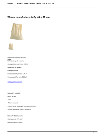 Worki : Worek bawe?niany du?y 40 x 50 cm Worek bawe?niany du?y 40 x 50 cm Ocena: Nie ma jeszcze oceny Cena Ró?nica ceny dla wariantu Cena podstawowa brutto: 4,80 z? Cena netto po rabacie: Cena po rabacie Cena sprzeda?y brutto: 4,80 z? Cena sprzeda?y netto: 3,90 z? Zadaj pytanie o produkt Szczegó?y produktu Nr.Art. XT009 Opis: - Mocny sznurek - Wewn?trzne szwy wyko?czone overlockiem - 40 cm szeroko?ci i 50 cm wysoko?ci Materia?:100% bawe?na Gramatura:ca. 140 g/m² Rozmiar:ca. 40 x 50 cm 1 / 2 Worki : Worek bawe?niany du?y 40 x 50 cm 2 / 2 Powered by TCPDF (www.tcpdf.org)
