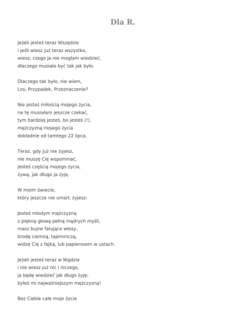 Dla R. Jeżeli jesteś teraz Wszędzie i jeśli wiesz już teraz wszystko, wiesz, czego ja nie mogłam wiedzieć, dlaczego musiało być tak jak było. Dlaczego tak było, nie wiem, Los, Przypadek, Przeznaczenie? Nie jesteś miłością mojego życia, na tę musiałam jeszcze czekać, tym bardziej jesteś, bo jesteś (!), mężczyzną mojego życia dokładnie od tamtego 22 lipca. Teraz, gdy już nie żyjesz, nie muszę Cię wspominać, jesteś częścią mojego życia, żywą, jak długo ja żyję. W moim świecie, który jeszcze nie umarł, żyjesz: Jesteś młodym mężczyzną z piękną głową pełną mądrych myśli, masz bujne falujące włosy, brodę ciemną, tajemniczą, widzę Cię z fajką, lub papierosem w ustach. Jeżeli jesteś teraz w Nigdzie i nie wiesz już nic i niczego, ja będę wiedzieć jak długo żyję: byłeś mi najważniejszym mężczyzną! Bez Ciebie całe moje życie byłoby życiem kogoś, kogo nie znam... Bez tamtego wschodu słońca nad Polską wszystkie kolejne wschody słońca byłyby zupełnie inne zupełnie gdzie indziej, w zupełnie innym życiu kogoś zupełnie innego. Dziękuje Ci, mój drugi mężu, którego byłam drugą żoną, za wszystko, co było dzięki Tobie w moim życiu pierwsze i co pamięta się najgłębiej. I przepraszam, przepraszam, że nie umiałam być inna. * Zurich, 18 grudnia 2016