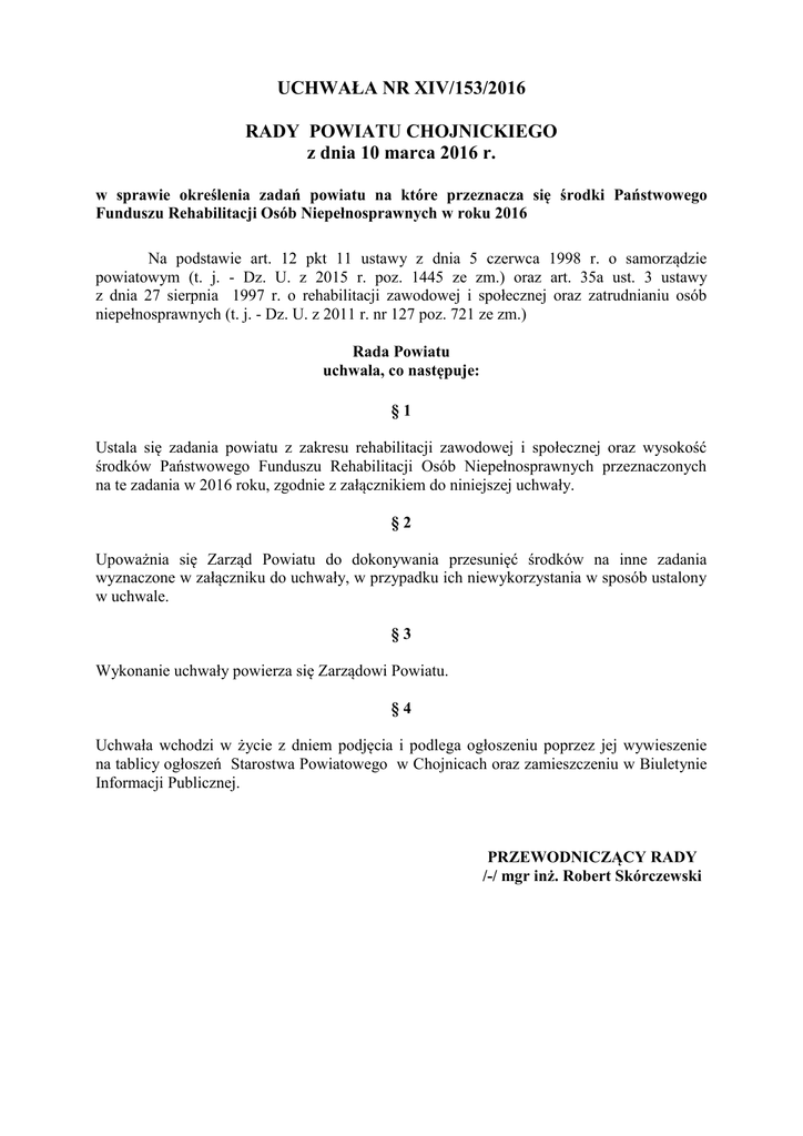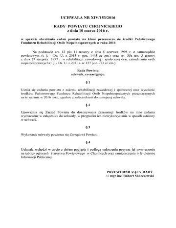 UCHWAŁA NR XIV/153/2016 RADY POWIATU CHOJNICKIEGO z dnia 10 marca 2016 r. w sprawie określenia zadań powiatu na które przeznacza się środki Państwowego Funduszu Rehabilitacji Osób Niepełnosprawnych w roku 2016 Na podstawie art. 12 pkt 11 ustawy z dnia 5 czerwca 1998 r. o samorządzie powiatowym (t. j. - Dz. U. z 2015 r. poz. 1445 ze zm.) oraz art. 35a ust. 3 ustawy z dnia 27 sierpnia 1997 r. o rehabilitacji zawodowej i społecznej oraz zatrudnianiu osób niepełnosprawnych (t. j. - Dz. U. z 2011 r. nr 127 poz. 721 ze zm.) Rada Powiatu uchwala, co następuje: §1 Ustala się zadania powiatu z zakresu rehabilitacji zawodowej i społecznej oraz wysokość środków Państwowego Funduszu Rehabilitacji Osób Niepełnosprawnych przeznaczonych na te zadania w 2016 roku, zgodnie z załącznikiem do niniejszej uchwały. §2 Upoważnia się Zarząd Powiatu do dokonywania przesunięć środków na inne zadania wyznaczone w załączniku do uchwały, w przypadku ich niewykorzystania w sposób ustalony w uchwale. §3 Wykonanie uchwały powierza się Zarządowi Powiatu. §4 Uchwała wchodzi w życie z dniem podjęcia i podlega ogłoszeniu poprzez jej wywieszenie na tablicy ogłoszeń Starostwa Powiatowego w Chojnicach oraz zamieszczeniu w Biuletynie Informacji Publicznej. PRZEWODNICZĄCY RADY /-/ mgr inż. Robert Skórczewski UZASADNIENIE Środki finansowe przypadające powiatom zostały wyliczone na podstawie rozporządzenia Rady Ministrów z dnia 13 maja 2003 roku z późniejszymi zmianami w sprawie algorytmu przekazywania środków Państwowego Funduszu Rehabilitacji Osób Niepełnosprawnych samorządom wojewódzkim i powiatowym. W ramach przyznanych środków na 2016 rok Rada Powiatu określa realizowane zadania oraz ustala wysokość kwot na ich realizację. W podziale środków należy uwzględnić zadania zrealizowane do dnia podjęcia uchwały. Zarząd Państwowego Funduszu Rehabilitacji Osób Niepełnosprawnych podjął uchwałę nr 4/2016 w sprawie podziału środków PFRON na 2016 rok na realizację zadań przez samorządy wojewódzkie i powiatowe. Środki dla powiatu chojnickiego na zadania z zakresu rehabilitacji zawodowej i społecznej zostały określone w wysokości 2.662.390,00 zł z uwzględnieniem zadań z art. 35a ust. 1 pkt 8 – w wysokości 1.599.600,00 zł, (kwota ta przewidziana jest dla 100 uczestników, trzech warsztatów terapii zajęciowej w naszym powiecie). Załącznik do uchwały określa wysokość środków przeznaczonych na realizację poszczególnych zadań, biorąc pod uwagę: doświadczenia z lat poprzednich oraz bilans już złożonych wniosków przez osoby niepełnosprawne. Załącznik do uchwały nr XIV/153/2016 Rady Powiatu Chojnickiego z dnia 10 marca 2016 r. Podział środków PFRON na zadania z zakresu rehabilitacji zawodowej i społecznej na rok 2016 Lp. Zadania REHABILITACJA ZAWODOWA realizowana przez Powiatowy Urząd Pracy 1. 2. 3. 4. a) b) c) d) 5. 6. 7. 8. finansowanie wydatków na instrumenty lub usługi rynku pracy określone w ustawie o promocji zatrudnienia i instytucjach rynku pracy, w odniesieniu do osób niepełnosprawnych zarejestrowanych jako poszukujące pracy nie pozostające w zatrudnieniu ( Art. 11) przyznawanie jednorazowych środków dla osób niepełnosprawnych na podjęcie działalności gospodarczej, rolniczej albo na wniesienie wkładu do spółdzielni socjalnej (Art. 12a) udzielanie dofinansowania do wysokości 50% oprocentowania kredytów bankowych, zaciągniętych przez osoby niepełnosprawne na kontynuowanie działalności gospodarczej lub prowadzenie własnego lub dzierżawionego gospodarstwa rolnego ( Art. 13) dokonywanie zwrotu kosztów poniesionych przez pracodawcę: adaptacji pomieszczeń zakładu pracy do potrzeb osób niepełnosprawnych, w szczególności poniesionych w związku z przystosowaniem tworzonych lub istniejących stanowisk pracy dla tych osób, stosownie do potrzeb wynikających z ich niepełnosprawności ( Art. 26 ust. 1 pkt 1) adaptacji lub nabycia urządzeń ułatwiających osobie niepełnosprawnej wykonywanie pracy lub funkcjonowanie w zakładzie pracy ( Art. 26 ust. 1 pkt 1b) zakup i autoryzacji oprogramowania na użytek pracowników niepełnosprawnych oraz urządzeń technologii wspomagających lub przystosowanych do potrzeb wynikających z ich niepełnosprawności ( Art. 26 ust. 1 pkt 1c) rozpoznania przez służby medycyny tych potrzeb, o których mowa w pkt. 1-1c ust 1 art. 26 (Art. 26 ust. 1 pkt 2) dokonywanie zwrotu kosztów zatrudnienia pracowników pomagających pracownikowi niepełnosprawnemu w pracy ( Art. 26d) dokonywanie zwrotu kosztów wyposażenia stanowiska pracy osoby niepełnosprawnej (Art. 26e) finansowanie kosztów szkolenia i przekwalifikowania zawodowego osób niepełnosprawnych ( Art. 40 ) dokonywanie zwrotu kosztów poniesionych przez pracodawcę na szkolenia zatrudnionych osób niepełnosprawnych ( Art. 41) REHABILITACJA SPOŁECZNA realizowana przez Powiatowe Centrum Pomocy Rodzinie 9. 10. 11. 12. 13. 14. dofinansowanie uczestnictwa osób niepełnosprawnych i ich opiekunów w turnusach rehabilitacyjnych ( Art. 35a ust. 1 pkt 7a ) dofinansowanie sportu, kultury, rekreacji i turystyki osób niepełnosprawnych ( Art. 35a ust. 1 pkt 7b) dofinansowanie zaopatrzenia w sprzęt rehabilitacyjny, przedmioty ortopedyczne i środki pomocnicze przyznawane osobom niepełnosprawnym na podstawie odrębnych przepisów (Art. 35a ust. 1 pkt 7c) dofinansowanie likwidacji barier architektonicznych, w komunikowaniu się i technicznych, w związku z indywidualnymi potrzebami osób niepełnosprawnych ( Art. 35a ust. 1 pkt 7d ) dofinansowanie usług tłumacza języka migowego lub tłumacza –przewodnika ( Art. 35a ust. 1 pkt 7f ) dofinansowanie kosztów tworzenia warsztatów terapii zajęciowej (Art. 35a ust. 1 pkt 8) Zadania zlecane fundacjom oraz organizacjom pozarządowym zgodnie z art. 36 Zobowiązania dotyczące dofinansowania kosztów działalności warsztatów terapii zajęciowej. Ogółem P