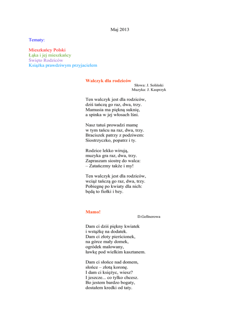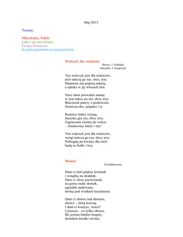 Maj 2013 Tematy: Mieszkańcy Polski Łąka i jej mieszkańcy Święto Rodziców Książka prawdziwym przyjacielem Walczyk dla rodziców Słowa: J. Soliński Muzyka: J. Kasprzyk Ten walczyk jest dla rodziców, dziś tańczą go raz, dwa, trzy. Mamusia ma piękną suknię, a spinka w jej włosach lśni. Nasz tatuś prowadzi mamę w tym tańcu na raz, dwa, trzy. Braciszek patrzy z podziwem: Siostrzyczko, popatrz i ty. Rodzice lekko wirują, muzyka gra raz, dwa, trzy. Zapraszam siostrę do walca: – Zatańczmy także i my! Ten walczyk jest dla rodziców, wciąż tańczą go raz, dwa, trzy. Pobiegnę po kwiaty dla nich: będą to fiołki i bzy. Mamo! D.Gellnerowa Dam ci dziś piękny kwiatek i wstążkę na dodatek. Dam ci złoty pierścionek, na górce mały domek, ogródek malowany, ławkę pod wielkim kasztanem. Dam ci słońce nad domem, słońce – złotą koronę. I dam ci księżyc, wiesz? I jeszcze... co tylko chcesz. Bo jestem bardzo bogaty, dostałem kredki od taty.