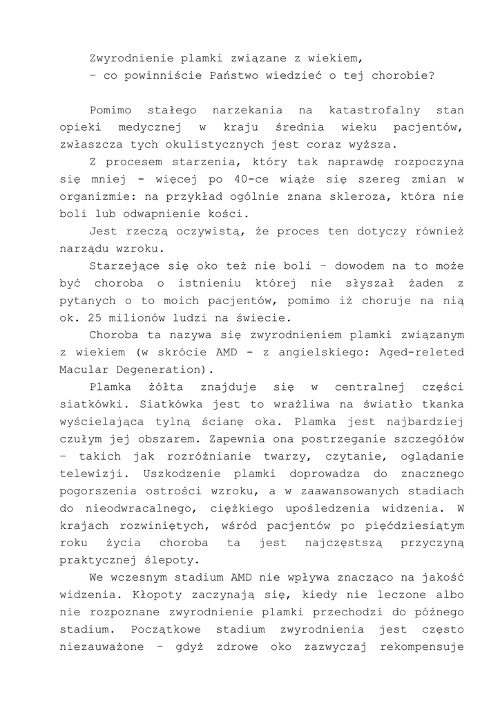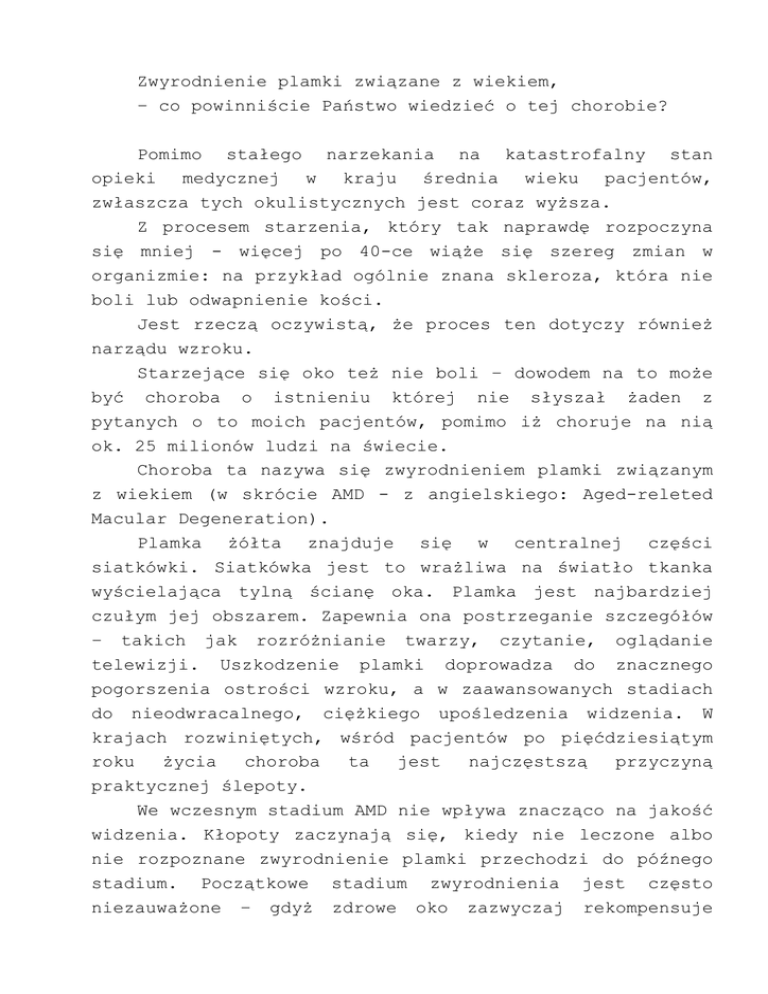 Zwyrodnienie plamki związane z wiekiem, – co powinniście Państwo wiedzieć o tej chorobie? Pomimo stałego narzekania na katastrofalny stan opieki medycznej w kraju średnia wieku pacjentów, zwłaszcza tych okulistycznych jest coraz wyższa. Z procesem starzenia, który tak naprawdę rozpoczyna się mniej - więcej po 40-ce wiąże się szereg zmian w organizmie: na przykład ogólnie znana skleroza, która nie boli lub odwapnienie kości. Jest rzeczą oczywistą, że proces ten dotyczy również narządu wzroku. Starzejące się oko też nie boli – dowodem na to może być choroba o istnieniu której nie słyszał żaden z pytanych o to moich pacjentów, pomimo iż choruje na nią ok. 25 milionów ludzi na świecie. Choroba ta nazywa się zwyrodnieniem plamki związanym z wiekiem (w skrócie AMD - z angielskiego: Aged-releted Macular Degeneration). Plamka żółta znajduje się w centralnej części siatkówki. Siatkówka jest to wrażliwa na światło tkanka wyścielająca tylną ścianę oka. Plamka jest najbardziej czułym jej obszarem. Zapewnia ona postrzeganie szczegółów – takich jak rozróżnianie twarzy, czytanie, oglądanie telewizji. Uszkodzenie plamki doprowadza do znacznego pogorszenia ostrości wzroku, a w zaawansowanych stadiach do nieodwracalnego, ciężkiego upośledzenia widzenia. W krajach rozwiniętych, wśród pacjentów po pięćdziesiątym roku życia choroba ta jest najczęstszą przyczyną praktycznej ślepoty. We wczesnym stadium AMD nie wpływa znacząco na jakość widzenia. Kłopoty zaczynają się, kiedy nie leczone albo nie rozpoznane zwyrodnienie plamki przechodzi do późnego stadium. Początkowe stadium zwyrodnienia jest często niezauważone – gdyż zdrowe oko zazwyczaj rekompensuje pogorszenie widzenia drugiego. W wielu przypadkach choroba ta rozwija się nieco później także w drugim oku w efekcie czego prowadzi do uszkodzenia widzenia obu oczu. W życiu codziennym wyjątkowo rzadko patrzymy jednym okiem. W praktyce okulistycznej zgłoszenie się pacjenta z tego typu schorzeniem wygląda następująco: „Pani doktor! Wczoraj ktoś zadzwonił do drzwi – popatrzyłam przez wizjer – Ja nic nie widzę na to oko!” Później okazuje się, że resztki widzenia pacjent zachował, lecz jest to tak zwane widzenie peryferyczne (obwodowe), natomiast w środku pola widzenia jest większa lub mniejsza ciemna plama. Wykrycie zaś początkowego stadium choroby – kiedy ciemnej plamy jeszcze nie ma, lecz jest tylko zamazany, zniekształcony lub ze zmienionym kolorem obraz w naszych realiach jest rzadkością. Są dwie najczęstsze przyczyny tego stanu rzeczy – pierwsza – brak nawyku profilaktycznego badania narządu wzroku – przynajmniej raz na rok. Szanowni Państwo! Należy pamiętać, jak ważne i pomocne jest wczesne rozpoznawanie choroby. Społeczeństwo poprzez oszczędności na skomplikowanych wypełnieniach powoli zaczyna doceniać role profilaktycznych wizyt u dentysty. Człowiek ma 32 zęby i tylko parę oczu – profilaktyczne badanie narządu wzroku też jest bardzo ważne, nawet jeżeli oko nie boli. Drugą przyczyną braku wczesnego wykrywania tej choroby jest wspomina przeze mnie rekompensacja widzenia chorego oka przez oko zdrowe lub zdrowsze. Jeżeli chodzi o leczenie (postaci wysiękowej) zwyrodnienia plamki – odbywa się ono za pomocą specjalnego lasera o małej energii tak zwaną metodą terapii fotodynamicznej po wprowadzeniu do krwi aktywowanego światłem leku. Bardzo proszę po przeczytaniu tego artykułu zasłonić najpierw lewe oko i popatrzyć na tekst gazety, po czym prawe i zrobić to samo. Jeżeli zauważycie Państwo różnicę w widzeniu pomiędzy jednym a drugim okiem, plamy przed oczami, różnicę w postrzeganiu szczegółów pomiędzy jednym a drugim okiem – wskazana jest wizyta u okulisty. Proszę dbać o swoje oczy i pamiętać: „Oko jest małe, a widzi cały świat!”.