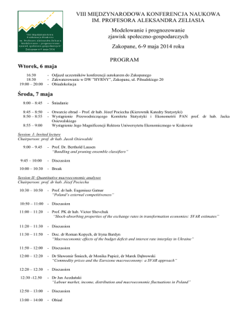 VIII MIĘDZYNARODOWA KONFERENCJA NAUKOWA IM. PROFESORA ALEKSANDRA ZELIASIA Modelowanie i prognozowanie zjawisk społeczno-gospodarczych Zakopane, 6-9 maja 2014 roku PROGRAM Wtorek, 6 maja 16:30 18:30 19:00 – 20:00 - Odjazd uczestników konferencji autokarem do Zakopanego - Zakwaterowanie w DW ”HYRNY”, Zakopane, ul. Piłsudskiego 20 - Obiadokolacja Środa, 7 maja 8:00 – 8:45 - Śniadanie 8:45 – 8:50 8:50 – 8:55 - Otwarcie obrad – Prof. dr hab. Józef Pociecha (Kierownik Katedry Statystyki) - Wystąpienie Przewodniczącego Komitetu Statystyki i Ekonometrii PAN prof. dr hab. Jacka Osiewalskiego Wystąpienie Jego Magnificencji Rektora Uniwersytetu Ekonomicznego w Krakowie 8:55 – 9:00 Session I: Invited lecture Chairperson: prof. dr hab. Jacek Osiewalski 9.00 – 9.45 - Prof. Dr. Berthold Lausen “Bundling and pruning ensemble classifiers” 9:45 – 10:00 - Discussion 10:00 – 10:30 - Break Session II: Quantitative macroeconomic analyses Chairperson: prof. dr hab. Józef Pociecha 10:30 – 10:50 - Prof. dr hab. Eugeniusz Gatnar “Poland’s external competitiveness” 10:50 – 11:00 - Discussion 11:00 – 11:20 - Prof. PK dr hab. Victor Shevchuk “Shock-absorbing properties of the exchange rates in transformation economies: SVAR estimates” 11:20 – 11:30 - Discussion 11:30 – 11:50 - Doc. dr Roman Kopych, dr Iryna Bardyn “Macroeconomic effects of the budget deficit and interest rate interplay in Ukraine” 11:50 – 12:00 - Discussion 12:00 – 12:20 - Dr Sławomir Śmiech, dr Monika Papież, dr Marek Dąbrowski “Commodity prices and the Eurozone macroeconomy: a SVAR approach” 12:20 – 12:30 - Discussion 12:30 -12.50 - Dr Jan Acedański “Labour market, income, distribution and macroeconomic fluctuations in Poland” 12:50 – 13:00 - Discussion 13:00 – 14:00 - Obiad Session III: Contemporary statistical analysis Chairperson: prof. dr hab. Eugeniusz Gatnar 15:00 – 15:20 - Prof. dr hab. Jacek Osiewalski, prof. UEK dr hab. Anna Pajor „Foundations of the harmonic mean estimator of the marginal data density value and the status of Lenk’s correction” 15:20 – 15:30 - Discussion 15:30 – 15:50 - Prof. dr hab. Jan B. Gajda “Non-normality of residuals and regression coefficient tests” 15:50 – 16:00 - Discussion 16:00 – 16:20 - Dr hab. Daniel Kosiorowski, Zygmunt Zawadzki “Computational complexity vs. robustness of a statistical procedure dedicated for online inference on multivariate scatter of economic data stream” 16:20 – 16:30 - Discussion 16:30 – 17:00 - Break Sesja IV: Modelowanie mikroekonometryczne Przewodniczący obrad: prof. dr hab. Andrzej Barczak 17:00 – 17:20 - Prof. dr hab. Jacek Osiewalski, prof. UEK dr hab. Jerzy Marzec „Dwuwymiarowy model zmiennych licznikowych z częściowym cenzurowaniem – ujęcie bayesowskie” 17:20 – 17:30 - Dyskusja 17:30 – 17:50 - Dr Krzysztof Piontek „Przedziałowa estymacja Value-at-Risk i Expected Shortfall w modelach klasy AR-GARCH” 17:50 – 18:00 - Dyskusja 18:00 – 18:20 - Prof. UE dr hab. Andrzej Bąk „Zagnieżdżony model logitowy w badaniach preferencji konsumentów” 18:20– 18:30 - Dyskusja 19:00 – 20:00 - Kolacja Czwartek, 8 maja 8:00 – 8:45 - Śniadanie Sesja V: Wykład na zaproszenie Przewodniczący obrad: prof. dr hab. Józef Pociecha 9:00 – 9:45 - Prof. dr hab. Krystyna Strzała „Pomiar mobilności kapitału – od UIP do hipotezy bliźniaczego deficytu” 9:45 – 10.00 - Dyskusja Sesja VI: Statystyczne metody analiz regionalnych Przewodniczący obrad :prof. dr hab. Anatoliy Pilyavskyy 10:00 – 10:20 - Prof. dr hab. Danuta Strahl, dr hab. Małgorzata Markowska „Wrażliwość na kryzys ekonomiczny regionów UE – klasyfikacja dynamiczna” 10:20 – 10:30 - Dyskusja 10:30 – 10:50 - Prof. US dr hab. Jacek Batóg “Identyfikacja i znaczenie obserwacji nietypowych w modelach konwergencji dochodowej” 10:50 – 11:00 - Dyskusja 11:00 – 11:20 - Dr Marcin Błażejowski, dr Jacek Kwiatkowski “Bayesowskie uśrednianie modeli-pakiet funkcja dla programu Gretl” 11:20 – 11:30 - Dyskusja 11:30 – 12:00 - Przerwa Sesja VII: Badania społeczno-demograficzne Przewodnicząca obrad: Prof. RNDr. Viera Pacakova, PhD. 12:00 – 12:20 - Prof. dr hab. Jadwiga Suchecka, mgr Maciej Jewczak „Metoda kosztów-korzyści w badaniu efektywności programów zdrowotnych” 12:20 – 12:30 - Dyskusja 12:30 – 12:50 - Doc. Dr. Zinaida Palian „Statistical analysis and simulation of the parameters of survival of Ukrainian Population” 12:50 – 13:00 - Dyskusja 13:00 – 13:20 - Dr Alicja Wolny-Dominiak, dr Daniel Sobiecki „Regresja Poissona z efektami stałymi i losowymi w taryfikacji w ubezpieczeniach majątkowych” 13:20 – 13:30 - Dyskusja 13:30 – 14:30 - Sesja plakatowa Dr inż. Tomasz Bartłomowicz „Prognozowanie finansowych szeregów czasowych z wykorzystaniem aproksymanty segmentowej z uzmiennionymi parametrami w pakiecie TSprediction programu R” Prof. UE dr hab. Andrzej Bąk, dr inż. Tomasz Bartłomowicz „Ocena jakości modeli mikroekonometrycznych stosowanych w badaniach preferencji konsumentów” Dr inż. Jacek Białek „Konstrukcja przedziału ufności dla wskaźnika cen towarów i usług konsumpcyjnych” Mgr Justyna Brzezińska „Problem zerowych liczebności w analizie tablic kontyngencji” Dr Marek A. Dąbrowski , dr Justyna Wróblewska „Wstrząsy finansowe jako przyczyna fluktuacji realnego kursu walutowego w Polsce - wyniki badań z wykorzystaniem bayesowskich strukturalnych modeli VAR” Prof. US dr hab. Iwona Foryś, dr Barbara Batóg „Modelowanie aktywności nabywców mieszkań na wybranym rynku lokalnym” Dr Katarzyna Frodyma „Rynek energii ze źródeł odnawialnych w Unii Europejskiej – analiza statystyczna” Dr Wojciech Gamrot „O pewnej regule przerwania obliczeń, dla symulacyjnej oceny prawdopodobieństw inkluzji.” Dr inż. Monika Hadaś-Dyduch „Rozwój rynku produktów strukturyzowanych w kontekście polskiego 
