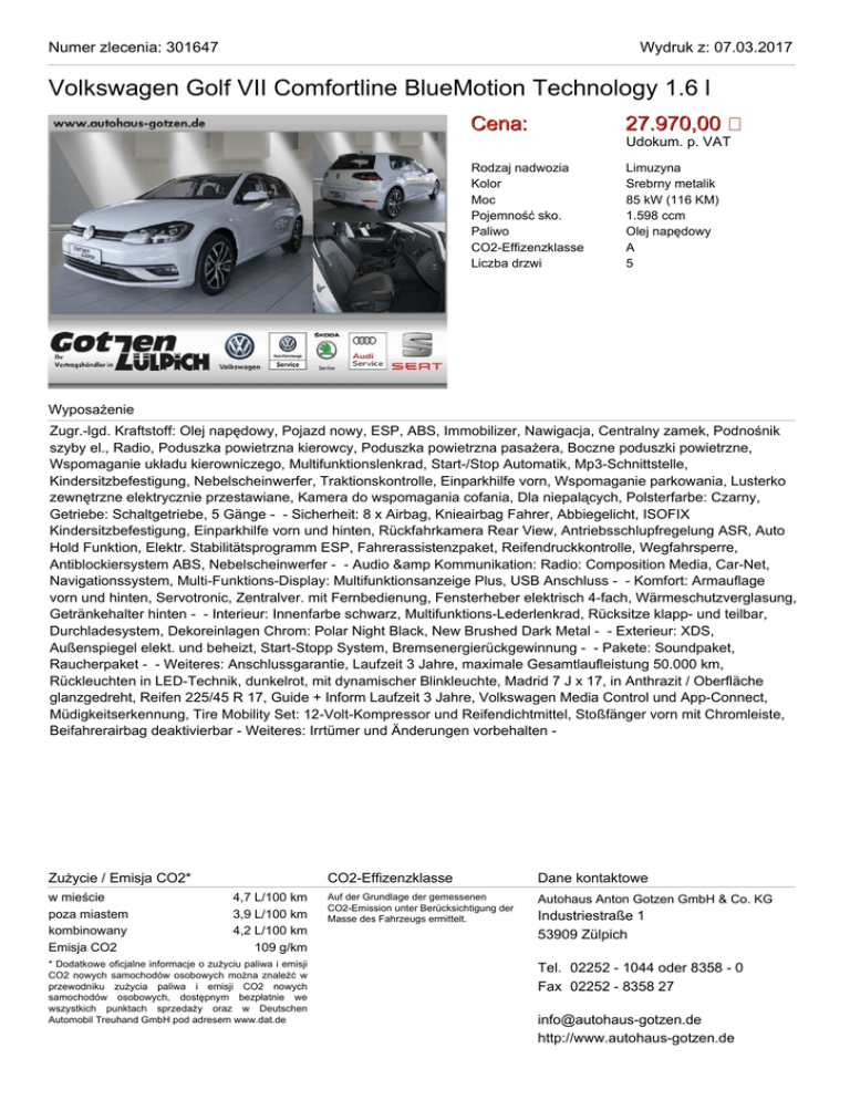 Numer zlecenia: 301647 Wydruk z: 07.03.2017 Volkswagen Golf VII Comfortline BlueMotion Technology 1.6 l Cena: 27.970,00 Rodzaj nadwozia Kolor Moc Pojemność sko. Paliwo CO2-Effizenzklasse Liczba drzwi Limuzyna Srebrny metalik 85 kW (116 KM) 1.598 ccm Olej napędowy A 5 Udokum. p. VAT Wyposażenie Zugr.-lgd. Kraftstoff: Olej napędowy, Pojazd nowy, ESP, ABS, Immobilizer, Nawigacja, Centralny zamek, Podnośnik szyby el., Radio, Poduszka powietrzna kierowcy, Poduszka powietrzna pasażera, Boczne poduszki powietrzne, Wspomaganie układu kierowniczego, Multifunktionslenkrad, Start-/Stop Automatik, Mp3-Schnittstelle, Kindersitzbefestigung, Nebelscheinwerfer, Traktionskontrolle, Einparkhilfe vorn, Wspomaganie parkowania, Lusterko zewnętrzne elektrycznie przestawiane, Kamera do wspomagania cofania, Dla niepalących, Polsterfarbe: Czarny, Getriebe: Schaltgetriebe, 5 Gänge - - Sicherheit: 8 x Airbag, Knieairbag Fahrer, Abbiegelicht, ISOFIX Kindersitzbefestigung, Einparkhilfe vorn und hinten, Rückfahrkamera Rear View, Antriebsschlupfregelung ASR, Auto Hold Funktion, Elektr. Stabilitätsprogramm ESP, Fahrerassistenzpaket, Reifendruckkontrolle, Wegfahrsperre, Antiblockiersystem ABS, Nebelscheinwerfer - - Audio & Kommunikation: Radio: Composition Media, Car-Net, Navigationssystem, Multi-Funktions-Display: Multifunktionsanzeige Plus, USB Anschluss - - Komfort: Armauflage vorn und hinten, Servotronic, Zentralver. mit Fernbedienung, Fensterheber elektrisch 4-fach, Wärmeschutzverglasung, Getränkehalter hinten - - Interieur: Innenfarbe schwarz, Multifunktions-Lederlenkrad, Rücksitze klapp- und teilbar, Durchladesystem, Dekoreinlagen Chrom: Polar Night Black, New Brushed Dark Metal - - Exterieur: XDS, Außenspiegel elekt. und beheizt, Start-Stopp System, Bremsenergierückgewinnung - - Pakete: Soundpaket, Raucherpaket - - Weiteres: Anschlussgarantie, Laufzeit 3 Jahre, maximale Gesamtlaufleistung 50.000 km, Rückleuchten in LED-Technik, dunkelrot, mit dynamischer Blinkleuchte, Madrid 7 J x 17, in Anthrazit / Oberfläche glanzgedreht, Reifen 225/45 R 17, Guide + Inform Laufzeit 3 Jahre, Volkswagen Media Control und App-Connect, Müdigkeitserkennung, Tire Mobility Set: 12-Volt-Kompressor und Reifendichtmittel, Stoßfänger vorn mit Chromleiste, Beifahrerairbag deaktivierbar - Weiteres: Irrtümer und Änderungen vorbehalten - Zużycie / Emisja CO2* w mieście poza miastem kombinowany Emisja CO2 4,7 L/100 km 3,9 L/100 km 4,2 L/100 km 109 g/km * Dodatkowe oficjalne informacje o zużyciu paliwa i emisji CO2 nowych samochodów osobowych można znaleźć w przewodniku zużycia paliwa i emisji CO2 nowych samochodów osobowych, dostępnym bezpłatnie we wszystkich punktach sprzedaży oraz w Deutschen Automobil Treuhand GmbH pod adresem www.dat.de CO2-Effizenzklasse Dane kontaktowe Auf der Grundlage der gemessenen CO2-Emission unter Berücksichtigung der Masse des Fahrzeugs ermittelt. Autohaus Anton Gotzen GmbH & Co. KG Industriestraße 1 53909 Zülpich Tel. 02252 - 1044 oder 8358 - 0 Fax 02252 - 8358 27 [email protected] http://www.autohaus-gotzen.de Numer zlecenia: 301647 Wydruk z: 07.03.2017 Volkswagen Golf VII Comfortline BlueMotion Technology 1.6 l Numer zlecenia: 301647 Wydruk z: 07.03.2017 Volkswagen Golf VII Comfortline BlueMotion Technology 1.6 l