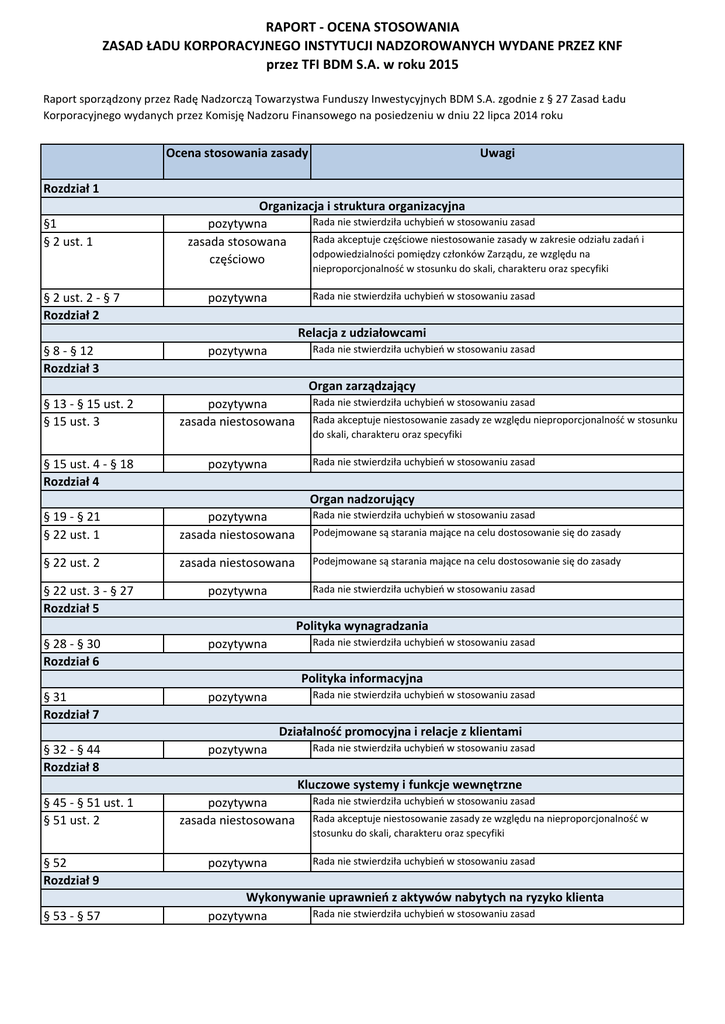 RAPORT - OCENA STOSOWANIA ZASAD ŁADU KORPORACYJNEGO INSTYTUCJI NADZOROWANYCH WYDANE PRZEZ KNF przez TFI BDM S.A. w roku 2015 Raport sporządzony przez Radę Nadzorczą Towarzystwa Funduszy Inwestycyjnych BDM S.A. zgodnie z § 27 Zasad Ładu Korporacyjnego wydanych przez Komisję Nadzoru Finansowego na posiedzeniu w dniu 22 lipca 2014 roku Ocena stosowania zasady Uwagi Rozdział 1 §1 § 2 ust. 1 Organizacja i struktura organizacyjna Rada nie stwierdziła uchybieo w stosowaniu zasad pozytywna Rada akceptuje częściowe niestosowanie zasady w zakresie odziału zadao i zasada stosowana odpowiedzialności pomiędzy członków Zarządu, ze względu na częściowo nieproporcjonalnośd w stosunku do skali, charakteru oraz specyfiki § 2 ust. 2 - § 7 Rozdział 2 Rada nie stwierdziła uchybieo w stosowaniu zasad pozytywna Relacja z udziałowcami § 8 - § 12 Rozdział 3 Rada nie stwierdziła uchybieo w stosowaniu zasad pozytywna Organ zarządzający § 13 - § 15 ust. 2 § 15 ust. 3 pozytywna zasada niestosowana Rada nie stwierdziła uchybieo w stosowaniu zasad § 15 ust. 4 - § 18 Rozdział 4 pozytywna Rada nie stwierdziła uchybieo w stosowaniu zasad Rada akceptuje niestosowanie zasady ze względu nieproporcjonalnośd w stosunku do skali, charakteru oraz specyfiki Organ nadzorujący § 19 - § 21 § 22 ust. 1 pozytywna zasada niestosowana Rada nie stwierdziła uchybieo w stosowaniu zasad § 22 ust. 2 zasada niestosowana Podejmowane są starania mające na celu dostosowanie się do zasady § 22 ust. 3 - § 27 Rozdział 5 Podejmowane są starania mające na celu dostosowanie się do zasady Rada nie stwierdziła uchybieo w stosowaniu zasad pozytywna Polityka wynagradzania § 28 - § 30 Rozdział 6 Rada nie stwierdziła uchybieo w stosowaniu zasad pozytywna Polityka informacyjna § 31 Rozdział 7 Rada nie stwierdziła uchybieo w stosowaniu zasad pozytywna Działalnośd promocyjna i relacje z klientami § 32 - § 44 Rozdział 8 pozytywna Rada nie stwierdziła uchybieo w stosowaniu zasad Kluczowe systemy i funkcje wewnętrzne § 45 - § 51 ust. 1 § 51 ust. 2 § 52 Rozdział 9 § 53 - § 57 pozytywna zasada niestosowana Rada nie stwierdziła uchybieo w stosowaniu zasad pozytywna Rada nie stwierdziła uchybieo w stosowaniu zasad Rada akceptuje niestosowanie zasady ze względu na nieproporcjonalnośd w stosunku do skali, charakteru oraz specyfiki Wykonywanie uprawnieo z aktywów nabytych na ryzyko klienta Rada nie stwierdziła uchybieo w stosowaniu zasad pozytywna