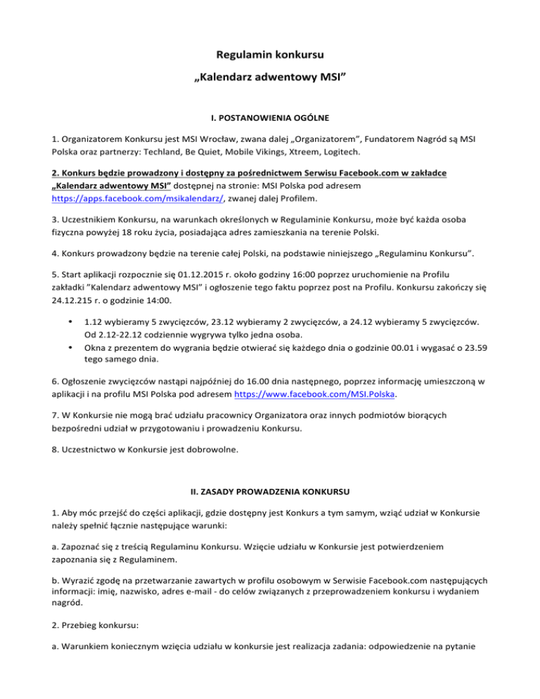 Regulaminkonkursu „KalendarzadwentowyMSI” I.POSTANOWIENIAOGÓLNE 1.OrganizatoremKonkursujestMSIWrocław,zwanadalej„Organizatorem”,FundatoremNagródsąMSI Polskaorazpartnerzy:Techland,BeQuiet,MobileVikings,Xtreem,Logitech. 2.KonkursbędzieprowadzonyidostępnyzapośrednictwemSerwisuFacebook.comwzakładce „KalendarzadwentowyMSI”dostępnejnastronie:MSIPolskapodadresem https://apps.facebook.com/msikalendarz/,zwanejdalejProfilem. 3.UczestnikiemKonkursu,nawarunkachokreślonychwRegulaminieKonkursu,możebyćkażdaosoba fizycznapowyżej18rokużycia,posiadającaadreszamieszkanianatereniePolski. 4.KonkursprowadzonybędzienatereniecałejPolski,napodstawieniniejszego„RegulaminuKonkursu”. 5.Startaplikacjirozpoczniesię01.12.2015r.okołogodziny16:00poprzezuruchomienienaProfilu zakładki”KalendarzadwentowyMSI”iogłoszenietegofaktupoprzezpostnaProfilu.Konkursuzakończysię 24.12.215r.ogodzinie14:00. 1.12wybieramy5zwycięzców,23.12wybieramy2zwycięzców,a24.12wybieramy5zwycięzców. Od2.12-22.12codzienniewygrywatylkojednaosoba. • Oknazprezentemdowygraniabędzieotwieraćsiękażdegodniaogodzinie00.01iwygasaćo23.59 tegosamegodnia. 6.Ogłoszeniezwycięzcównastąpinajpóźniejdo16.00dnianastępnego,poprzezinformacjęumieszczonąw aplikacjiinaprofiluMSIPolskapodadresemhttps://www.facebook.com/MSI.Polska. • 7.WKonkursieniemogąbraćudziałupracownicyOrganizatoraorazinnychpodmiotówbiorących bezpośredniudziałwprzygotowaniuiprowadzeniuKonkursu. 8.UczestnictwowKonkursiejestdobrowolne. II.ZASADYPROWADZENIAKONKURSU 1.Abymócprzejśćdoczęściaplikacji,gdziedostępnyjestKonkursatymsamym,wziąćudziałwKonkursie należyspełnićłącznienastępującewarunki: a.ZapoznaćsięztreściąRegulaminuKonkursu.WzięcieudziałuwKonkursiejestpotwierdzeniem zapoznaniasięzRegulaminem. b.WyrazićzgodęnaprzetwarzaniezawartychwprofiluosobowymwSerwisieFacebook.comnastępujących informacji:imię,nazwisko,adrese-mail-docelówzwiązanychzprzeprowadzeniemkonkursuiwydaniem nagród. 2.Przebiegkonkursu: a.Warunkiemkoniecznymwzięciaudziałuwkonkursiejestrealizacjazadania:odpowiedzenienapytanie poprzez:komentarz,zdjęcie,linklublinkiemikomentarzem.Rodzajudzielonejodpowiedzireguluje zadaniekonkursoweumieszczonewaplikacjiwkonkretnymdniu. b.Zwycięzcyzostanąwyłonieniprzezjury. c.Dowygraniasą33nagrodylubzestawynagród. d.Wpierwszymdniuaplikacjiwygrywa5osoby.Wprzedostatnimostatnimdniutrwaniaaplikacji wygrywają2,awostatnimdniu5osób.Pozatymidniamiwygrywatylkojednaosoba. e.Wczasietrwaniaaplikacjiwygrywają33osoby. d.Uczestnikkonkursumożeprzesłaćdowolnąliczbęzgłoszeń,wszystkieznichzostanąrozważoneprzez Juryoddzielnie.Nagrodazostanieprzyznanazawybranejednozgłoszeniedanegouczestnika. 3.ZgłoszeniedoKonkursujestrównoznacznezoświadczeniem,iżosobanadsyłająca: a.AkceptujewarunkiRegulaminuKonkursu.Wyrażazgodęnawykorzystaniezamieszczonegozgłoszeniaw celachmarketingowychprzezOrganizatoraKonkursuorazFundatoraNagród. b.WyrażazgodęnaprzetwarzanieswoichdanychosobowychzgodniezustawąoOchronieDanych Osobowych(Dz.U.Nr.133pozycja883); c.Jestautorem/autorkąprzesłanychzgłoszeń. d.Wyrażazgodęnanieodpłatnewykorzystywanie-zpodaniemnazwiskaautora/autorki-przez OrganizatoraiFundatoraNagródnadesłanychzgłoszeńwdowolnymczasie,formieimediach. 4.Wymaganiadotycząceuczestnictwa: Zgłaszanepraceniemogąnaruszaćogólnieprzyjętychnormobyczajowych,awszczególnościniemogą zawieraćtreścipowszechnieuznawanychzaobraźliweiwulgarne,wyrażeńzzakresuerotykii/lub pornografii,materiałówrasistowskichpromującychprzemoci/lubnaruszającychprawodoprywatności, materiałówchronionychprawamiwyłącznymi(np.prawamiautorskimi)bezzgodyichwłaścicieli prawnych. 5.UczestnicyKonkursusązobowiązanidoprzestrzeganianiniejszegoRegulaminuKonkursu.Wszelkie naruszeniaRegulaminuKonkursumogąskutkowaćwykluczeniemUczestnikazudziałuwKonkursie. 6.Konkursniepodlegaprzepisomustawyograchhazardowych. III.ODPOWIEDZIALNOŚĆORGANIZATORA 1.Organizatornieponosiodpowiedzialnościza: a.Sposób,wjakiUżytkownicySerwisukorzystajązudostępnionejimwSerwisiepowierzchniwirtualnej,ani zajakiekolwiekwynikłeztegoskutki. b.SzkodyspowodowaneprzeztreścizamieszczoneprzezuczestnikówwSerwisie. c.Połączeniainternetowe,wszczególnościzaprzerwanie,zawieszenielubzniekształcenietakiego połączenia. d.StratęlubuszkodzenietreściprzesłanychdoSerwisudrogąelektroniczną. e.Szkody,jakiemogąwystąpićwsystemachkomputerowychUżytkownikówSerwisuwzwiązkuz interakcjamizSerwisem. f.JakiekolwiekproblemyzwiązanezdziałaniemSerwisufacebook.com. 2.WszelkieroszczeniaUżytkownikówSerwisuztytułówwymienionychwyżejsąwyłączonez odpowiedzialnościOrganizatora.UżytkownikwyrażazgodęnazwolnienieOrganizatoraodwszelkich roszczeńosóbtrzecichpowstałychwzwiązkuzkorzystaniemprzezużytkownikazSerwisu. V.NAGRODYIWYDANIENAGRÓD 1.NagrodamiwKonkursiesą: -33nagrody:zestawóworazpojedynczychnagród; 2.Wkwestiiustaleniaszczegółówwysyłkinagrodyorazpoinformowaniuowygranej,organizator skontaktujesięzezwycięzcąpoprzezwysłaniewiadomościprywatnejwSerwisie.Niepodanieadresu wysyłkinagrodywterminie10dniodogłoszeniawynikówkonkursujestrównoznacznezrezygnacją zwycięzcyznagrody.Nagrodazostaniewysłanawprzeciągu30dniodpodaniaprzezzwycięzcęadresu wysyłki.NagrodamożezostaćwysłanatylkonaadresyznajdującesięnatereniePolski. 3.Niemamożliwościwymianynagrodynaichrównowartośćpieniężną. 4.NiemamożliwościprzeniesieniaprawdonagrodynaosobęinnąniżwybranaprzezJury. VII.POSTANOWIENIAKOŃCOWE Organizatorzastrzega,żenieponosiodpowiedzialnościza:zdarzeniauniemożliwiająceprawidłowe przeprowadzenieKonkursu,którychniebyłwstanieprzewidziećlubktórymniemógłzapobiec,w szczególnościwprzypadkuniedopełnieniaprzezUczestnikawszystkichwarunkówwzięciaudziałuw konkursielubwprzypadkuniedoręczeniaUczestnikowinagrodyspowodowanegoniepodaniemlubbłędnym podaniemprzezUczestnikadanychadresowych. WkwestiachnieuregulowanychniniejszymRegulaminemKonkursuzastosowaniemająprz