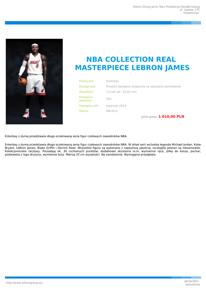 Aliens Group Jerzy Stec Produkcja-Handel-Usługi ul. Lipowa 17C Inowrocław NBA COLLECTION REAL MASTERPIECE LEBRON JAMES Producent: Enterbay Dostępność: Produkt dostępny wyłącznie na specjalne zamówienie Wysokość: 13 cali (ok. 33,02 cm) Kategoria wiekowa: 18+ Dostępny od*: kwiecień 2014 Status: Wkrótce price gross: 1 010,00 PLN Enterbay z dumą przedstawia długo oczekiwaną serię figur czołowych zawodników NBA. Enterbay z dumą przedstawia długo oczekiwaną serię figur czołowych zawodników NBA. W skład serii wchodzą legenda Michael Jordan, Kobe Bryant, LeBron James, Blake Griffin i Derrick Rose. Wszystkie figury są wykonane z najwyższą jakością, szczegóły postaci są niesamowite. Kolekcjonerskie rarytasy. Posiadają ok. 30 ruchomych punktów, dodatkowe akcesoria m.in. wymienne ręce, piłkę do kosza, puchar, podstawka z logo drużyny, wymienne buty. Mierzą 33 cm wysokości. Na zamówienie. Wymagana przedpłata http://www.aliensgroup.eu generator: aptusshop