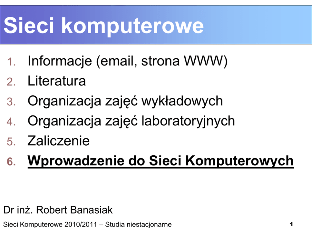 Sieci komputerowe 1. 2. 3. 4. 5. 6. Informacje (email, strona WWW) Literatura Organizacja zajęć wykładowych Organizacja zajęć laboratoryjnych Zaliczenie Wprowadzenie do Sieci Komputerowych Dr inż. Robert Banasiak Sieci Komputerowe 2010/2011 – Studia niestacjonarne 1 Sieci komputerowe Informacje: Dr inz. Robert Banasiak WWW: rbanasi.kis.p.lodz.pl Godziny przyjęć: EMAIL: [email protected] Certfikaty CCNA / CCNP == 5 2 Literatura Sieci komputerowe. Księga eksperta, Mark Sportack, Wydawnictwo Helion: 04/1999 Sieci komputerowe. Kompendium, Karol Krysiak, Wydawnictwo Helion: 02/2003 Sieci komputerowe w domu i w biurze. Biblia, Sue Plumley, Wydawnictwo Helion: 08/2001 3 Sieci komputerowe Organizacja wykładów (9 x ~70-90 minut) 1. 2. 3. 4. 5. 6. 7. 8. Wstęp do SK – model przepływu, model ISO OSI Sieci Lokalne LAN Warstwa fizyczna OSI Warstwa łącza danych – Ethernet Warstwa sieciowa Protokoły routingu Warstwa transportowa Warstwa sesji, prezentacji i aplikacji 4 Sieci komputerowe Organizacja laboratorium (9 x 90 minut) 1. 2. 3. 4. 4 maszyny Virtual BOX (2 x WinXP, 2 x Linux Ubuntu) Symulacje CISCO Packet Tracer 3.1 Kabelkologia (1,5 m kabla + 2 wtyczki na 2 os) 5 Sieci komputerowe Zaliczenie 1. 2. Wykład : duże Kolokwium (Egzamin) na ost. 10 wykładzie LUB 2 małe kolokwia na 5 Wykładzie i 10 wykładzie + Egzamin? LAB : 3 testy elektroniczne 20-40 minut (na. 5 zajęciach, na 7 zajęciach, na 9 zajęcia, punktacja procentowa, możliwa poprawa jednego wybranego testu, test wielowyboru) 6 Rys historyczny Sieć komputerowa - zbiór mechanizmów umożliwiających komunikowanie się komputerów znajdujących się w różnych miejscach. Integralnym elementem owej komunikacji jest wzajemne udostępnianie sobie zasobów [Mark A. Sportack]. 7 Rys historyczny Rozwój sieci komputerowych: względy merytoryczne - potrzeba informacji, wymiany danych, względy ekonomiczne - współdzielenie sprzętowych zasobów komputerowych. 8 Rys historyczny Początkowo w dużych firmach komputeryzacja następowała bardzo powoli. Dopiero pojawienie się aplikacji przeznaczonych dla biznesu spowodowało gwałtowny rozwój komputeryzacji. Początkowo były pojedyncze stacje robocze. Każdy użytkownik miał dostęp tylko do zasobów znajdujących się na jego komputerze 9 Rys historyczny 10 Rys historyczny Firmy zorientowały się w końcu ile pieniędzy można zaoszczędzić poprzez wprowadzenie sieci komputerowej. Dlatego na początku lat 80 nastąpił bardzo gwałtowny rozwój technologii sieciowych. W firmach zaczęto na coraz szerszą skalę stosować sieci komputerowe. Jednakże rozwój sieci komputerowych był wtedy bardzo chaotyczny. 11 Rys historyczny 12 Rys historyczny Na rynku pojawiło się bardzo wiele różnych standardów sieciowych. Standardy te były wprowadzane przez różne firmy. Były one między sobą niekompatybilne. Pojawiły się problemy z zapewnieniem wymiany informacji pomiędzy sieciami używającymi różnych standardów. 13 Rys historyczny Pierwsze sieci komputerowe: sieci korporacyjne, zindywidualizowane formy połączeń stanowiące integralną część równie zindywidualizowanych rozwiązań obliczeniowych, brak ujednoliconych standardów, standardowa konfiguracja oparta na terminalach połączonych z kontrolerami urządzeń. 14 Rys historyczny Pierwsze standardy sieci LAN: Ethernet I (Ethernet PARC), Ethernet II (Xerox, Digital, Intel). Sukces Ethernet I, II: koniec podejścia zindywidualizowanego, koncepcja współpracy otwartych środowisk. Celowość wprowadzenia koncepcji współpracy otwartych środowisk: niższe koszty eksploatacyjne, większe możliwości, współdzielenie produktów różnych producentów. Początki standaryzacji: ANSI (American National Standards Institute), IEEE (Institute of Electrical And Electronic Engineers), ISO (International Organization for Standarization), IEC (International Electrotechnical Commission), IAB (Internet Architecture Board). 15 Modele warstwowe sieci komputerowych Ogólnie o modelach komunikacji Model OSI Porównanie modelu OSI i TCP/IP 16 Warstwy w analizie przepływu Co przepływa? pojazdy Jakie formy może to przybierać? rower, motor ciężarówka Według jakich zasad? zasady ruchu drogowego Gdzie się ten przepływ odbywa. drogi, autostrady 17 Komunikacja pomiędzy ludźmi Myśl Przedstawienie myśli (np. język polski) Przekazanie myśli (mowa) Medium (powietrze) 18 Nadawca, odbiorca, pakiet Nadawca, źródło – jednostka wysyłająca dane. Odbiorca, cel – jednostka, do której dane przychodzą. Pakiet danych – jednostka informacji, która porusza się pomiędzy systemami nadawcy i odbiorcy. Zawiera dane nadawcy, oraz inne informacje potrzebne do prawidłowego przesłania (np. adres nadawcy i adres odbiorcy). 19 Nadawca, odbiorca, pakiet Nadawca Odbiorca 20 Protokoły Aby wymiana danych przebiegła prawidłowo: Nadawca i odbiorca muszą posługiwać się tymi samymi językami (protokołami). Techniczna definicja protokołu: Zbiór zasad określających format i sposób transmisji danych. 21 Ewolucja standardów sieci Początkowo panował chaos: mnóstwo rozwiązań, brak jednolitości, kompatybilności. OSI RM (Open Systems Interconnection Reference Model): opracowany w 1984, otwarty zbiór standardów zapewniających kompatybilność, współdziałanie pomiędzy różnymi typami technologii sieciowych. 22 Warstwowy model sieci Nadawca Odbiorca Warstwa n Warstwa n Warstwa k Warstwa k Fizyczne medium Protokół warstwy k: Zbiór reguł dzięki którym możliwa jest komunikacja pomiędzy warstwą knadawcy i kodbiorcy. 23 Warstwowy model sieci Protokół: Zestaw reguł rządzących wymianą danych między dwiema jednostkami, obejmujący: Składnia: Format danych, kodowanie, itp. Semantyka: Informacje sterującą, postępowanie w przypadku błędów, itp. Uzależnienia czasowe: Szybkość, kolejność, itp. Warstwa: Zbiór jednostek i dostarczanych przez nie usług. Interfejs: Połączenie między dwiema wars
