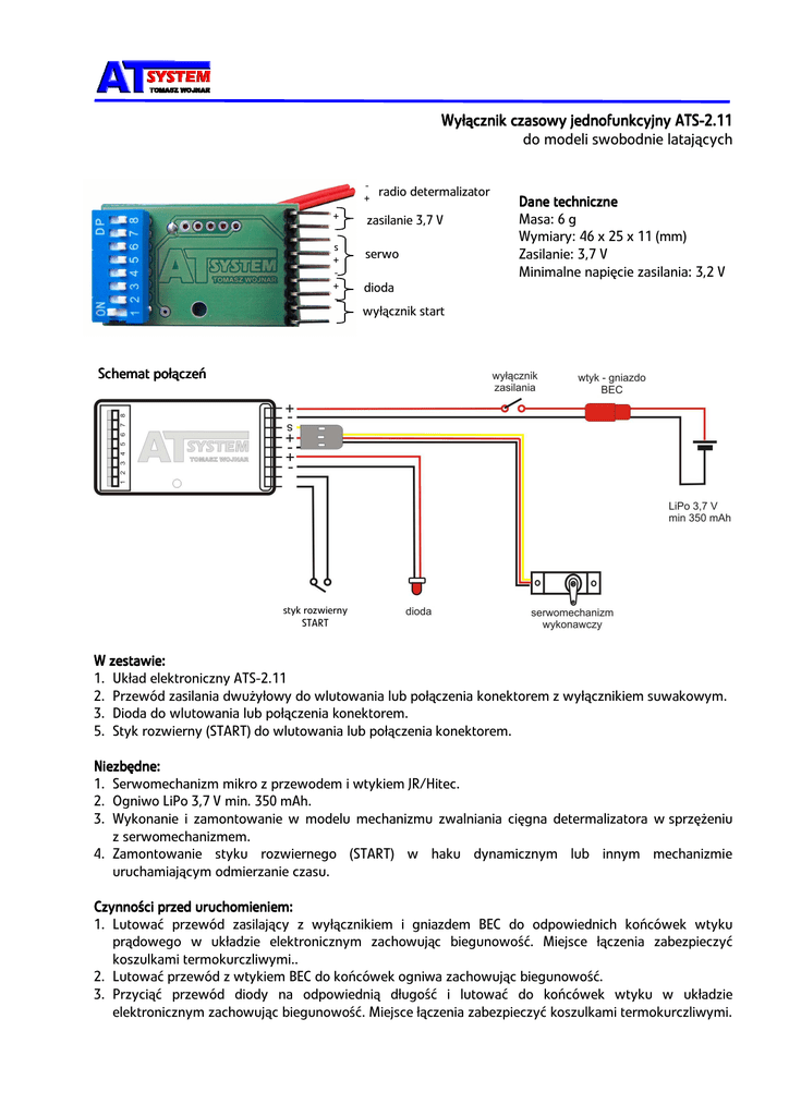 Wyłącznik czasowy jednofunkcyjny ATSATS-2.11 2.11 do modeli swobodnie latających + + s + + - radio determalizator zasilanie 3,7 V serwo Dane techniczne Masa: 6 g Wymiary: 46 x 25 x 11 (mm) Zasilanie: 3,7 V Minimalne napięcie zasilania: 3,2 V dioda wyłącznik start Schemat połączeń styk rozwierny START W zestawie: 1. Układ elektroniczny ATS-2.11 2. Przewód zasilania dwużyłowy do wlutowania lub połączenia konektorem z wyłącznikiem suwakowym. 3. Dioda do wlutowania lub połączenia konektorem. 5. Styk rozwierny (START) do wlutowania lub połączenia konektorem. Niezbędne: 1. Serwomechanizm mikro z przewodem i wtykiem JR/Hitec. 2. Ogniwo LiPo 3,7 V min. 350 mAh. 3. Wykonanie i zamontowanie w modelu mechanizmu zwalniania cięgna determalizatora w sprzężeniu z serwomechanizmem. 4. Zamontowanie styku rozwiernego (START) w haku dynamicznym lub innym mechanizmie uruchamiającym odmierzanie czasu. Czynności przed uruchomieniem: 1. Lutować przewód zasilający z wyłącznikiem i gniazdem BEC do odpowiednich końcówek wtyku prądowego w układzie elektronicznym zachowując biegunowość. Miejsce łączenia zabezpieczyć koszulkami termokurczliwymi.. 2. Lutować przewód z wtykiem BEC do końcówek ogniwa zachowując biegunowość. 3. Przyciąć przewód diody na odpowiednią długość i lutować do końcówek wtyku w układzie elektronicznym zachowując biegunowość. Miejsce łączenia zabezpieczyć koszulkami termokurczliwymi. 4. Przyciąć przewód styku zwiernego (START) na odpowiednią długość i lutować do końcówek wtyku w układzie elektronicznym. Miejsce łączenia zabezpieczyć koszulkami termokurczliwymi. 5. Połączyć serwomechanizm z wtykiem układu elektronicznego zachowując biegunowość. 6. Ładować ogniwo i połączyć wtyk BEC z gniazdem przewodu zasilającego. Zastosowanie konektorów można zastąpić lutowaniem przewodów bezpośrednio do wtyków lub punktów lutowniczych po usunięciu wtyków. Obsługa wyłącznika: 1. Połączyć naładowane ogniwo z przewodem zasilającym łącząc wtyk-gniazdo BEC. 2. Zewrzeć obwód na styku zwiernym (START) dźwignią haka dynamicznego lub zawleczką w zależności od zastosowanej w modelu metody uruchamiania zegara. 3. Wybrać odpowiedni czas lotu przesuwając odpowiedni suwak lub kilka suwaków w położenie włączony (ON). 4. Włączyć zasilanie włącznikiem suwakowym. Serwomechanizm przesunie się w położenie robocze, dioda świecić będzie światłem ciągłym. Układ gotowy do lotu. 5. Po wyczepieniu modelu i rozłączeniu styku zwiernego (START) zostaje uruchomione odmierzanie zadanego czasu lotu. Dioda miga (ok. 60x/min). 6. Po upływie zadanego czasu serwomechanizm wykonuje obrót dźwigni o ok. 90o w kierunku zgodnym ze wskazówkami zegara. Zastosowany mechanizm powinien zwolnić cięgno determalizatora. 7. Po odzyskaniu modelu wyłącznik zasilania przesunąć w położenie wyłączony. 8. W kolejnych lotach powtórzyć czynności z pkt. 2 ÷ 7. 9. Po zakończonych lotach rozłączyć wtyk-gniazdo BEC. Jeżeli po włączeniu zasilania (pkt. 4) dioda miga szybko (z częstotliwością ok. 120x/min) sygnalizuje spadek napięcia zasilania poniżej dopuszczalnego 3,2 V. Należy naładować ogniwo lub wymienić na naładowane. Ustalanie czasu lotu: Do każdego suwaka przypisany jest określony odmierzany przez układ czas. Włączenie dwóch lub więcej suwaków powoduje odmierzanie czasu będącego sumą czasów przypisanych do danego suwaka. Ustalony suwakiem 1 czas 3 sek. jest nadwyżką bezpieczeństwa ponad czas lotu maksymalnego. Czas (s) 3 10 30 60 90 120 180 210 240 300 600 Włączony przełącznik 1 2 3 4 3+4 5 6 3+6 4+6 7 5+6+7 Rewers serwomechanizmu: Przełącznikiem 8 ustala się kierunek wychylania serwomechanizmu w prawo lub w lewo. Radio determalizator Z układu wyprowadzone są dwa przewody do podłączenia radio determalizatora (RD). Przewód z czerwoną linią podłączyć do + (sygnał). Sygnał o wysokim poziomie napięcia (1/2 napięcia zasilania) podany z radia powinien trwać ponad 1 s. W przypadku niewykorzystania RD końcówki przewodów zabezpieczyć przed zwarciem. Testy urządzenia przeprowadzają modelarze Krośnieńskiego Stowarzyszenia Modelarzy Lotniczych, a wnioski zostaną przedstawione na stronie http://www.modelarze-krosno.xq.pl/ Krosno 2013