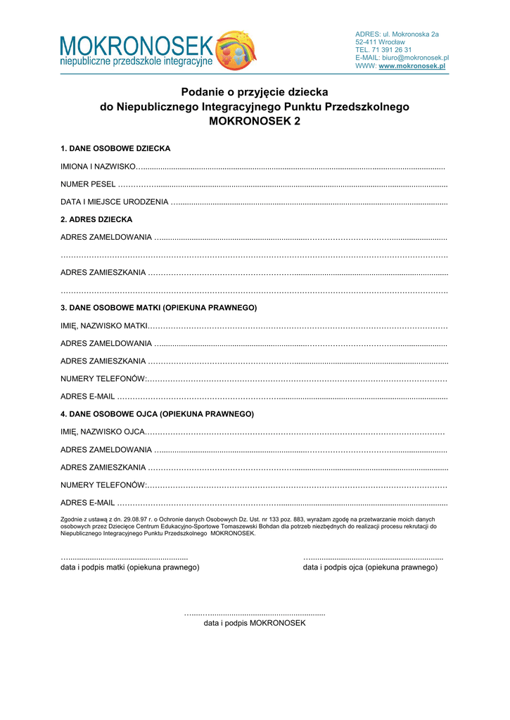ADRES: ul. Mokronoska 2a 52-411 Wrocław TEL. 71 391 26 31 E-MAIL: [email protected] WWW: www.mokronosek.pl Podanie o przyjęcie dziecka do Niepublicznego Integracyjnego Punktu Przedszkolnego MOKRONOSEK 2 1. DANE OSOBOWE DZIECKA IMIONA I NAZWISKO…............................................................................................................................................. NUMER PESEL ……………........................................................................................................................................ DATA I MIEJSCE URODZENIA ….............................................................................................................................. 2. ADRES DZIECKA ADRES ZAMELDOWANIA …....................................................................…………………………….......................... ……………………………………………………………………………………………………………………………………. ADRES ZAMIESZKANIA …………………………………………………........................................................................ ……………………………………………………………………………………………………………………………………. 3. DANE OSOBOWE MATKI (OPIEKUNA PRAWNEGO) IMIĘ, NAZWISKO MATKI……………………………………………………………………………………………………… ADRES ZAMELDOWANIA …....................................................................…………………………….......................... ADRES ZAMIESZKANIA …………………………………………………........................................................................ NUMERY TELEFONÓW:……………………………………………………………………………………………………… ADRES E-MAIL ………………………………………………………............................................................................... 4. DANE OSOBOWE OJCA (OPIEKUNA PRAWNEGO) IMIĘ, NAZWISKO OJCA……………………………………………………………………………………………………… ADRES ZAMELDOWANIA …....................................................................…………………………….......................... ADRES ZAMIESZKANIA …………………………………………………........................................................................ NUMERY TELEFONÓW:……………………………………………………………………………………………………… ADRES E-MAIL ………………………………………………………............................................................................... Zgodnie z ustawą z dn. 29.08.97 r. o Ochronie danych Osobowych Dz. Ust. nr 133 poz. 883, wyrażam zgodę na przetwarzanie moich danych osobowych przez Dziecięce Centrum Edukacyjno-Sportowe Tomaszewski Bohdan dla potrzeb niezbędnych do realizacji procesu rekrutacji do Niepublicznego Integracyjnego Punktu Przedszkolnego MOKRONOSEK. …........................................................ data i podpis matki (opiekuna prawnego) ….............................................................. data i podpis ojca (opiekuna prawnego) ….....…...................................................... data i podpis MOKRONOSEK