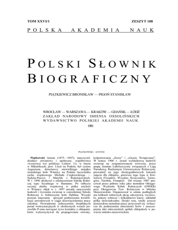 TOM XXVI/1 P O L S K A ZESZYT 108 A K A D E M I A N A U K POLSKI SŁOWNIK BIOGRAFICZNY PIĄTKIEWICZ BRONISŁAW — PIGOŃ STANISŁAW WROCŁAW — WARSZAWA — KRAKÓW — GDAŃSK — ŁÓDŹ ZAKŁAD NARODOWY IMIENIA OSSOLIŃSKICH WY DA WNICT WO POLSKIEJ AK A DEMII N AUK 1981 PIĄTKOWSKI ANTONI Piątkowski Antoni (1875—1947), nauczyciel, działacz oświatowy i społeczny, współtwórca «wzorowej wsi polskiej» Lisków. Ur. w lutym w Mikulińcach, pow. Lityń na Podolu, był synem Augustyna, dzierżawcy niewielkiego majątku ziemskiego koło Winnicy na Podolu (uczestnika ruchu wojskowego Michała Czajkowskiego — Sadyka-Paszy), i Matyldy z Radziejowskich. W r. 1896 ukończył z odznaczeniem Szkołę Rolniczą typu licealnego w Humaniu. Po odbyciu rocznej służby wojskowej w pułku artylerii w Winnicy objął w r. 1897 posadę nauczyciela hodowli i żywienia zwierząt w czteroletniej Szkole Rolniczej w Sobieszynie koło Dęblina. Wysoki poziom nauczania sprzyjał podnoszeniu kwalifikacji zawodowych w ciągu dziewięcioletniej pracy szkolnej. Prowadzenie jednocześnie bezpłatnych porad weterynaryjnych w okolicznych wsiach pozwoliło P-emu nawiązać żywe kontakty z chłopami, które wykorzystywał do propagowania oświaty, kolportowania „Zorzy" i „Gazety Świątecznej". W końcu 1906 r. został wykładowcą hodowli zwierząt na zorganizowanym wówczas, przez grupę ziemian Lubelszczyzny związanych z Ligą Narodową, Ruchomym Uniwersytecie Rolniczym; prowadził na jego dwutygodniowych kursach zajęcia dla chłopów, pierwsze tego typu w Królestwie (Urzędów, Wysokie, Krzeczonów, Tarnogóra, Turobin, Frampol). Od wiosny 1907 pracował przez półtora roku jako instruktor Okręgowego Wydziału Kółek Rolniczych (OWKR) przy Okręgowym Tow. Rolniczym w Mińsku Mazowieckim. Organizował w ośmiu podległych mu kółkach rolniczych akcję odczytową, wycieczki, pokazy rolnicze i kilkudniowe kursy, zakładał pólka doświadczalne. Dzięki tym, wtedy jeszcze pionierskim metodom pracy przyczynił się zwłaszcza do podniesienia mleczności krów i zaszczepienia idei mleczarskich spółek chłopskich w powiecie mińsko-mazowieckim. PIĄTKOWSKI ANTONI Działalność w dziedzinie krzewienia oświaty rolniczej na wsi oraz idei chłopskich kooperatyw rozwinął P. w skali całego Królestwa w okresie zajmowania stanowiska głównego instruktora Centralnego Wydziału Kółek Rolniczych (CWKR) przy Centralnym Tow. Rolniczym (CTR) w Warszawie (l VIII 1908 — 30 IX 1912). «Gwiazdą przewodnią w tej pracy — jak pisał w r. 1942 w swoich Wspomnieniach — była idea niepodległości, do której dążono przez osiągnięcie solidarności społecznej i jedności narodowej, a także przez szerzenie oświaty i kultury, na ogół bez stempla partyjnego». Kierując się tymi zasadami, przeciwny był organizowaniu przez ludowców odrębnych kółek rolniczych — Towarzystwa Kółek Rolniczych im. S. Staszica. Jako główny instruktor CTR rozwinął niezwykle intensywną działalność. Dotarł do kółek rolniczych i OWKR w 81 powiatach (na 84 istniejących) Król. Pol. W okresie od stycznia 1910 do września 1912 wygłosił na zebraniach, kursach i wystawach 359 pogadanek w 204 miejscowościach z udziałem ponad 32 tysięcy osób, głównie z zakresu uprawy roślin i hodowli bydła. W r. 1911 wykładał również na kursie tygodniowym w Kownie o hodowli trzody chlewnej oraz, jako delegat Sekcji Szkolnej CTR, wygłosił wcześniej przedyskutowany referat o organizacji niższego wykształcenia rolniczego na zjeździe lekarzy i przyrodników polskich w Krakowie (1911). Był organizatorem wystaw i pokazów rolniczych oraz krajowych i zagranicznych (do Czech i na Morawy) wycieczek, do ośrodków wzorowego rolnictwa. Propagowaniem postępu rolniczego zajmował się również za pośrednictwem licznych artykułów fachowych, zamieszczanych zwłaszcza na łamach „Przewodnika Kółek i Spółek Rolniczych w Królestwie Polskim", „Kalendarza Wydziału Kółek Rolniczych CTR" oraz przeważnie przez siebie napisanych i zredagowanych jednodniówek „Pobudki" (nakład 25 000 egzemplarzy) i „Upominek dla rolnika polskiego". P. uczestniczył także w pracach Komisji Wydawniczej CWKR, zajmującej się popularyzacją wiedzy rolniczej. Sam napisał broszury: Udoje próbne i Żywienie krów mlecznych. Pierwsza doczekała się dwóch wydań (W. 1909, 1911). Druga (Wyd. 1. W. 1909) ciągle poprawiana i uzupełniana do r. 1937 — miała aż siedem wydań, o łącznym, niezwykle wysokim na owe czasy nakładzie 70 000 egzemplarzy i była przetłumaczona na język rosyjski i litewski; ósme jej wydanie, pt. Racjonalne żywienie zwierząt domowych, ukazało się w r. 1947 (P.). Wchodziła ona do podstawowego zestawu pozycji wydawanych kolejno w ramach CWKR, Księgozbioru Rolnika Polskiego CTR, Biblioteki Kółka Rolniczego Centralnego Tow. Organizacji i Kółek Rolniczych (CTO i KR), Biblioteki Rolniczej Instytutu Naukowo-Wydawniczego Ruchu Ludowego «Polska». P. napisał także broszury: Polityka a hodowla (W. 1919), O gospodarce na piaskach (W. 1927, wydana ponownie w r. 1946 pt. Jak gospodarować na piaskach), Spółdzielnia wiejska. Uwagi zasadnicze i wskazania praktyczne (Częstochowa 1937) i in. Na skutek nacisku części biskupów, zarzucających P-emu rzekomo «masońsko-zaraniarskie przekonania», musiał, mimo uzyskania zaufania Zarządu CWKR, ustąpić ze stanowiska głównego instruktora. Od 25 X 1912 do czerwca 1915 był instruktorem OWKR przy Tow. Rolniczym Hrubieszowskim, obejmującym powiat hrubieszowski i 5 gmin pow. tomaszowskiego. W dziedzinie oświatowej i społeczno-gospodarczej prowadził tu podobną działalność, jak w OWKR w Mińsku Mazowieckim. Z uwagi jednak na włączenie tych ziem do guberni chełmskiej P. wykorzystywał istniejące i nowo przez siebie zakładane kółka rolnicze, spółdzielnie mleczarskie oraz pierwsze na Lubelszczyźnie chłopskie koła hodowlane do obrony i umo