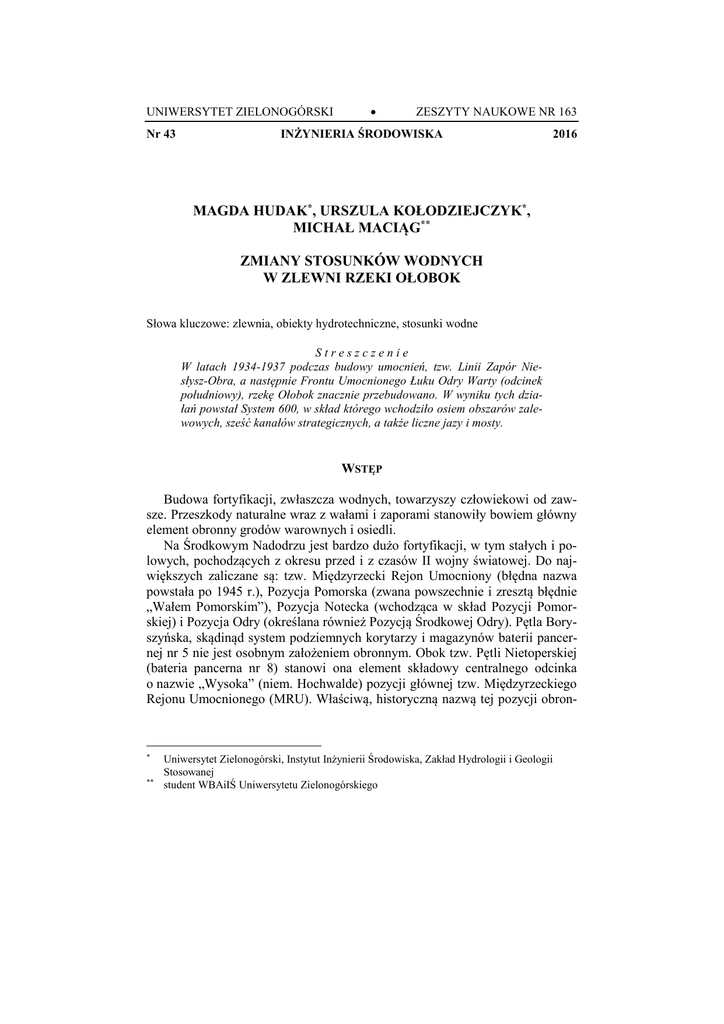 UNIWERSYTET ZIELONOGÓRSKI Nr 43 ZESZYTY NAUKOWE NR 163 INŻYNIERIA ŚRODOWISKA 2016 MAGDA HUDAK*, URSZULA KOŁODZIEJCZYK*, MICHAŁ MACIĄG** ZMIANY STOSUNKÓW WODNYCH W ZLEWNI RZEKI OŁOBOK Słowa kluczowe: zlewnia, obiekty hydrotechniczne, stosunki wodne Streszczenie W latach 1934-1937 podczas budowy umocnień, tzw. Linii Zapór Niesłysz-Obra, a następnie Frontu Umocnionego Łuku Odry Warty (odcinek południowy), rzekę Ołobok znacznie przebudowano. W wyniku tych działań powstał System 600, w skład którego wchodziło osiem obszarów zalewowych, sześć kanałów strategicznych, a także liczne jazy i mosty. WSTĘP Budowa fortyfikacji, zwłaszcza wodnych, towarzyszy człowiekowi od zawsze. Przeszkody naturalne wraz z wałami i zaporami stanowiły bowiem główny element obronny grodów warownych i osiedli. Na Środkowym Nadodrzu jest bardzo dużo fortyfikacji, w tym stałych i polowych, pochodzących z okresu przed i z czasów II wojny światowej. Do największych zaliczane są: tzw. Międzyrzecki Rejon Umocniony (błędna nazwa powstała po 1945 r.), Pozycja Pomorska (zwana powszechnie i zresztą błędnie „Wałem Pomorskim”), Pozycja Notecka (wchodząca w skład Pozycji Pomorskiej) i Pozycja Odry (określana również Pozycją Środkowej Odry). Pętla Boryszyńska, skądinąd system podziemnych korytarzy i magazynów baterii pancernej nr 5 nie jest osobnym założeniem obronnym. Obok tzw. Pętli Nietoperskiej (bateria pancerna nr 8) stanowi ona element składowy centralnego odcinka o nazwie „Wysoka” (niem. Hochwalde) pozycji głównej tzw. Międzyrzeckiego Rejonu Umocnionego (MRU). Właściwą, historyczną nazwą tej pozycji obron- * ** Uniwersytet Zielonogórski, Instytut Inżynierii Środowiska, Zakład Hydrologii i Geologii Stosowanej student WBAiIŚ Uniwersytetu Zielonogórskiego 20 M. Hudak, U. Kołodziejczyk, M. Maciąg nej jest Front Ufortyfikowany Łuku Odra – Warta (niem. Festungsfront Oder – Warthe–Bogen) – Motyl 2000. Do największych fortyfikacji wybudowanych przed 1939 r. na Środkowym Nadodrzu należą: Międzyrzecki Rejon Umocniony, Pętla Boryszyńska oraz system bunkrów stanowiących Pozycję Środkowej Odry (niem. "Oderstellung"). Do 1944 r. w Pozycji Środkowej Odry wzniesiono około 650 obiektów obronnych, chociaż zaprojektowano ich około 750. Znaczną liczbę obiektów (234) zlokalizowano na Ziemi Lubuskiej. Było to związane z chęcią połączenia Pasma Środkowej Odry z Międzyrzeckim Rejonem Umocnionym. Mając na względzie doświadczenia wcześniejszych pokoleń inżynierowie niemieccy w latach 1933-1934 opracowali podstawowe założenia i projekty budowy umocnień tzw. Linii Zapór Niesłysz-Obra, stanowiącej południowy odcinek Międzyrzeckiego Rejonu Umocnionego. W latach 1934-1937 umocnienia te były budowane z coraz większym rozmachem; zakończenie budowy planowano na 1944 r., przy czym niektóre z obiektów miały być wybudowane nawet po 1951 r. [Toczewski 2001]. Pomimo, że obiekty hydrotechniczne Międzyrzeckiego Rejonu Umocnienionego stanowiły spójny system zapór wodnych, poszczególne obiekty powstawały na podstawie jednostkowych projektów, co dzisiaj świadczy o ich wyjątkowości. Współczesna analiza konstrukcji poszczególnych obiektów pozwala na poznanie rozwoju myśli inżynierskiej. Są one dużą atrakcją turystyczną dla pasjonatów historii i architektury obronnej. Obiekty obronne posadowione w wałach przeciwpowodziowych są również interesujące pod względem geotechnicznym: wzmacniają konstrukcję wałów, a jednocześnie ułatwiają filtrację wody przez korpus wału i sprzyjają powstawaniu wyrw podczas powodzi [Kołodziejczyk 2004]. Fortyfikacje Miedzyrzeckiego Rejonu Umocnionego są często zawodnione. Decydują o tym: opady atmosferyczne, spływy powierzchniowe z okolicznych zlewni oraz wysokie poziomy wód gruntowych. Woda zalegająca w sąsiedztwie fortyfikacji reaguje z konstrukcją żelbetową poszczególnych obiektów [Kołodziejczyk i in. 2014] poprzez proces ługowania betonu. To prowadzi do systematycznej destrrukcji obiektów. CHARAKTERYSTYKA RZEKI OŁOBOK Rzeka Ołobok wypływa z jeziora Niesłysz położonego na zachód od miasta Świebodzin, po czym przepływa przez miejscowość Ołobok (rys. 1). Następnie, w granicach miejscowości Skąpe tworzy jeden z najbardziej uwidocznionych terenów zalewowych powstałych w latach 30. XX wieku, kiedy to niewielki ciek wodny przekształcono w kanał forteczny. Utworzono wówczas osiem obszarów zalewowych oraz sześć odcinków kanałów strategicznych [Miniewicz i Perzyk 1993]. Rzeka Ołobok następnie przepływa przez niewielką wieś Prze- Zmiany stosunków wodnych … 21 tocznicę i około 5 km dalej wpływa do rzeki Odry (w okolicach wsi Nietkowice). Głównymi dopływami Ołoboku są rzeki: Słomka o długości 15,55 km, Świebodka – 12,47 km i Borowianka – 13,17 km. Długość rzeki Ołobok wynosi 28,92 km, a powierzchnia zlewni 258,69 km2. Rys. 1. Lokalizacja rzeki Ołobok (skala 1:200000) Fig. 1. Location of the Ołobok river (1:200000) 22 M. Hudak, U. Kołodziejczyk, M. Maciąg Obszar zlewni rzeki Ołobok należy do prawego dorzecza Odry. Dolina rzeki pozwala na tworzenie się licznych jezior oraz zbiorników zalewowych. Do najgłębszego, a zarazem najczystszego należy jezioro Niesłysz o powierzchni 496,6 ha (głębokość w najniższym punkcie 37,4 m). Na terenie zlewni znajdują się również jeziora: Wilkowskie (powierznia 130,5 ha, głębokość 23,7 m), Niedźwiedno (powierzchnia 48 ha, głębokość 5,8 m), Ciborze (powierzchnia 34,4 ha, głębokość 12 m) i Ołobockie (powierzchnia 24,5, głębokość 6,2 m). Jeziora oraz sztuczne obszary zalewowe położone na terenie zlewni Ołoboku są zeutorfizowane. Obecnie sztuczne zbiorniki wodne spełniają funkcje stawów rybackich. Ich łaczną powierzchnię szacuje się na około 100 ha. SYSTEM 600 MIĘDZYRZECKIEGO REJONU UMOCNIONEGO System 600 stanowi południowy o