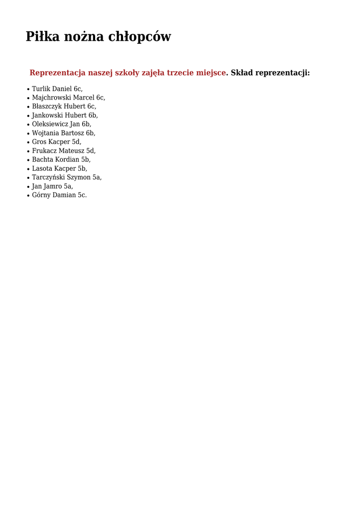 Piłka nożna chłopców Reprezentacja naszej szkoły zajęła trzecie miejsce. Skład reprezentacji: ● ● ● ● ● ● ● ● ● ● ● ● ● Turlik Daniel 6c, Majchrowski Marcel 6c, Błaszczyk Hubert 6c, Jankowski Hubert 6b, Oleksiewicz Jan 6b, Wojtania Bartosz 6b, Gros Kacper 5d, Frukacz Mateusz 5d, Bachta Kordian 5b, Lasota Kacper 5b, Tarczyński Szymon 5a, Jan Jamro 5a, Górny Damian 5c.