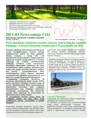 Zakupimy dla Państwa CO2 na giełdzie Sprzedamy Państwa CO2 na giełdzie Doradzimy przy zawieraniu umów Forward Dokonamy dla Państwa wymiany EUA/CER/ERU; CER/CER Zarządzamy certyfikatami EUA i CER 2011-03 News-emisje CO2 Informacje z praktyki w handlu emisjami Wydanie z 17.05.2011 EUA cena 01.04.2011 – 17.05.2011 Źrόdło: Bluenext Nowe instalacje, obniżenie kosztów poprzez contracting bez kapitału własnego - Czwarte dotowane seminarium UE-przydziały od 2013 W latach ubiegłych świat energii rozwinął się do wysoce skomplikowanego systemu, którego kompleksowość będzie się dalej pogłębiać. Debaty związane z emisją CO2 oraz spowodowane wydarzeniami w Japonii ponowne zajęcie się tematem energii jądrowej w Europie pokazują, jak wielkim przeobrażeniom podlegają światowe rynki energetyczne. Posiadając odpowiednie wiadomości na temat mechanizmów, jakim podlega funkcjonowanie rynku oraz znając potrzeby klientów, możliwy jest rozwój wyspecjalizowanej firmy contractingowej, która zapewni optymalne rozwiązania dla zakładów przemysłowych oraz dostwców energii dla potrzeb komunalnych. Uwzględniając europejską dyrektywę 28 dotyczącą odnawialnych źródeł energii (OZE), polscy operatorzy instalacji otrzymać mogą od wysoce specjalistycznej firmy contractingowej, dopasowane, korzystne pod względem ekonomicznym oraz chroniące środowisko rozwiązania przeznaczone dla dostawców energii, które zapewnią im przetrwanie na zliberalizowanym rynku energii. W szczególności również wtedy, kiedy zła wydajność kotłów od roku 2013, grozi zredukowaną ilością przydziałów w handlu emisjami. Contracting obejmuje zasadniczo rozwój, planowanie, budowę, finansowanie oraz działanie instalacji dla produkcji ciepła,pary, prądu, zimna, sprężonego powietrza oraz/lub instalacjach olejowych i gazowych. Innowacyjna technika oraz optymalne dla każdego działania rozwiązania paliwowe zapewniają obniżenie kosztów, bez zaangażowania kapitału własnego. „Bezpłatnie przekażemy Państwu do dyspozycji maszynę parową. Zainstalujemy ją i przez pięć lat będziemy ją serwisować. Gwarantujemy, że węgiel do tej maszyny kosztuje mniej, niż to, co obecnie wydane być musi na karmę (energię) dla koni, które wykonują tę samą pracę. Wszystkim, czego oczekujemy od Państwa jest to , że oddacie nam jedną trzecią w ten sposób zaoszczędzonych pieniędzy.“ (James Watt, 1736 - 1819) Zabytkowa maszyna parowa w Utha/USA Co to jest Contracting? Contracting jest całościową usługą energetyczną, składającą się z różnych elementów. W zależności od potrzeb oraz oczekiwań klienta mogą zostać wykorzystane wszystkie lub pojedyńcze elementy oferty firmy contractingowej. Celem specjalistów w dziedzinie contractingu jest udział w zapewnieniu swoim klientom wzrostu 1 konkurencyjności oraz egzystencji poprzez optymalizację w dostawach energii. Contracting zorientowany jest na osiąganie dodatkowych korzyści. Są to przede wszystkim: • Obniżenie kosztów zakładowych poprzez przejęcie inwestycji oraz związane z tym zwiększenie pynności finansowej • Redukcja emisji i sprzedaż dodatkowych praw do emisji • Spełnienie najnowszych przepisów prawnych • Wzrost dostępności instalacji • Lepsze ceny dla odbiorców energii klienta (prywatni i przemysłowi odbiorcy ciepła oraz pary) i/oraz niższe koszty własnych procesów produkcyjnych Contracting umożliwia przedsiębiorstwom skoncentrowanie się na ich rdzennej działalności, produktach, własnych procesach produkcyjnych oraz odciążenie od ważnych, ale nie bezpośrednio związanych z rdzenną działalnością zadań, takich jak zaopatrzenie w ciepło, parę, zimno, prąd, paliwo, sprężone powietrze i inne. Również w przypadku, kiedy przedsiębiorstwo jest dostawcą ciepła dla potrzeb komunalnych (czyli produkcja ciepła jest jego rdzenną działalnością), wynajęcie firmy contractingowej, która przejmie całe spektrum usług lub jego część, może być dla obu stron lukratywnym interesem. Contracting zaopatruje klientów z różnorodnych gałęzi gospodarki takich jak: przemysł spożywczy, przemysł chemiczny, przemysł samochodowy, przemysł papierowy, przemysł tekstylny, jak również dostawców ciepła dla poszczególnych dzielnic miasta oraz gmin, a również szpitali, uniwersytetów, portów lotniczych itd. Contracting zajmuje się również przejęciem oraz optymalizacją istniejących instalacji wytwarzających energię, zaopatrzeniem istniejących instalacji oraz zaopatrzeniem sieciowym całych dzielnic. Zakres usług dobrego contractora powinien obejmować w szczególności również pozyskiwanie gazu oraz prądu na zliberalizowanym rynku energii. Poprzez specjalistyczny contracting możliwe jest osiągnięcie korzystnych oraz długoterminowo stabilnych cen. Na życzenie klienta możliwy jest wgląd do umów zawartych z dostawcami w celu ekonomicznej optymalizacji oraz, w niektórych przypadkach, znacznego obniżenia kosztów. Handel emisjami CO2 w Polsce 4. nieodpłatne seminarium, wspierane przez UE Również w roku 2011 polscy przedsiębiorcy otrzymają od UE pierwszorzędną szansę, aby uzyskać zarówno kupieckie, jak i techniczne informacje związane z tematyką handlu emisjami. Dokładnie przed rozpoczęciem letnich wakacji odbędzie się w Katowicach (Polska), częściowo dotowane seminarium, podczas kórego przedsiębiorcom zostaną przedstawione w języku polskim różne, aktualne tematy związane z europejskim handlem emisjami CO2. Seminarium to jest dla operatorów małych instalacji oraz dla klientów Emissionshändler.com® bezpłatne (pozostałe szczegóły w dalszej części tekstu oraz w formularzu zgłoszeniowym), nocleg oraz koszty dojazdu pokrywają uczestnicy we własnym zakresie. 2dniowe seminarium zorganizowane przez Emissionshändler.com® zawiera również, dla zainteresowanych uczestników, program wieczorny. Seminarium m