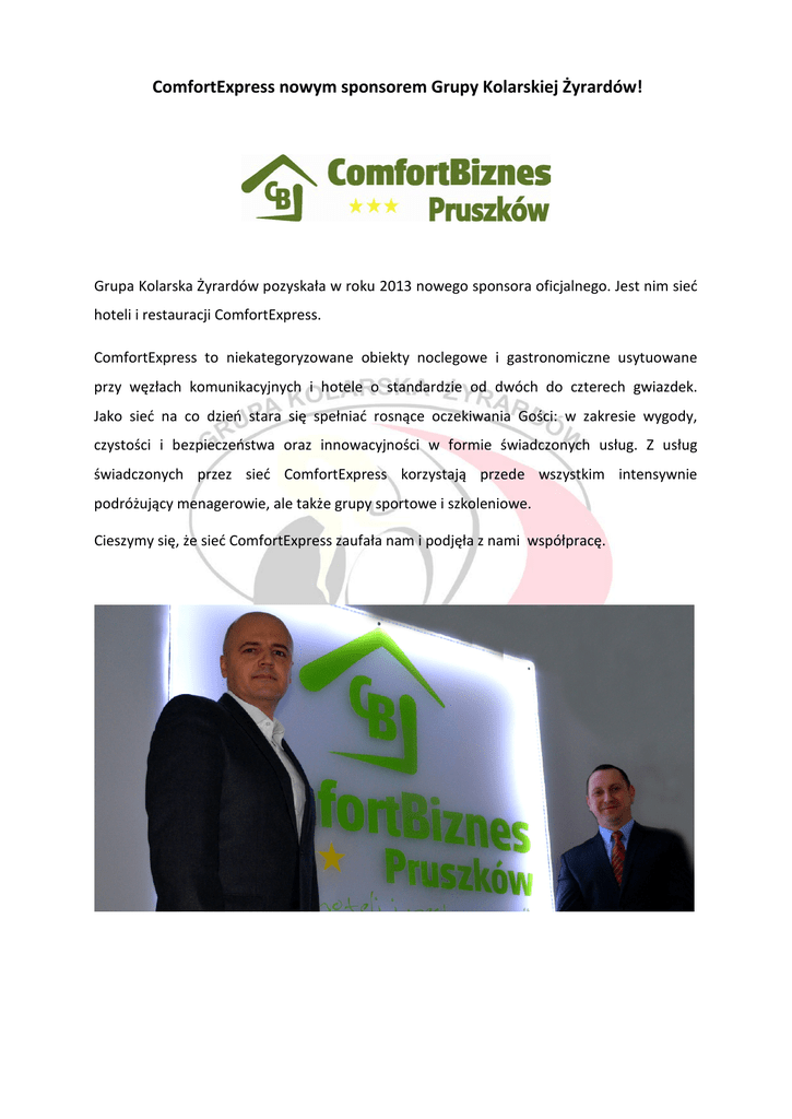 ComfortExpress nowym sponsorem Grupy Kolarskiej Żyrardów! Grupa Kolarska Żyrardów pozyskała w roku 2013 nowego sponsora oficjalnego. Jest nim sieć hoteli i restauracji ComfortExpress. ComfortExpress to niekategoryzowane obiekty noclegowe i gastronomiczne usytuowane przy węzłach komunikacyjnych i hotele o standardzie od dwóch do czterech gwiazdek. Jako sieć na co dzień stara się spełniać rosnące oczekiwania Gości: w zakresie wygody, czystości i bezpieczeństwa oraz innowacyjności w formie świadczonych usług. Z usług świadczonych przez sieć ComfortExpress korzystają przede wszystkim intensywnie podróżujący menagerowie, ale także grupy sportowe i szkoleniowe. Cieszymy się, że sieć ComfortExpress zaufała nam i podjęła z nami współpracę. Hotel ComfortBiznes Pruszków należy do ComfortExpress od 2011 roku i jest głównym obiektem sieci wspierającym naszą grupę. Hotel położony jest w strategicznym miejscu zarówno dla ludzi biznesu planujących kolejny dzień w podróży jak i turystów zamierzających zwiedzić Warszawę i okolice. ComfortBiznes Pruszków znajduje się na trasie Grodzisk Mazowiecki – Warszawa, przy zjeździe z autostrady A2 i zaledwie 14 km od międzynarodowego lotniska im. F. Chopina. Zabytkowy Park Potulickich to świetne miejsce na chwilę relaksu w trakcie dnia, a stadion piłkarski usytuowany po sąsiedzku nadaje hotelowi sportowego charakteru. Dogodna lokalizacja sprawia, że nie trzeba także długo szukać bankomatu, apteki, poczty ani stacji benzynowej. Hotel proponuje swoim gościom m.in.: • ciekawe propozycje gastronomiczne w restauracji i Sport Barze. • zaplecze konferencyjne wraz z wyposażeniem • duży, monitorowany parking • zaplecze biurowe na recepcji (fax, xero) • całodobową recepcję • bezpłatny, bezprzewodowy internet • gabinet masażu ComfortBiznes Pruszków będzie wspaniałą bazą szkoleniową podczas naszych zgrupowań i zawodów, które często odbywają się w Pruszkowie na krytym torze kolarskim BGŻ Arena. Hotel jest bardzo przyjazny sportowcom a szczególnie kolarzom. Kuchnia wychodzi naprzeciw naszym oczekiwaniom przygotowując posiłki zgodne z dietą zawodowych kolarzy. Do naszej dyspozycji jest także bezpieczny schowek na rowery i sprzęt. www.pruszkow.comfortbiznes.pl Serdecznie pozdrawiam, Jarosław Potocki Tel. 797 171 237