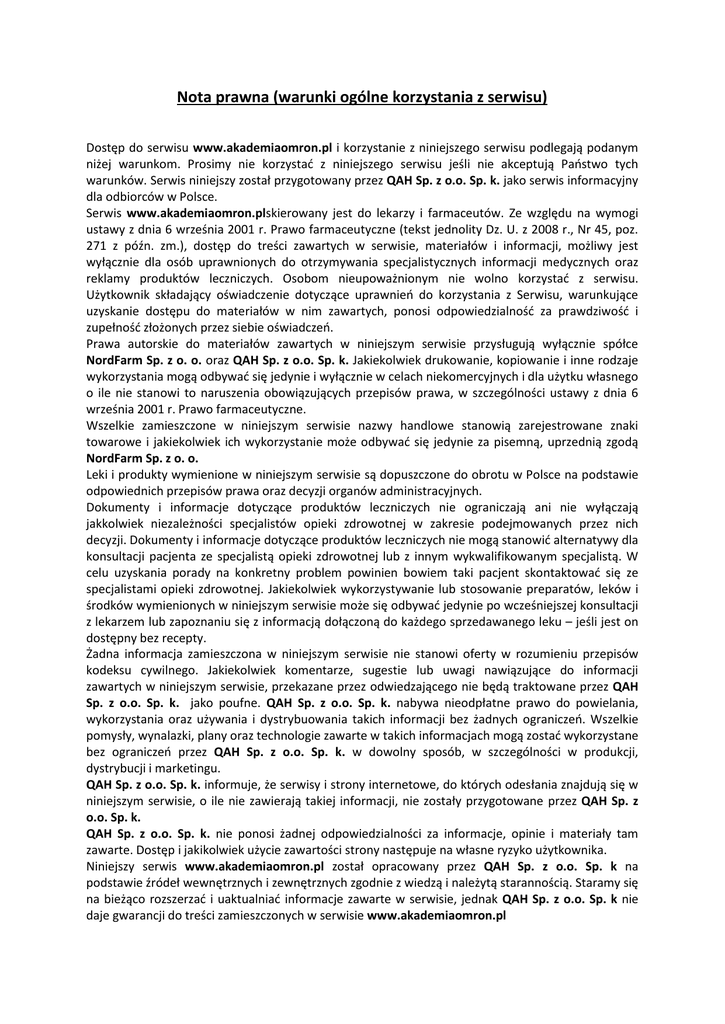 Nota prawna (warunki ogólne korzystania z serwisu) Dostęp do serwisu www.akademiaomron.pl i korzystanie z niniejszego serwisu podlegają podanym niżej warunkom. Prosimy nie korzystać z niniejszego serwisu jeśli nie akceptują Państwo tych warunków. Serwis niniejszy został przygotowany przez QAH Sp. z o.o. Sp. k. jako serwis informacyjny dla odbiorców w Polsce. Serwis www.akademiaomron.plskierowany jest do lekarzy i farmaceutów. Ze względu na wymogi ustawy z dnia 6 września 2001 r. Prawo farmaceutyczne (tekst jednolity Dz. U. z 2008 r., Nr 45, poz. 271 z późn. zm.), dostęp do treści zawartych w serwisie, materiałów i informacji, możliwy jest wyłącznie dla osób uprawnionych do otrzymywania specjalistycznych informacji medycznych oraz reklamy produktów leczniczych. Osobom nieupoważnionym nie wolno korzystać z serwisu. Użytkownik składający oświadczenie dotyczące uprawnień do korzystania z Serwisu, warunkujące uzyskanie dostępu do materiałów w nim zawartych, ponosi odpowiedzialność za prawdziwość i zupełność złożonych przez siebie oświadczeń. Prawa autorskie do materiałów zawartych w niniejszym serwisie przysługują wyłącznie spółce NordFarm Sp. z o. o. oraz QAH Sp. z o.o. Sp. k. Jakiekolwiek drukowanie, kopiowanie i inne rodzaje wykorzystania mogą odbywać się jedynie i wyłącznie w celach niekomercyjnych i dla użytku własnego o ile nie stanowi to naruszenia obowiązujących przepisów prawa, w szczególności ustawy z dnia 6 września 2001 r. Prawo farmaceutyczne. Wszelkie zamieszczone w niniejszym serwisie nazwy handlowe stanowią zarejestrowane znaki towarowe i jakiekolwiek ich wykorzystanie może odbywać się jedynie za pisemną, uprzednią zgodą NordFarm Sp. z o. o. Leki i produkty wymienione w niniejszym serwisie są dopuszczone do obrotu w Polsce na podstawie odpowiednich przepisów prawa oraz decyzji organów administracyjnych. Dokumenty i informacje dotyczące produktów leczniczych nie ograniczają ani nie wyłączają jakkolwiek niezależności specjalistów opieki zdrowotnej w zakresie podejmowanych przez nich decyzji. Dokumenty i informacje dotyczące produktów leczniczych nie mogą stanowić alternatywy dla konsultacji pacjenta ze specjalistą opieki zdrowotnej lub z innym wykwalifikowanym specjalistą. W celu uzyskania porady na konkretny problem powinien bowiem taki pacjent skontaktować się ze specjalistami opieki zdrowotnej. Jakiekolwiek wykorzystywanie lub stosowanie preparatów, leków i środków wymienionych w niniejszym serwisie może się odbywać jedynie po wcześniejszej konsultacji z lekarzem lub zapoznaniu się z informacją dołączoną do każdego sprzedawanego leku – jeśli jest on dostępny bez recepty. Żadna informacja zamieszczona w niniejszym serwisie nie stanowi oferty w rozumieniu przepisów kodeksu cywilnego. Jakiekolwiek komentarze, sugestie lub uwagi nawiązujące do informacji zawartych w niniejszym serwisie, przekazane przez odwiedzającego nie będą traktowane przez QAH Sp. z o.o. Sp. k. jako poufne. QAH Sp. z o.o. Sp. k. nabywa nieodpłatne prawo do powielania, wykorzystania oraz używania i dystrybuowania takich informacji bez żadnych ograniczeń. Wszelkie pomysły, wynalazki, plany oraz technologie zawarte w takich informacjach mogą zostać wykorzystane bez ograniczeń przez QAH Sp. z o.o. Sp. k. w dowolny sposób, w szczególności w produkcji, dystrybucji i marketingu. QAH Sp. z o.o. Sp. k. informuje, że serwisy i strony internetowe, do których odesłania znajdują się w niniejszym serwisie, o ile nie zawierają takiej informacji, nie zostały przygotowane przez QAH Sp. z o.o. Sp. k. QAH Sp. z o.o. Sp. k. nie ponosi żadnej odpowiedzialności za informacje, opinie i materiały tam zawarte. Dostęp i jakikolwiek użycie zawartości strony następuje na własne ryzyko użytkownika. Niniejszy serwis www.akademiaomron.pl został opracowany przez QAH Sp. z o.o. Sp. k na podstawie źródeł wewnętrznych i zewnętrznych zgodnie z wiedzą i należytą starannością. Staramy się na bieżąco rozszerzać i uaktualniać informacje zawarte w serwisie, jednak QAH Sp. z o.o. Sp. k nie daje gwarancji do treści zamieszczonych w serwisie www.akademiaomron.pl QAH Sp. z o.o. Sp. k. nie ponosi odpowiedzialności za następstwa korzystania z serwisu ani za jej zawartość. W szczególności QAH Sp. z o.o. Sp. k. nie odpowiada za ścisłość, kompletność, adekwatność, terminowość ani zakres informacji zawartych w niniejszym serwisie. QAH Sp. z o.o. Sp. k. zastrzega sobie prawo do wprowadzania dowolnych zmian w treści niniejszej strony internetowej w dowolnym momencie, z dowolnego powodu oraz bez uprzedniego zawiadomienia i nie ponoszą odpowiedzialności za żadne skutki ich wprowadzenia. QAH Sp. z o.o. Sp. k. nie ponosi jakiejkolwiek odpowiedzialności za bezpośrednie, pośrednie, przypadkowe, celowe lub wynikowe szkody, straty, ubytki i inne wypadki spowodowane przez Państwa w wyniku działań związanych z dostępem, użyciem lub pobieraniem materiałów z serwisu i ich dalszą eksploatacją. W szczególności nie ponoszą odpowiedzialności za szkody powstałe wskutek przerwy w dostępie do sieci i serwisu www.akademiaomron.pl, błędów systemu komputerowego spowodowanych z przyczyn niezależnych. QAH Sp. z o.o. Sp. k. przechowuje i przetwarza wszelkie przekazane przez Państwa informacje z zachowaniem odpowiednich środków bezpieczeństwa, spełniających wymagania polskiego prawa. QAH Sp. z o.o. Sp. k. szanuje prywatność osób odwiedzających naszą stronę i gromadzi dane osobowe, takie jak imię i nazwisko, adres, numer telefonu i adres e-mail użytkownika, numer PWZ wyłącznie od osób, które dobrowolnie podają je do naszej wiadomości. Dane osobowe, podane przez użytkownika serwisu, po wyrażeniu przez niego zgody, mogą być przetwarzane dla celów realizacji i koordynacji projektów realizowanych przez administratora danych osobowych, którym jest QAH Sp. z o.o.