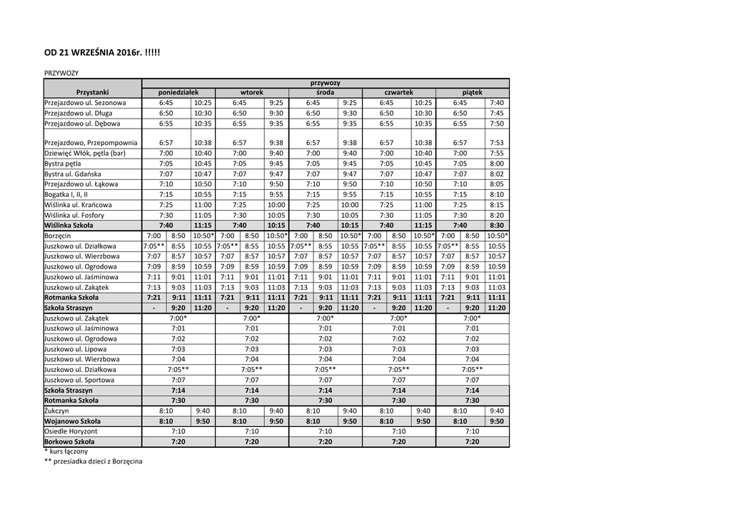 OD 21 WRZEŚNIA 2016r. !!!!! PRZYWOZY Przystanki Przejazdowo ul. Sezonowa Przejazdowo ul. Długa Przejazdowo ul. Dębowa poniedziałek 6:45 10:25 6:50 10:30 6:55 10:35 Przejazdowo, Przepompownia 6:57 Dziewięć Włók, pętla (bar) 7:00 Bystra pętla 7:05 Bystra ul. Gdańska 7:07 Przejazdowo ul. Łąkowa 7:10 Bogatka I, II, II 7:15 Wiślinka ul. Krańcowa 7:25 Wiślinka ul. Fosfory 7:30 Wiślinka Szkoła 7:40 Borzęcin 7:00 8:50 Juszkowo ul. Działkowa 7:05** 8:55 Juszkowo ul. Wierzbowa 7:07 8:57 Juszkowo ul. Ogrodowa 7:09 8:59 Juszkowo ul. Jaśminowa 7:11 9:01 Juszkowo ul. Zakątek 7:13 9:03 Rotmanka Szkoła 7:21 9:11 Szkoła Straszyn 9:20 Juszkowo ul. Zakątek 7:00* Juszkowo ul. Jaśminowa 7:01 Juszkowo ul. Ogrodowa 7:02 Juszkowo ul. Lipowa 7:03 Juszkowo ul. Wierzbowa 7:04 Juszkowo ul. Działkowa 7:05** Juszkowo ul. Sportowa 7:07 Szkoła Straszyn 7:14 Rotmanka Szkoła 7:30 Żukczyn 8:10 Wojanowo Szkoła 8:10 Osiedle Horyzont 7:10 Borkowo Szkoła 7:20 * kurs łączony ** przesiadka dzieci z Borzęcina wtorek 6:45 9:25 6:50 9:30 6:55 9:35 10:38 6:57 10:40 7:00 10:45 7:05 10:47 7:07 10:50 7:10 10:55 7:15 11:00 7:25 11:05 7:30 11:15 7:40 10:50* 7:00 8:50 10:55 7:05** 8:55 10:57 7:07 8:57 10:59 7:09 8:59 11:01 7:11 9:01 11:03 7:13 9:03 11:11 7:21 9:11 11:20 9:20 7:00* 7:01 7:02 7:03 7:04 7:05** 7:07 7:14 7:30 9:40 8:10 9:50 8:10 7:10 7:20 przywozy środa 6:45 9:25 6:50 9:30 6:55 9:35 9:38 6:57 9:40 7:00 9:45 7:05 9:47 7:07 9:50 7:10 9:55 7:15 10:00 7:25 10:05 7:30 10:15 7:40 10:50* 7:00 8:50 10:55 7:05** 8:55 10:57 7:07 8:57 10:59 7:09 8:59 11:01 7:11 9:01 11:03 7:13 9:03 11:11 7:21 9:11 11:20 9:20 7:00* 7:01 7:02 7:03 7:04 7:05** 7:07 7:14 7:30 9:40 8:10 9:50 8:10 7:10 7:20 czwartek 6:45 10:25 6:50 10:30 6:55 10:35 9:38 6:57 9:40 7:00 9:45 7:05 9:47 7:07 9:50 7:10 9:55 7:15 10:00 7:25 10:05 7:30 10:15 7:40 10:50* 7:00 8:50 10:55 7:05** 8:55 10:57 7:07 8:57 10:59 7:09 8:59 11:01 7:11 9:01 11:03 7:13 9:03 11:11 7:21 9:11 11:20 9:20 7:00* 7:01 7:02 7:03 7:04 7:05** 7:07 7:14 7:30 9:40 8:10 9:50 8:10 7:10 7:20 piątek 6:45 6:50 6:55 10:38 6:57 10:40 7:00 10:45 7:05 10:47 7:07 10:50 7:10 10:55 7:15 11:00 7:25 11:05 7:30 11:15 7:40 10:50* 7:00 8:50 10:55 7:05** 8:55 10:57 7:07 8:57 10:59 7:09 8:59 11:01 7:11 9:01 11:03 7:13 9:03 11:11 7:21 9:11 11:20 9:20 7:00* 7:01 7:02 7:03 7:04 7:05** 7:07 7:14 7:30 9:40 8:10 9:50 8:10 7:10 7:20 7:40 7:45 7:50 7:53 7:55 8:00 8:02 8:05 8:10 8:15 8:20 8:30 10:50* 10:55 10:57 10:59 11:01 11:03 11:11 11:20 9:40 9:50 Arkusz2 Rozkład jazdy dla dowozów szkolnych „zamkniętych” na rok szkolny 2016/2017 i 2017/2018 ODWOZY odwozy Przystanki poniedziałek wtorek środa Wiślinka Szkoła 13:20 15:50 12:30 14:10 15:50 13:20 Wiślinka ul. Fosfory 13:30 16:00 12:40 14:20 16:00 13:30 Wiślinka ul. Krańcowa 13:35 16:05 12:45 14:25 16:05 13:35 Bogatka I II III 13:40 16:10 12:50 14:30 16:10 13:40 Przejazdowo ul. Łąkowa 13:45 16:15 12:55 14:35 16:15 13:45 Bystra ul. Gdańska 13:48 16:18 12:58 14:38 16:18 13:48 Bystra pętla 13:50 16:20 13:00 14:40 16:20 13:50 Dziewięć Włók 13:55 16;25 13:05 14:45 16;25 13:55 Przejazdowo, Przepompownia 13:57 16:27 13:07 14:47 16:27 13:57 Przejazdowo ul. Dębowa 14:00 16:30 13:10 14:50 16:30 14:00 Przejazdowo ul. Długa 14:05 16:35 13:15 14:55 16:35 14:05 Straszyn Szkoła 12:20* 14:20* 17:00* 12:20* 14:20* 17:00* 12:20* 14:20* Rotmanka Szkoła 12:40* 14:35 17:10* 12:40* 14:35 17:10* 12:40* 14:35 Juszkowo ul. Zakątek 12:48 14:43 17:18 12:48 14:43 17:18 12:48 14:43 Juszkowo ul. Jaśminowa 12:50 14:45 17:19 12:50 14:45 17:19 12:50 14:45 Juszkowo ul. Ogrodowa 12:51 14:46 17:20 12:51 14:46 17:20 12:51 14:46 Juszkowo ul. Lipowa 12:52 14:47 17:21 12:52 14:47 17:21 12:52 14:47 Juszkowo ul. Wierzbowa 12:53 14:48 17:22 12:53 14:48 17:22 12:53 14:48 Juszkowo ul. Działkowa 12:55 14:50 17:23 12:55 14:50 17:23 12:55 14:50 Borzęcin 13:00 14:55 17:28 13:00 14:55 17:28 13:00 14:55 Wojanowo Szkoła 13:30 16:20 13:30 16:20 13:30 Żukczyn 13:40 16:30 13:40 16:30 13:40 Borkowo Szkoła 16:35 16:35 16:35 Nowy Horyzont 16:45 16:45 16:45 * kurs łączony (szkoła Straszyn i szkoła Rotmanka) Strona 2 czwartek piątek 15:00 12:30 14:10 15:50 12:30 15:10 12:40 14:20 16:00 12:40 15:15 12:45 14:25 16:05 12:45 15:20 12:50 14:30 16:10 12:50 15:25 12:55 14:35 16:15 12:55 15:28 12:58 14:38 16:18 12:58 15:30 13:00 14:40 16:20 13:00 15:35 13:05 14:45 16;25 13:05 15:37 13:07 14:47 16:27 13:07 15:40 13:10 14:50 16:30 13:10 15:45 13:15 14:55 16:35 13:15 17:00* 12:20* 14:20* 17:00* 12:20* 14:20* 17:10* 12:40* 14:35 17:10* 12:40* 14:35 17:18 12:48 14:43 17:18 12:48 14:43 17:19 12:50 14:45 17:19 12:50 14:45 17:20 12:51 14:46 17:20 12:51 14:46 17:21 12:52 14:47 17:21 12:52 14:47 17:22 12:53 14:48 17:22 12:53 14:48 17:23 12:55 14:50 17:23 12:55 14:50 17:28 13:00 14:55 17:28 13:00 14:55 16:20 13:30 16:20 13:30 16:30 13:40 16:30 13:40 16:35 16:35 16:45 16:45 13:20 13:30 13:35 13:40 13:45 13:48 13:50 13:55 13:57 14:00 14:05 17:00* 17:10* 17:18 17:19 17:20 17:21 17:22 17:23 17:28 15:10 15:20