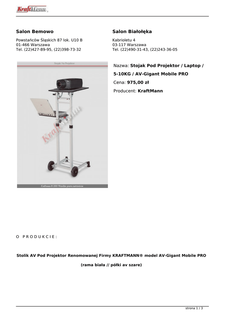 Salon Bemowo Salon Białołęka Powstańców Śląskich 87 lok. U10 B 01-466 Warszawa Tel. (22)427-89-95, (22)398-73-32 Kabrioletu 4 03-117 Warszawa Tel. (22)490-31-43, (22)243-36-05 Nazwa: Stojak Pod Projektor / Laptop / 5-10KG / AV-Gigant Mobile PRO Cena: 975,00 zł Producent: KraftMann O PRODUKCIE: Stolik AV Pod Projektor Renomowanej Firmy KRAFTMANN® model AV-Gigant Mobile PRO (rama biała // półki av szare) strona 1 / 3 Mega-stolik Audio-Video to najwyższy model w kategorii profesjonalnego sprzętu AV tego typu. Mebel ten produkowany jest standardowo wraz ze wszystkimi możliwymi półeczkami, uchwytami oraz mechanizmami regulacyjnymi, przez co w tyle pozostawia konkurencję oraz niesłychanie ułatwia prowadzenie prezentacji. Dzięki opatentowanym rozwiązaniom mechanicznym bardzo latwo sie sklada i zajmuje niezwykle malo miejsca. Specjalne zabezpieczenia zapewniają stabilne ustawienie. Oferowany stojak jest idealnym rozwiązaniem dla prezentacji danych w różnych pomieszczeniach. Możliwość jednoczesnego zamocowania projektora oraz laptopa, itp. o dowolnych rozmiarach, maksymalne obciążenie: 15 kg. W celu podniesienia stabilności oraz mobilności całość stoi na podstawie składającej się ze stalowego stelaża z opcją poziomowania. Produkt znakomicie sprawdza się w miejscach, gdzie wymagana jest mobilność narzędzi prezentacji. .: WYMIAR O W A N I E : . Od podstawy do górnej platformy: * Płynna regulacja od 85 do 125 cm ; ** Wymiar półki AV: 42 x 35 cm ; Wytrzymałość: do 10 kg. Od podstawy do dolnej platformy: * Płynna regulacja od 73 do 113 cm ; ** Wymiar półki AV: 36 x 24 cm ; Wytrzymałość: do 5 kg. Mała waga netto => jedynie 13 kg Możliwość płynnej zmiany wysokości półek Możliwość przewożenia drobnych przedmiotów Dolna półka z możliwościa obrotu w osi pionowej Pneumatyczny system regulacji wysokości blatów Super mobilny dzięki dwum dużym kółkom o średnicy 125 mm .: 3 - YEAR GUARANTEE :. .: ELEGANCKI DESIGN + X-TRA REGULACJE :. .: SUPER MOBILNY I MEGA POJEMNY :. <KOŁA O ŚREDNICY 12.5 CM> .: EASY INSTALL SYSTEM + WBUDOWANA PNEUMATYKA :. . : Z a s t o s o w a n i E : . Sale konferencyjne Laboratoria i szpitale Szkoły i placówki edukacyjne Targi i wystawy międzynarodowe Promocje produktów i ich reklama Domy mieszkalne oraz domy kultury strona 2 / 3 strona 3 / 3 Powered by TCPDF (www.tcpdf.org)