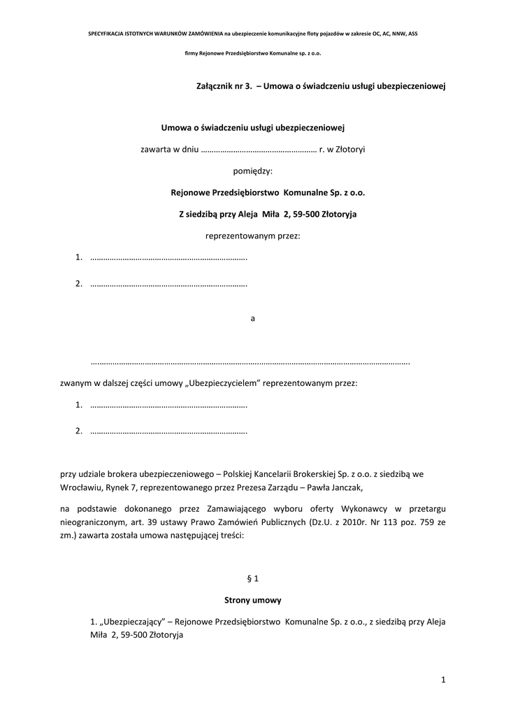 SPECYFIKACJA ISTOTNYCH WARUNKÓW ZAMÓWIENIA na ubezpieczenie komunikacyjne floty pojazdów w zakresie OC, AC, NNW, ASS firmy Rejonowe Przedsiębiorstwo Komunalne sp. z o.o. Załącznik nr 3. – Umowa o świadczeniu usługi ubezpieczeniowej Umowa o świadczeniu usługi ubezpieczeniowej zawarta w dniu ……………………………………………… r. w Złotoryi pomiędzy: Rejonowe Przedsiębiorstwo Komunalne Sp. z o.o. Z siedzibą przy Aleja Miła 2, 59-500 Złotoryja reprezentowanym przez: 1. ………………………………………………………………. 2. ………………………………………………………………. a ….…………………………………………………………….….……………………………………………………………. zwanym w dalszej części umowy „Ubezpieczycielem” reprezentowanym przez: 1. ………………………………………………………………. 2. ………………………………………………………………. przy udziale brokera ubezpieczeniowego – Polskiej Kancelarii Brokerskiej Sp. z o.o. z siedzibą we Wrocławiu, Rynek 7, reprezentowanego przez Prezesa Zarządu – Pawła Janczak, na podstawie dokonanego przez Zamawiającego wyboru oferty Wykonawcy w przetargu nieograniczonym, art. 39 ustawy Prawo Zamówień Publicznych (Dz.U. z 2010r. Nr 113 poz. 759 ze zm.) zawarta została umowa następującej treści: §1 Strony umowy 1. „Ubezpieczający” – Rejonowe Przedsiębiorstwo Komunalne Sp. z o.o., z siedzibą przy Aleja Miła 2, 59-500 Złotoryja 1 SPECYFIKACJA ISTOTNYCH WARUNKÓW ZAMÓWIENIA na ubezpieczenie komunikacyjne floty pojazdów w zakresie OC, AC, NNW, ASS firmy Rejonowe Przedsiębiorstwo Komunalne sp. z o.o. 2. „Ubezpieczony” – Rejonowe Przedsiębiorstwo Komunalne Sp. z o.o., z siedzibą przy Aleja Miła 2, 59-500 Złotoryja lub podmiot oddający w użytkowanie/leasing pojazdy wobec których na Rejonowym Przedsiębiorstwie Komunalnym Sp. z o.o. ciąży obowiązek zawarcia ubezpieczenia. 3. „Ubezpieczyciel” – ………………………………………………………………………………………………………………………… §2 Przedmiot umowy 1. Przedmiotem zamówienia jest: ubezpieczenie komunikacyjne floty pojazdów podlegających rejestracji w Rzeczpospolitej Polskiej będących własnością lub w użytkowaniu firmy Rejonowe Przedsiębiorstwo Komunalne sp. z o.o. w zakresie: 1) 2) 3) 4) Odpowiedzialności cywilnej posiadacza pojazdy mechanicznego (OC i Zielona Karta) Auto –casco (AC+KR) Następstw nieszczęśliwych wypadków kierowcy i/lub pasażerów (NNW) Assistance (ASS) na okres 12 miesięcy, w terminie od 01.01.2012 r. do 31.12.2012 r. Umowa będzie zawarta okres 12 miesięcy od 01.01.2012r. do 31.12.2012 r. obejmując ubezpieczeniem pojazdy wchodzące do ubezpieczenia w tym okresie na okresy roczne zgodnie z okresami ubezpieczenia w załączniku 4 do SIWZ (postanowienia zwarte w umowie dotyczą wszystkich polis zawartych w okresie jej obowiązywania). 2. Wszelkie postanowienia niniejszej Umowy o świadczeniu usługi ubezpieczeniowej mają pierwszeństwo przed postanowieniami Ogólnych i Szczegółowych Warunków Ubezpieczenia. 3. Wykaz pojazdów przyjętych do ubezpieczenia stanowi Załącznik nr 4 do umowy. §3 Cena i warunki płatności 1. Wartość umowy wynosi: …………………………………………. 2. Wartość umowy do końca jej trwania nie podlega indeksacji. 3. Poszczególne polisy wraz z potwierdzeniem zawarcia umowy ubezpieczenia zostaną zawarte na dany pojazd z okresem ubezpieczenia na 12 miesięcy, zgodnie z terminem ubezpieczenia dla każdego pojazdu wynikającym z Załącznika nr 4 do umowy. 4. Polisa wystawiona musi zawierać nr rachunku bankowego na który winna zostać przekazana składka ubezpieczeniowa przez Ubezpieczonego. 2 SPECYFIKACJA ISTOTNYCH WARUNKÓW ZAMÓWIENIA na ubezpieczenie komunikacyjne floty pojazdów w zakresie OC, AC, NNW, ASS firmy Rejonowe Przedsiębiorstwo Komunalne sp. z o.o. 5. Składka płatna jest w dwóch równych ratach w terminach: 17.01.2012 r. oraz 02.07.2012 r. 6. W przypadku zapłaty należności w formie przelewu bankowego, Strony ustalają jako datę zapłaty przez Ubezpieczonego datę obciążenia rachunku bankowego Ubezpieczającego. 7. Należności wynikające z niniejszej umowy w tym odszkodowawcze i odsetkowe nie mogą być przedmiotem obrotu (cesja, sprzedaż), zgodnie z art. 509 KC, bez pisemnej zgody Ubezpieczonego. 8. Ubezpieczyciel odstąpi przy wystawianiu polis od stosowania tzn. składki minimalnej z tytułu zawarcia umowy ubezpieczenia. 9. Ubezpieczony nie wyraża zgody na obrót wierzytelnościami wynikającymi z niniejszej umowy oraz polis zawartych w skutek niniejszej umowy. §4 Zakres ochrony ubezpieczeniowej 1. Umowy ubezpieczenia zawierane będą w zakresie: a. obowiązkowego ubezpieczenia odpowiedzialności cywilnej posiadaczy pojazdów mechanicznych za szkody powstałe w związku z ruchem tych pojazdów (OC i „Zielona Karta”), b. ubezpieczenia pojazdów autocasco (AC+KR) c. ubezpieczenie następstw nieszczęśliwych wypadków kierowców i pasażerów (NNW). d. ubezpieczenia komunikacyjnego Assistance, 2. Do umów ubezpieczenia zawieranych w ramach niniejszej umowy mają zastosowanie: 1) Ustawa o ubezpieczeniach obowiązkowych, Ubezpieczeniowym Funduszu Gwarancyjnym i Polskim Biurze Ubezpieczycieli Komunikacyjnych z dnia 22 maja 2003 roku (Dz. U. nr 124 poz.1152 z 2003r. z późniejszymi zmianami) oraz z uwzględnieniem postanowień zawartych w niniejszej umowie. 2) Ogólne Warunki Ubezpieczenia odpowiedzialności cywilnej posiadaczy pojazdów mechanicznych w ruchu zagranicznym. 3) Ogólne Warunki Ubezpieczenia Pojazdów Mechanicznych od utraty, zniszczenia lub uszkodzenia (AUTOCASCO) z uwzględnieniem następujących postanowień: a. ubezpieczenie Autocasco w zakresie pełnym: casco + kradzież obejmujące szkody pows
