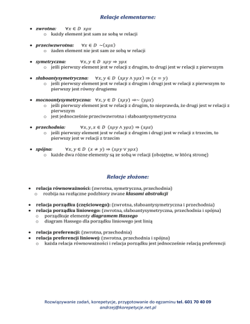 Relacje elementarne: zwrotna: ∀ ∈ o każdy element jest sam ze sobą w relacji ) przeciwzwrotna: ∀ ∈ ~( o żaden element nie jest sam ze sobą w relacji symetryczna: ∀ , ∈ ⇒ o jeśli pierwszy element jest w relacji z drugim, to drugi jest w relacji z pierwszym )⇒( = ) słaboantysymetryczna: ∀ , ∈ ( ∧ o jeśli pierwszy element jest w relacji z drugim i drugi jest w relacji z pierwszym to pierwszy jest równy drugiemu mocnoantysymetryczna: ∀ , ∈ ( ) ⇒∼ ( ) o jeśli pierwszy element jest w relacji z drugim, to nieprawda, że drugi jest w relacji z pierwszym o jest jednocześnie przeciwzwrotna i słaboantysymetryczna )⇒( przechodnia: ∀ , , ∈ ( ∧ ) o jeśli pierwszy element jest w relacji z drugim i drugi jest w relacji z trzecim, to pierwszy jest w relacji z trzecim spójna: ∀ , ∈ ( ≠ )⇒( ∨ ) o każde dwa różne elementy są ze sobą w relacji (obojętne, w którą stronę) Relacje złożone: relacja równoważności: (zwrotna, symetryczna, przechodnia) o rozbija na rozłączne podzbiory zwane klasami abstrakcji relacja porządku (częściowego): (zwrotna, słaboantysymetryczna i przechodnia) relacja porządku liniowego: (zwrotna, słaboantysymetryczna, przechodnia i spójna) o porządkuje elementy diagramem Hassego o diagram Hassego dla porządku liniowego jest linią relacja preferencji: (zwrotna, przechodnia) relacja preferencji liniowej: (zwrotna, przechodnia i spójna) o każda relacja równoważności i relacja porządku jest jednocześnie relacją preferencji Rozwiązywanie zadań, korepetycje, przygotowanie do egzaminu tel. 601 70 40 09 [email protected]